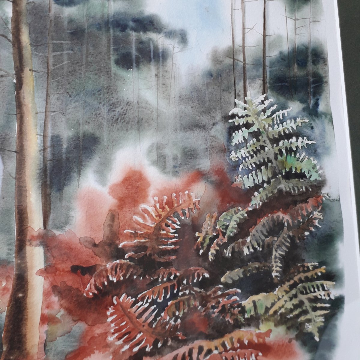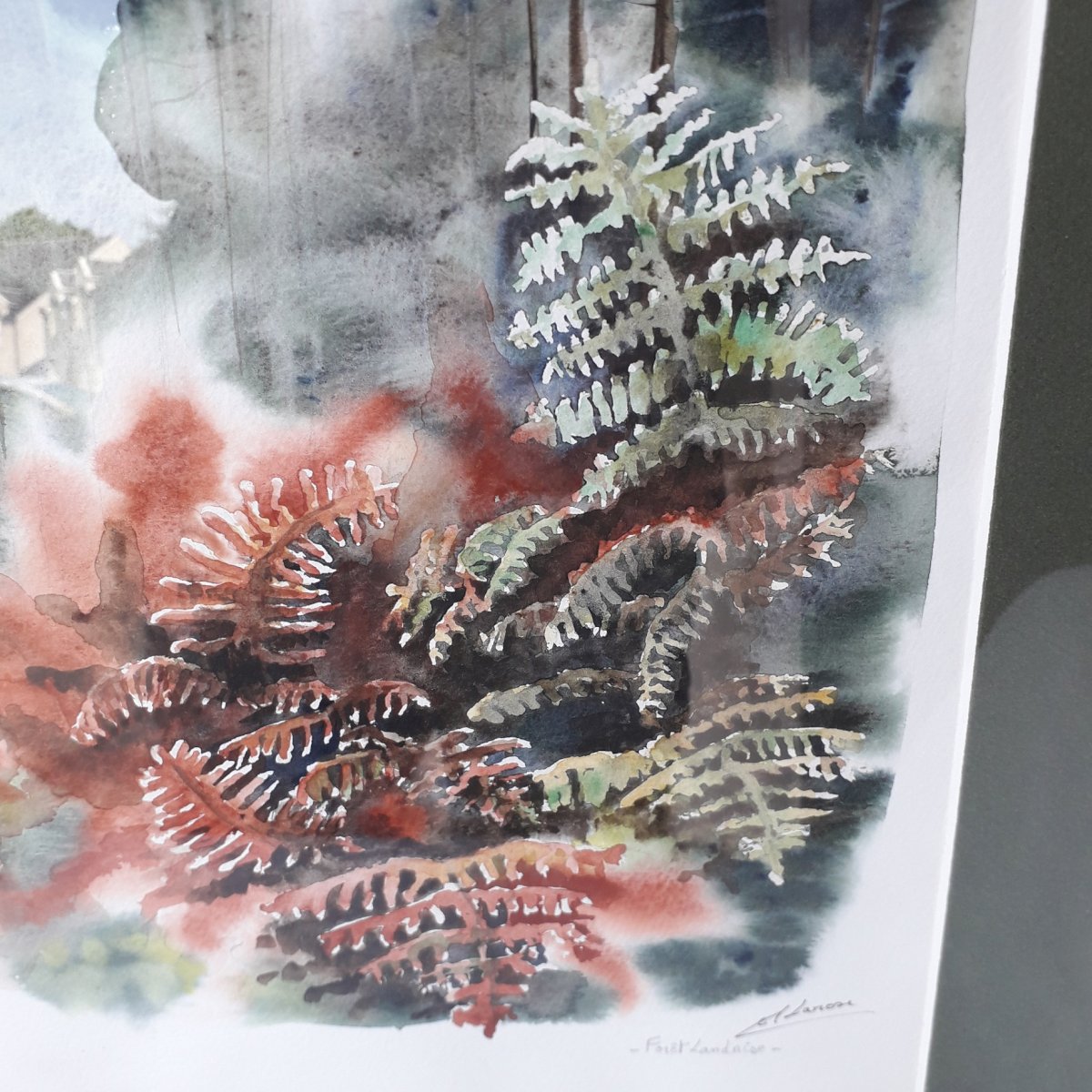 Tableau contemporain aquarelle, intitulé "Forêt Landaise", signé A. Larose (Anne Larose).