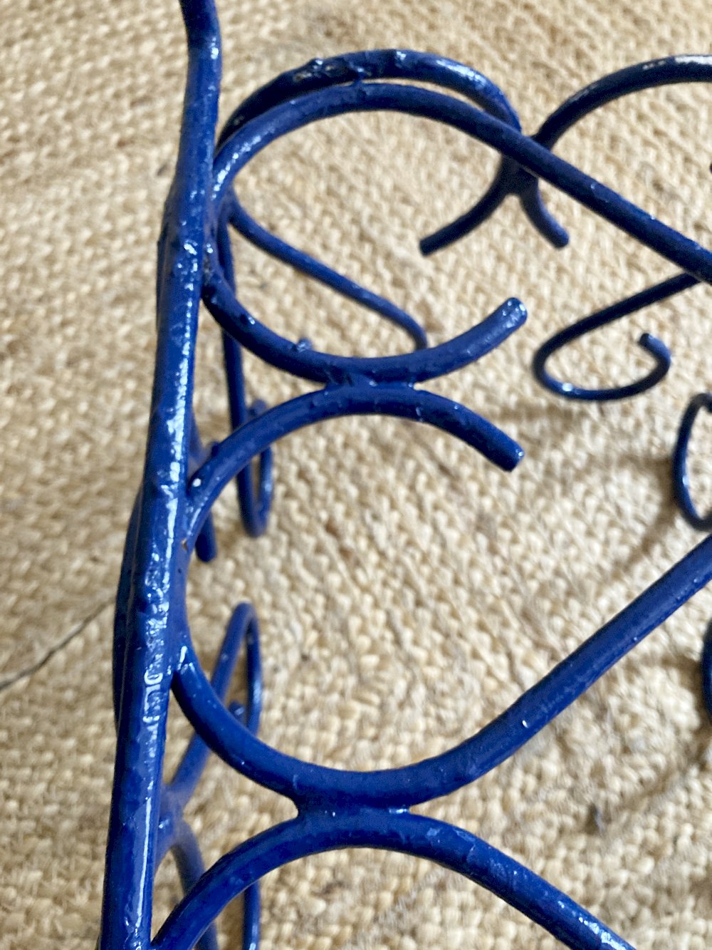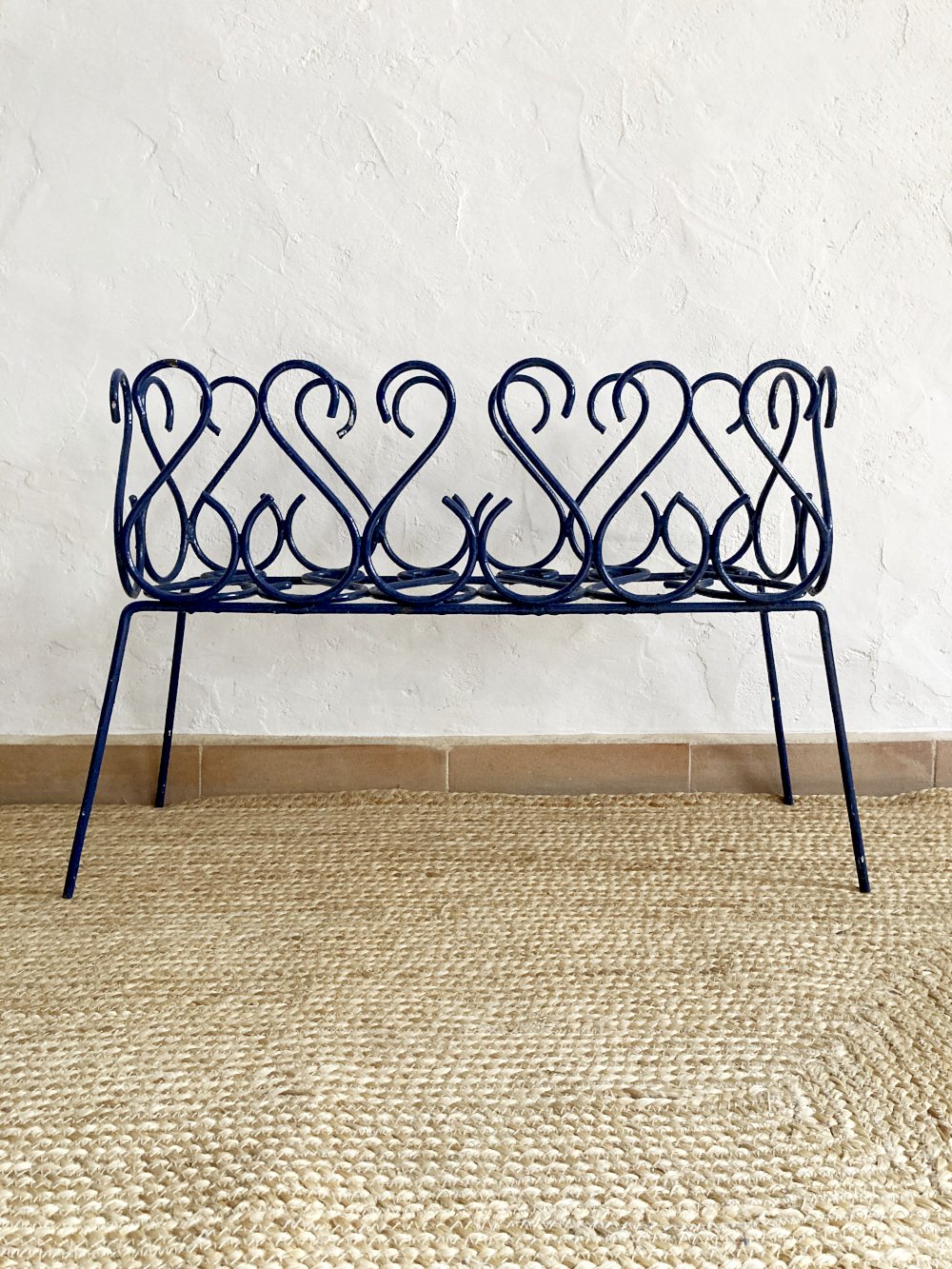 Charmant duo de jardinières en fer forgé peint en bleu cobalt. Années 1960. Bac formant une frise d'arabesques monté sur quatre pieds droits. A la fois élégantes et simples, ces jardinières apportent une belle touche décorative sur un balcon comme devant une belle façade maison (on rêve à la Provence, à ses pieds de lavande, au chant des cigales...). Quelques traces du temps, petits éclats de peinture et ponctuation ci et là de taches de peinture blanche, coulures de peinture bleue sur le dessous... L'état général est tout de même excellent.