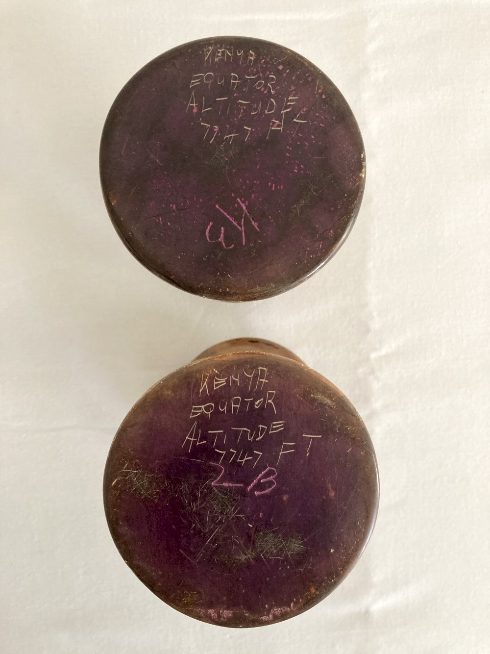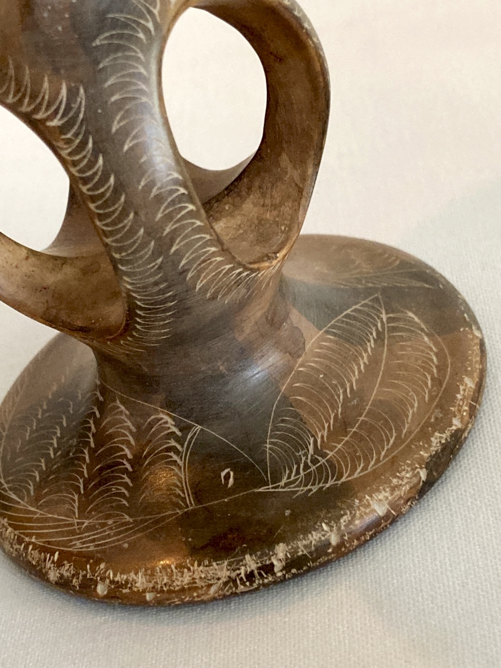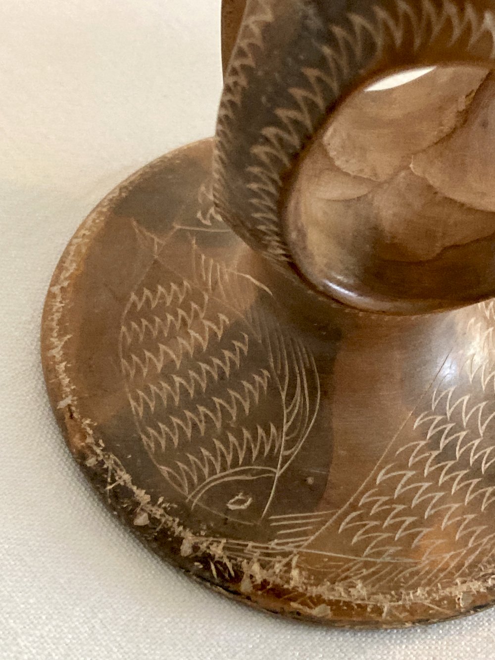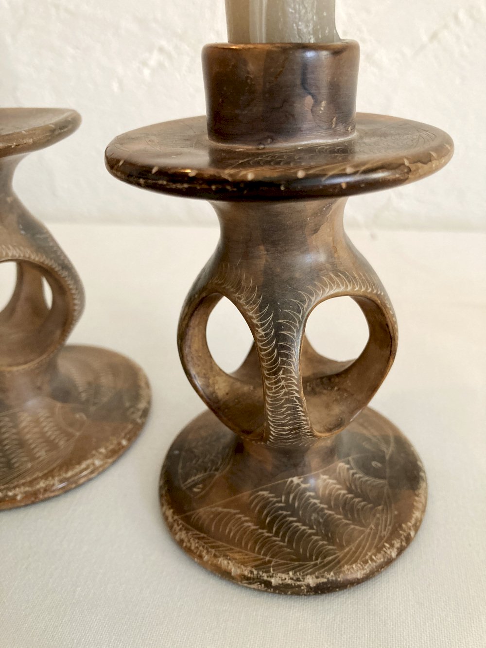 Paire de bougeoirs en pierre de stéatite sculptée. Façonnés à la main par un artisan kényan, années 1980. Le corps du bougeoirs est astucieusement ajouré, permettant une prise facile pour le déplacer ou le transporter. Ils sont gravés de motifs représentant des poissons et des feuilles. Signés au revers : "Kenya / Equator / Altitude 7747 FT. Légères égratignures sur le pourtour inférieur. Sinon, en très bon état, ni fêle, ni ébréchure.
