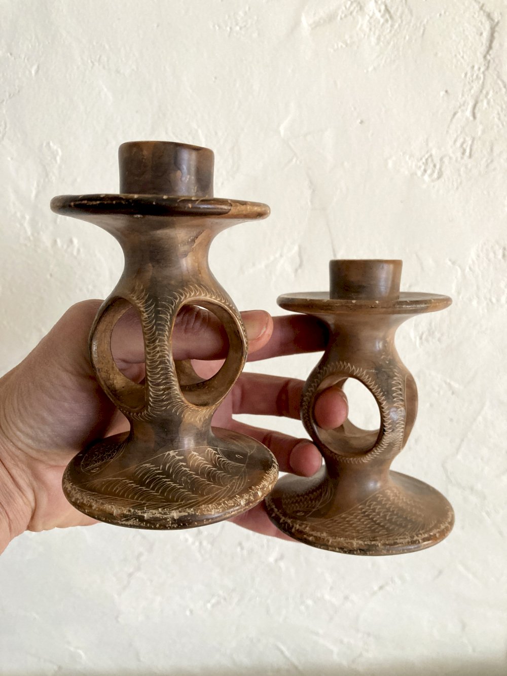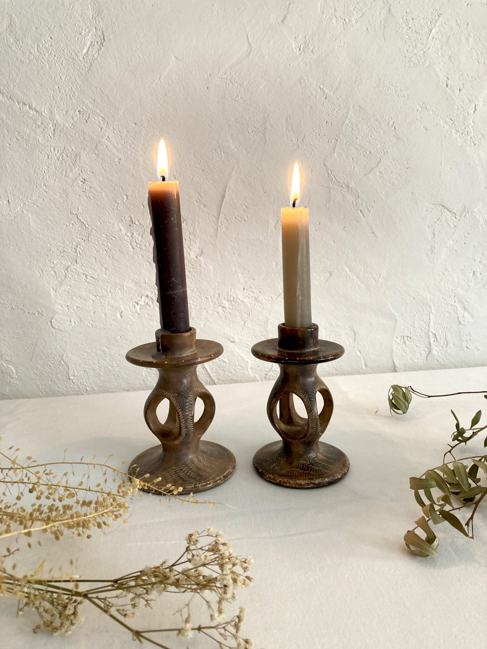 Pair of carved wooden candlesticks with vintage spiral design from the 80s-90s.