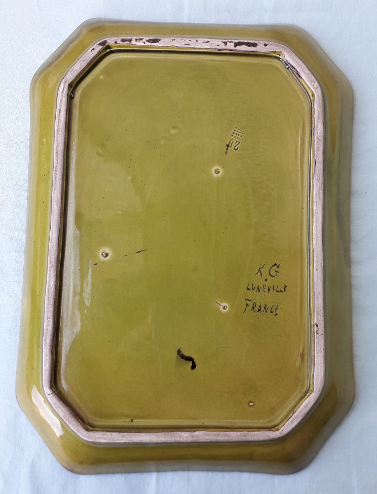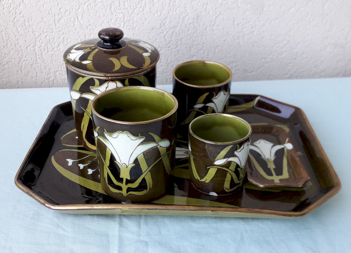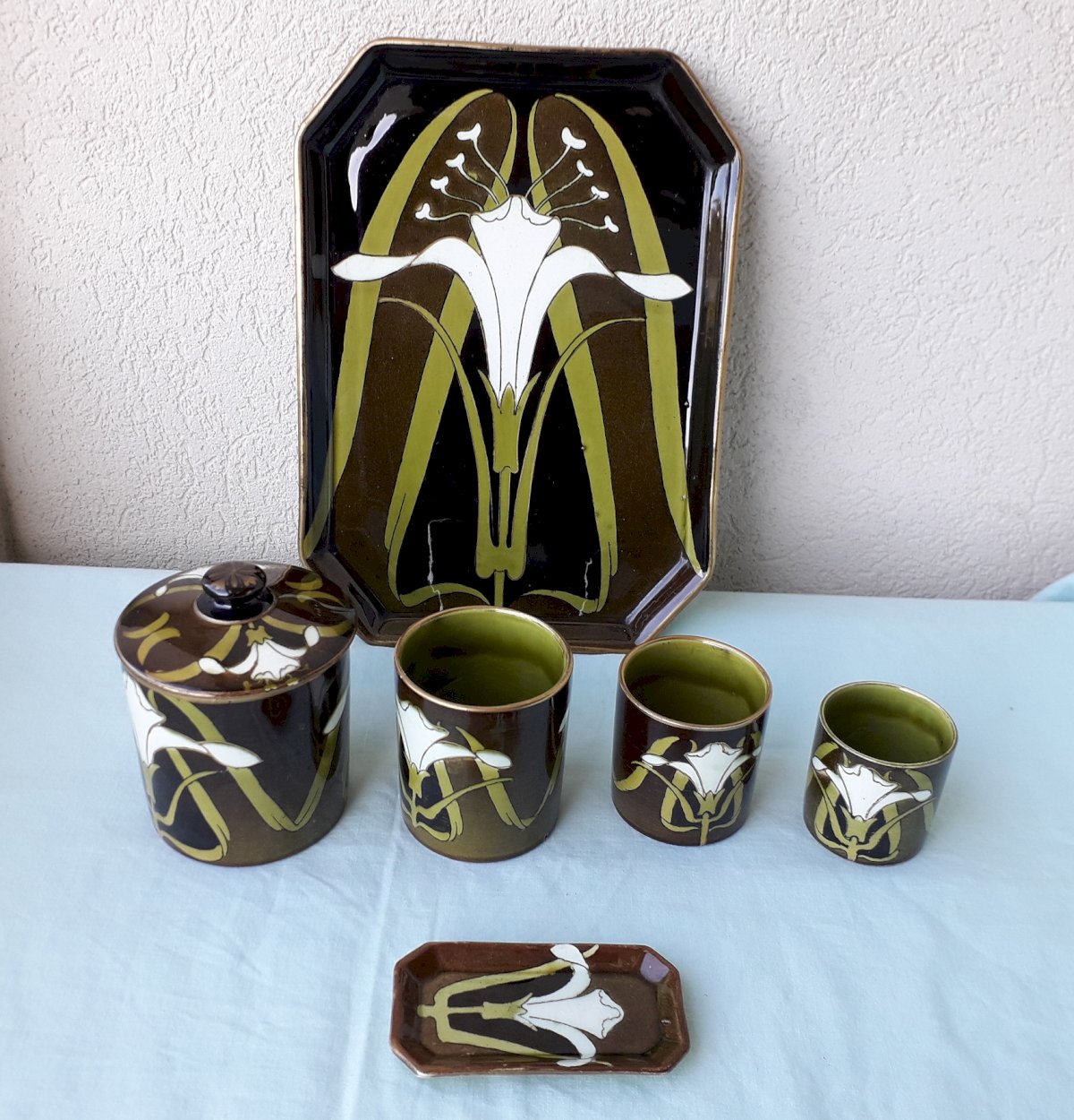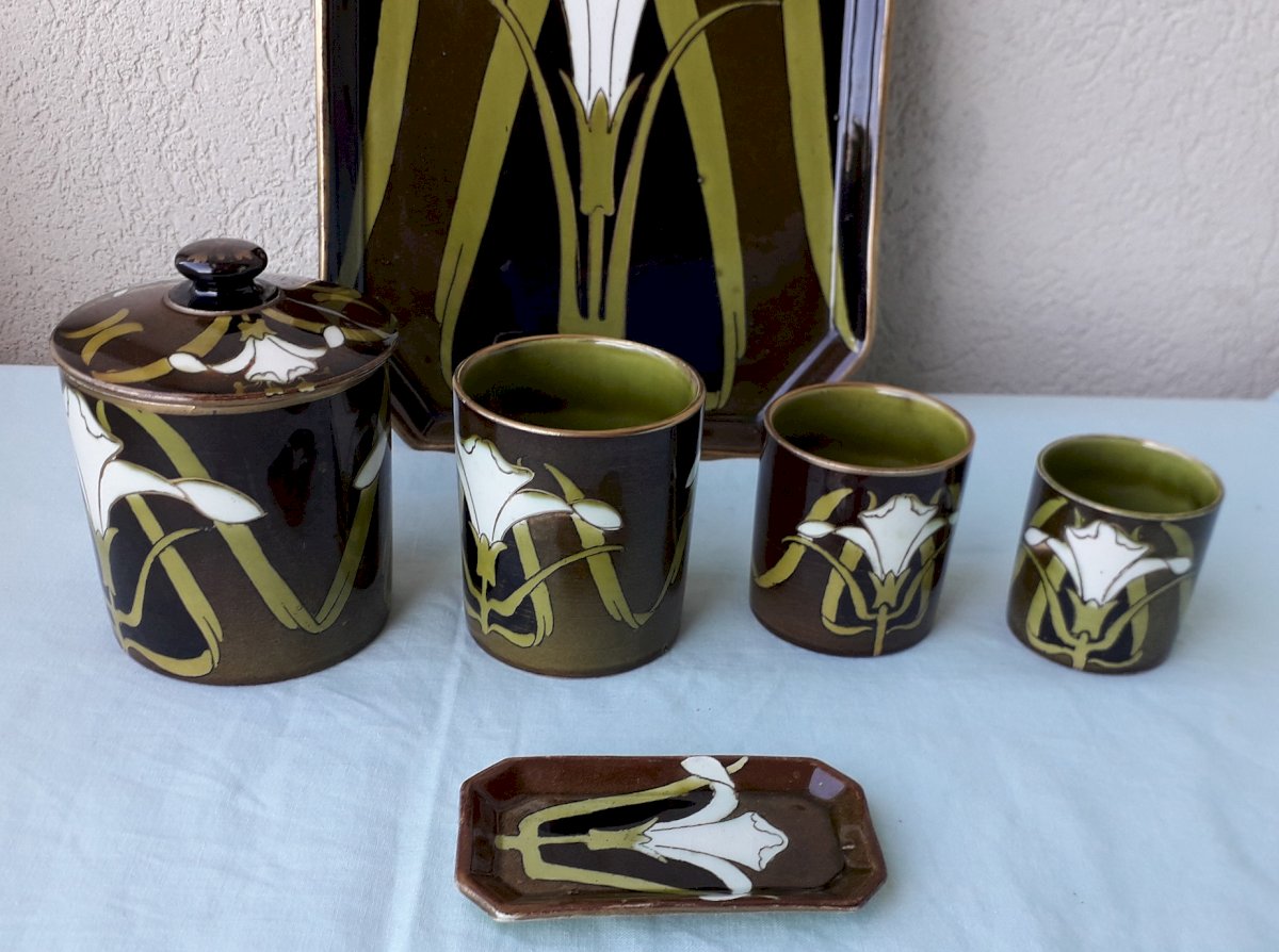Nécessaire de fumeur en faïence de Lunéville à décor de fleurs blanches sur fond vert, comprenant un plateau, quatre pots de différentes tailles (dont le plus petit est un pyrogène), un petit cendrier ou repose pipe, signature en dessous "K G Lunéville".