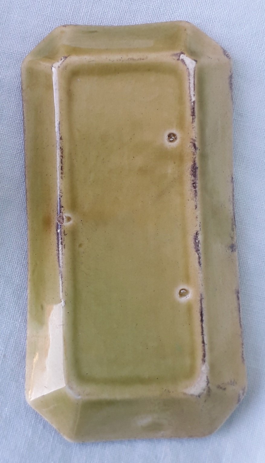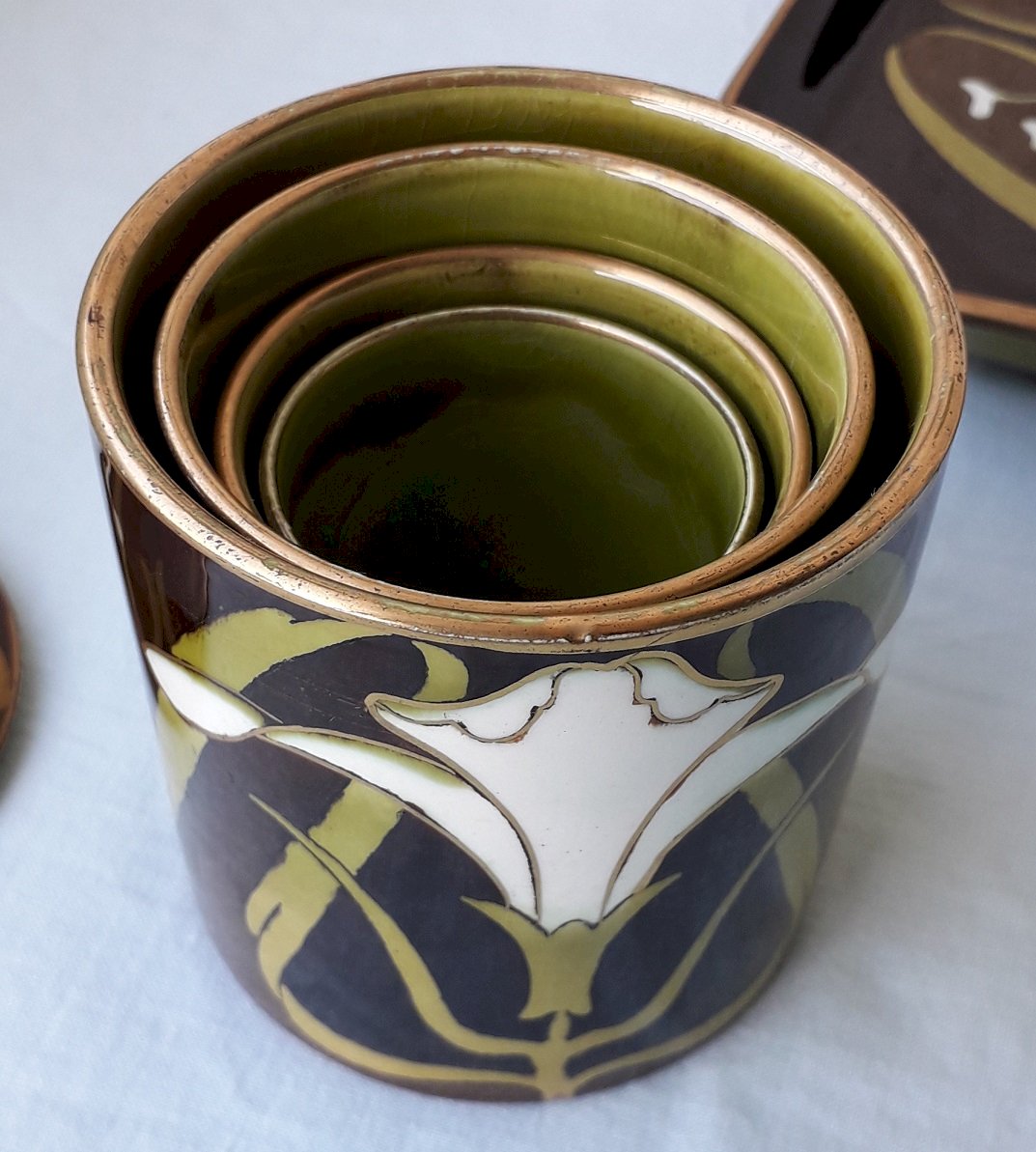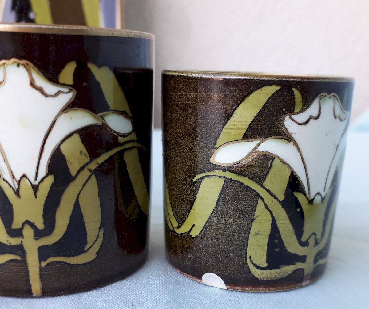 Nécessaire de fumeur en faïence de Lunéville à décor de fleurs blanches sur fond vert, comprenant un plateau, quatre pots de différentes tailles (dont le plus petit est un pyrogène), un petit cendrier ou repose pipe, signature en dessous "K G Lunéville".