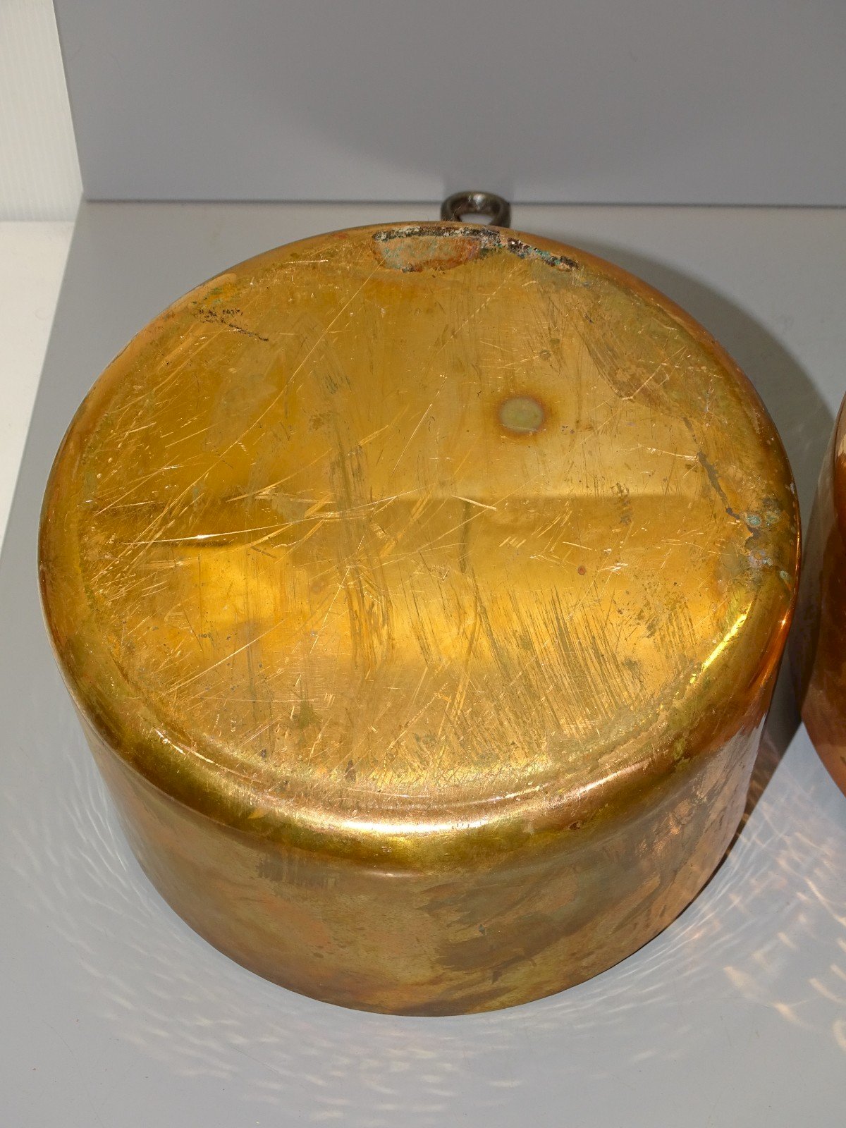 4 Old professional copper pots engraved made in France and A.SIMON slightly hammered - tinned interiors, worn tinning - in their found state, to be cleaned - professional quality (see photos) - attic finds - very dirty - Ref. 42141025/72 - The smallest Length 25.3 cm Diameter 12.4 cm Height 7.4 cm - The largest Length 39 cm Diameter 20.2 cm Height 11.4 cm - Weight 7.4 kg - SHIPPING via Mondial Relay OR Colissimo possible upon request - VERY PROTECTIVE packaging guaranteed - PLEASE TAKE A GOOD LOOK AT ALL PHOTOS as THEY ARE AN INTEGRAL PART of the DESCRIPTION and ALLOW YOU TO SEE the ITEM AT ITS BEST - Condition: Used: Item has been used. Please check the seller's description for more details...Used: Item has been used. any imperfections. Material: Copper