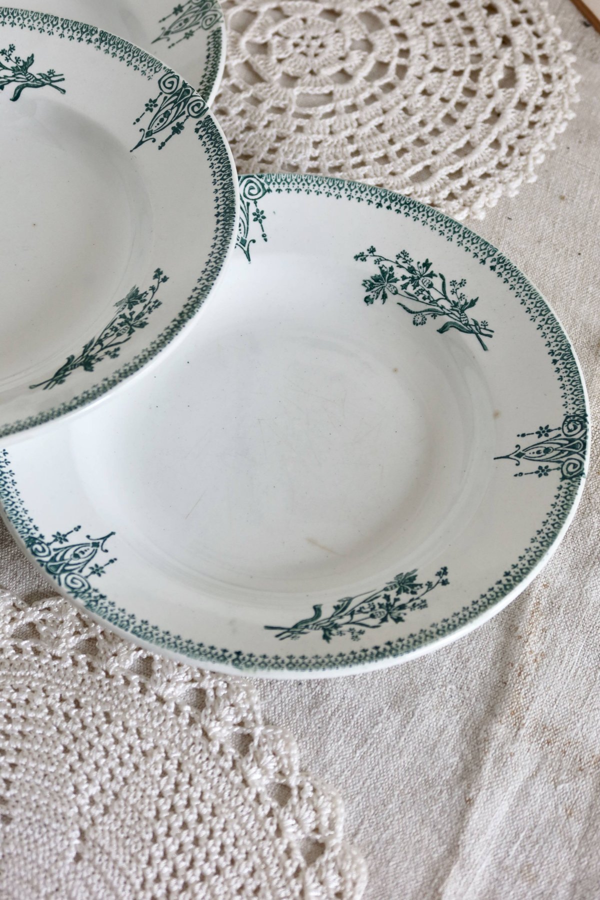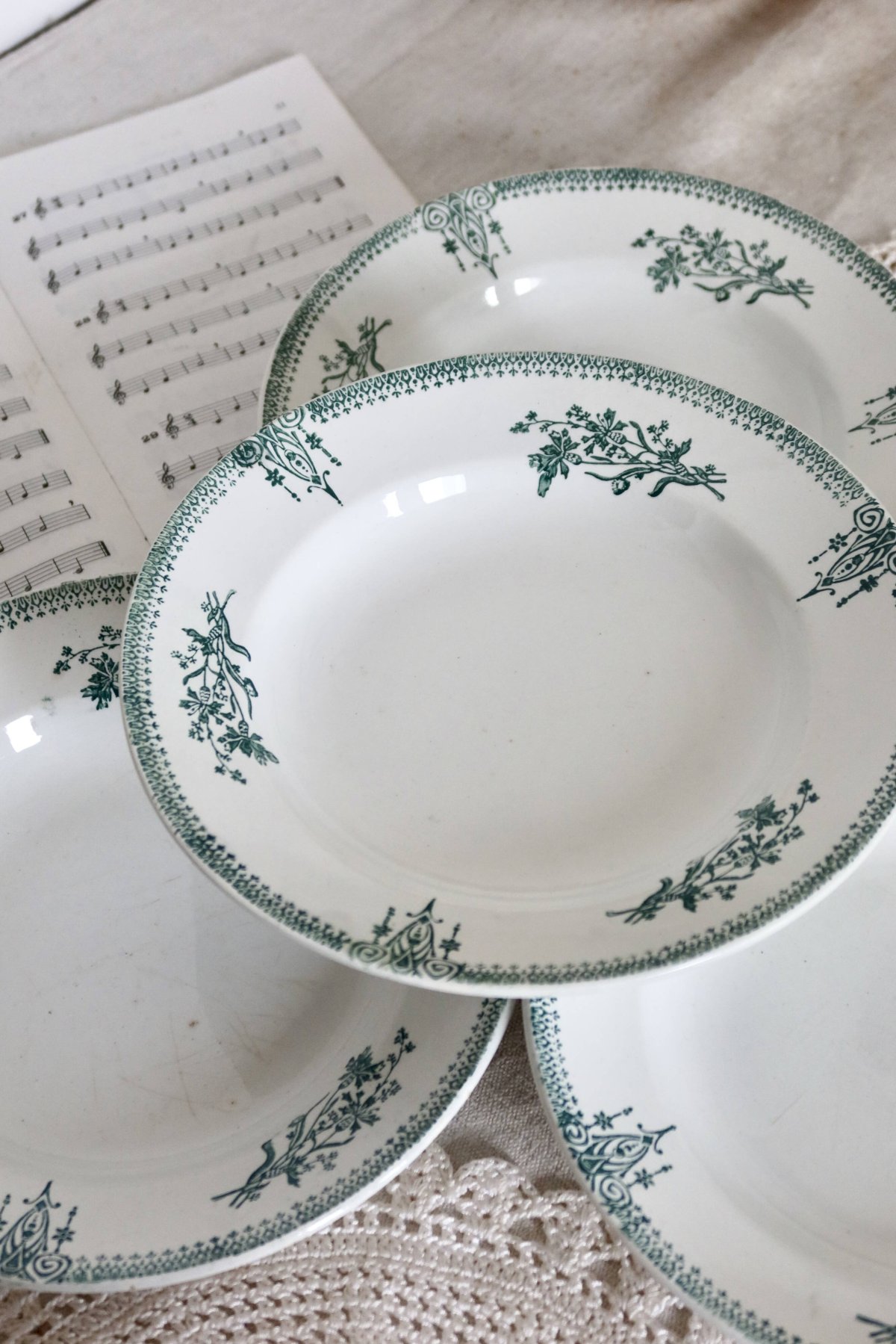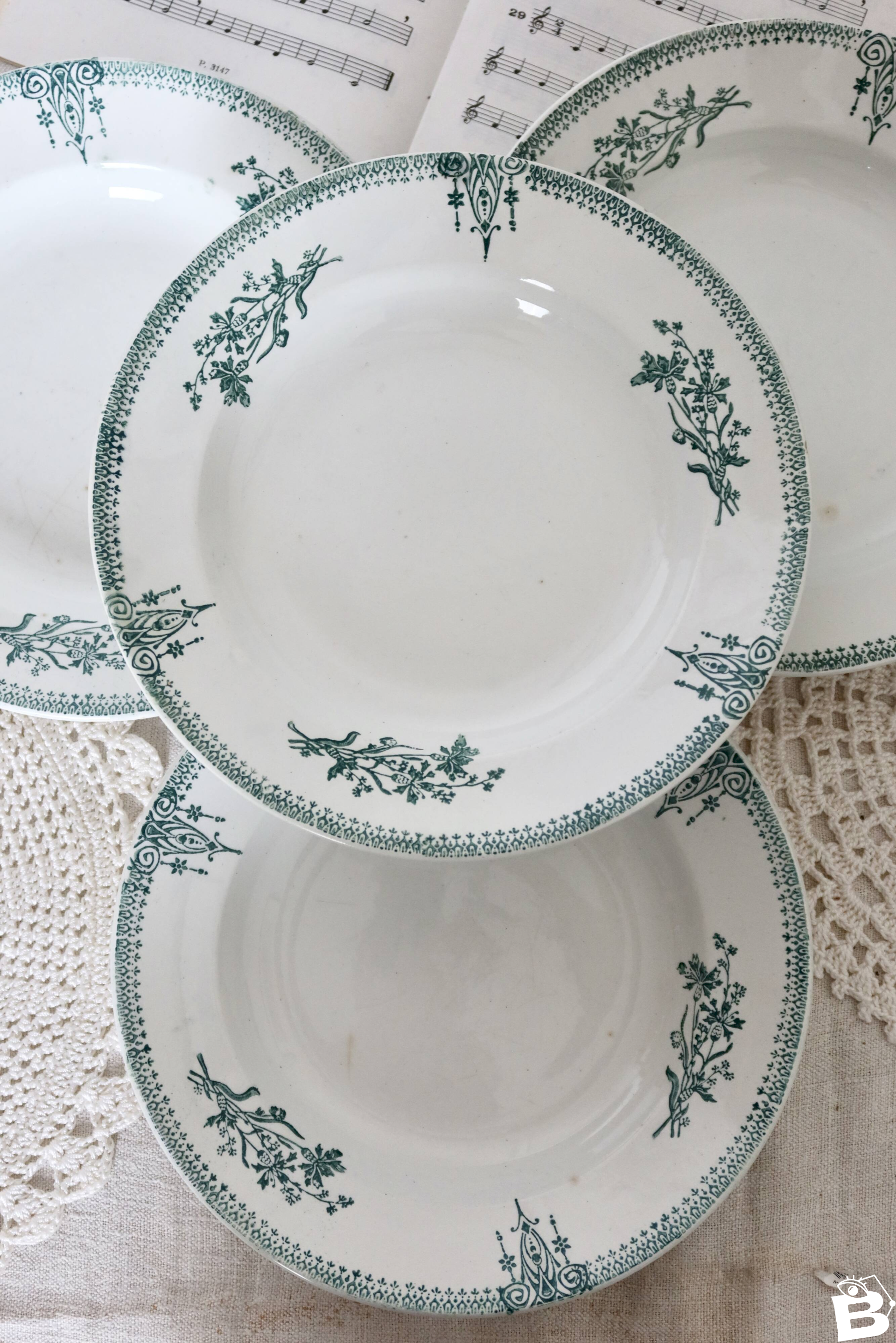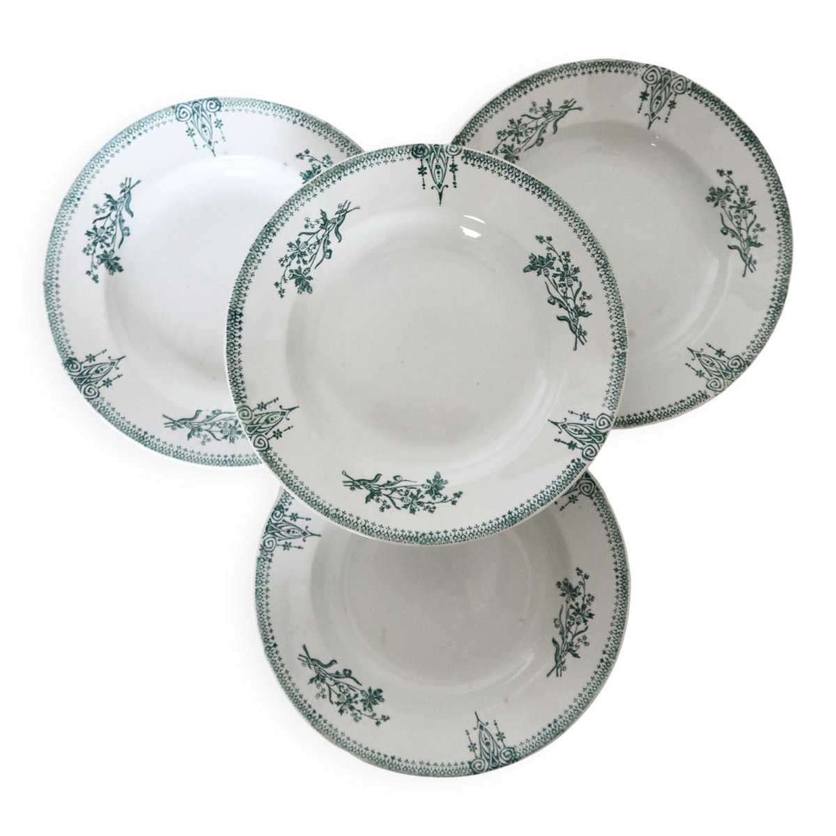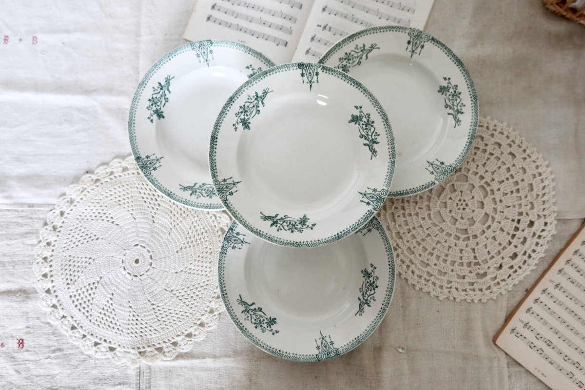 Superb set of 4 deep plates from the Saint-Amand factory. The delicate floral pattern on the rim is in shades of green and blue. Please note that there are signs of age corresponding to the pieces' years. Dimensions: 22cm X 3cm. Net unpacked weight: 1.6kg. L: 22 W: 22 H: 3