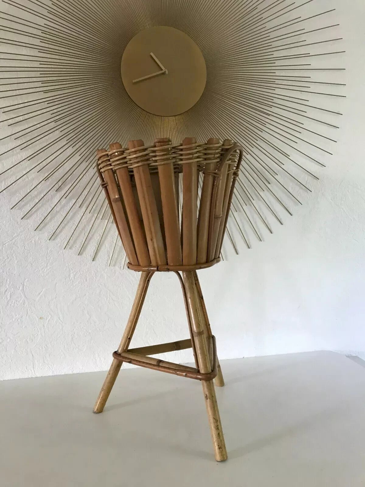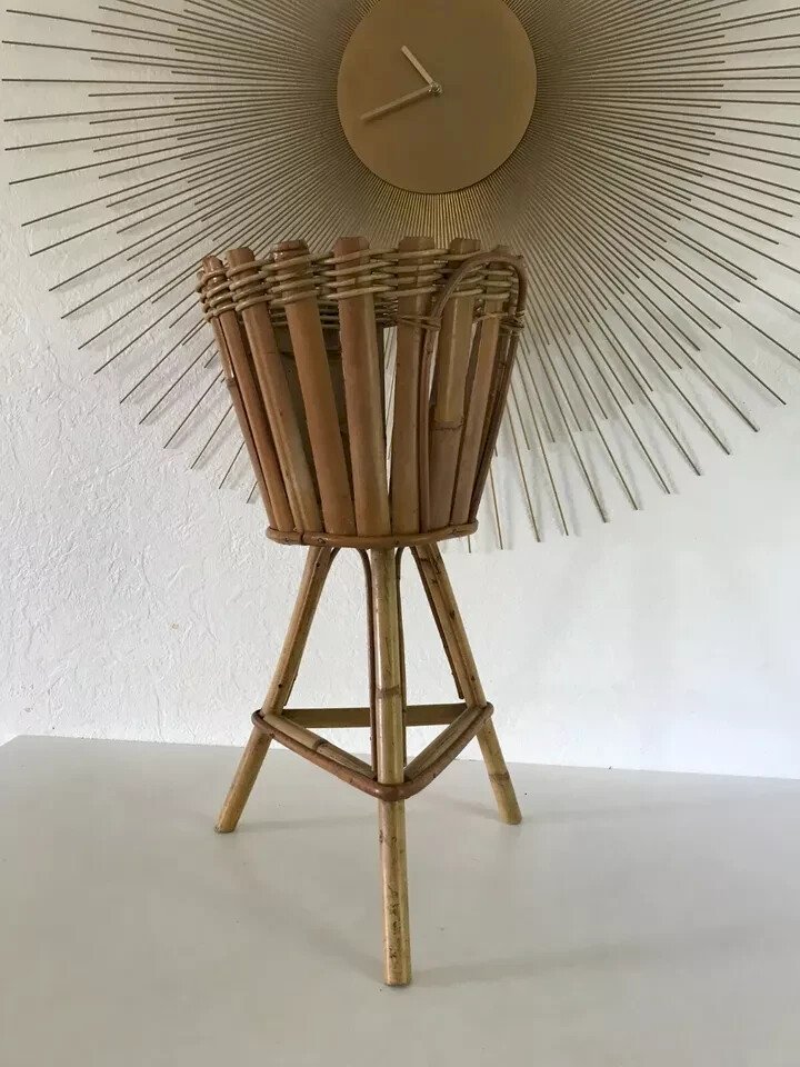 ☺ Vintage Authentic Tripod Cache Pot in Wicker and Rattan, Bamboo ☺ Total height 50 cm, Diameter at the top 24 cm Type: Cache Pot Material: Rattan, Wicker, Bamboo Country of origin: France