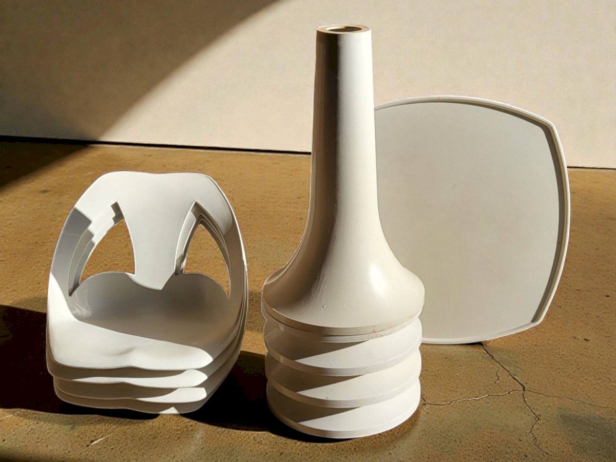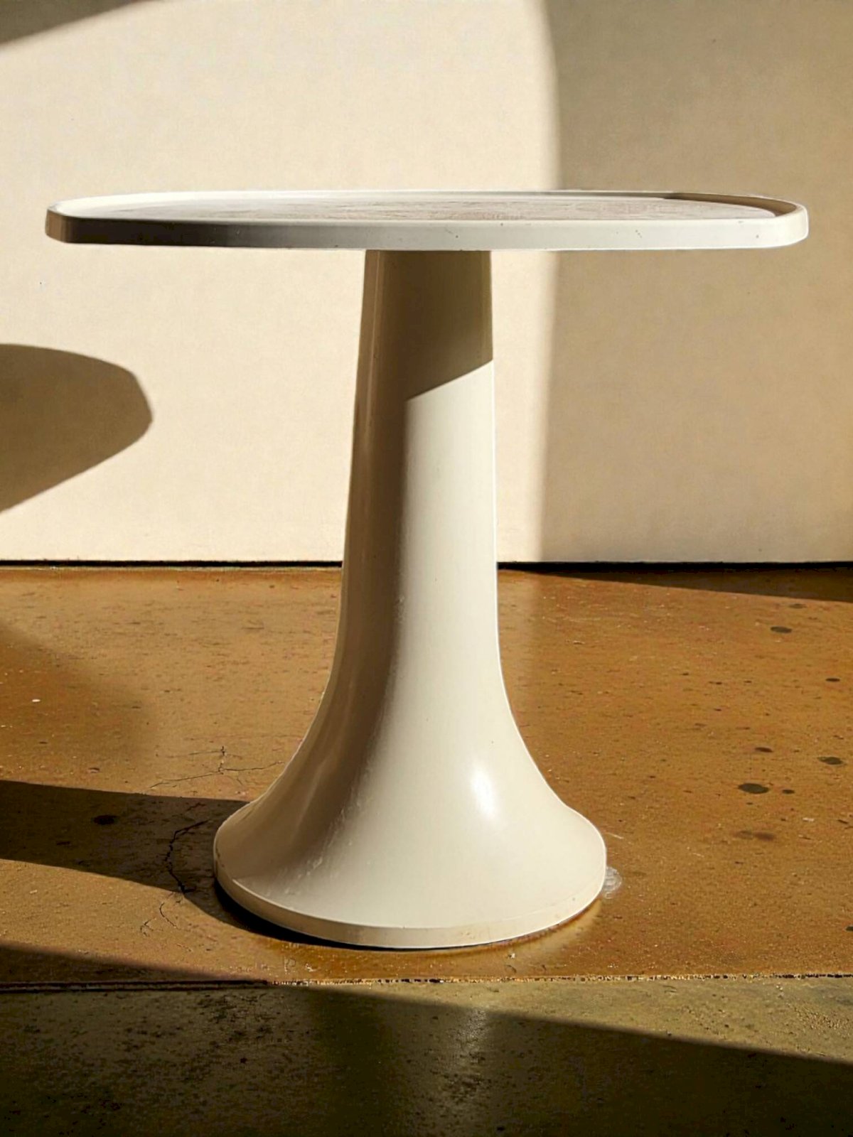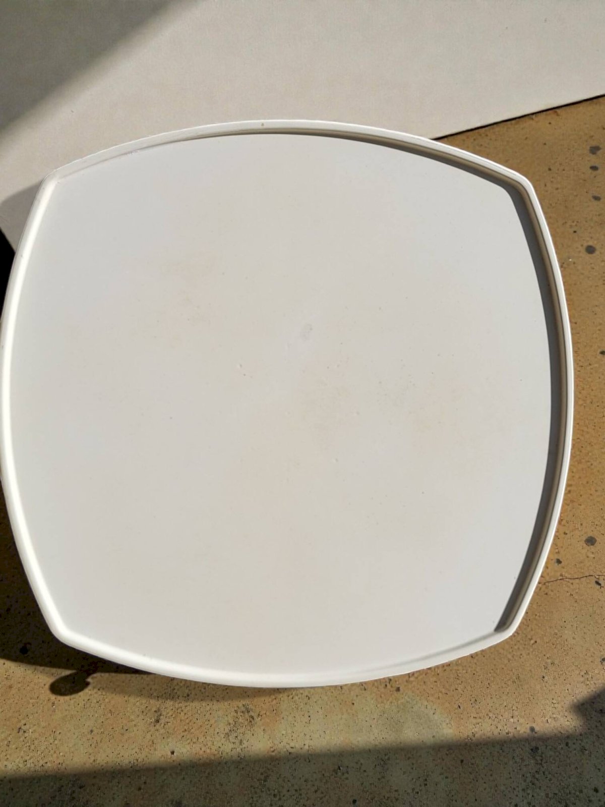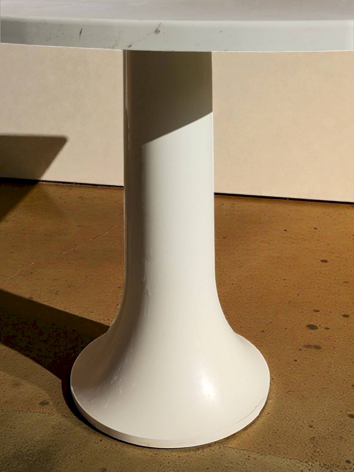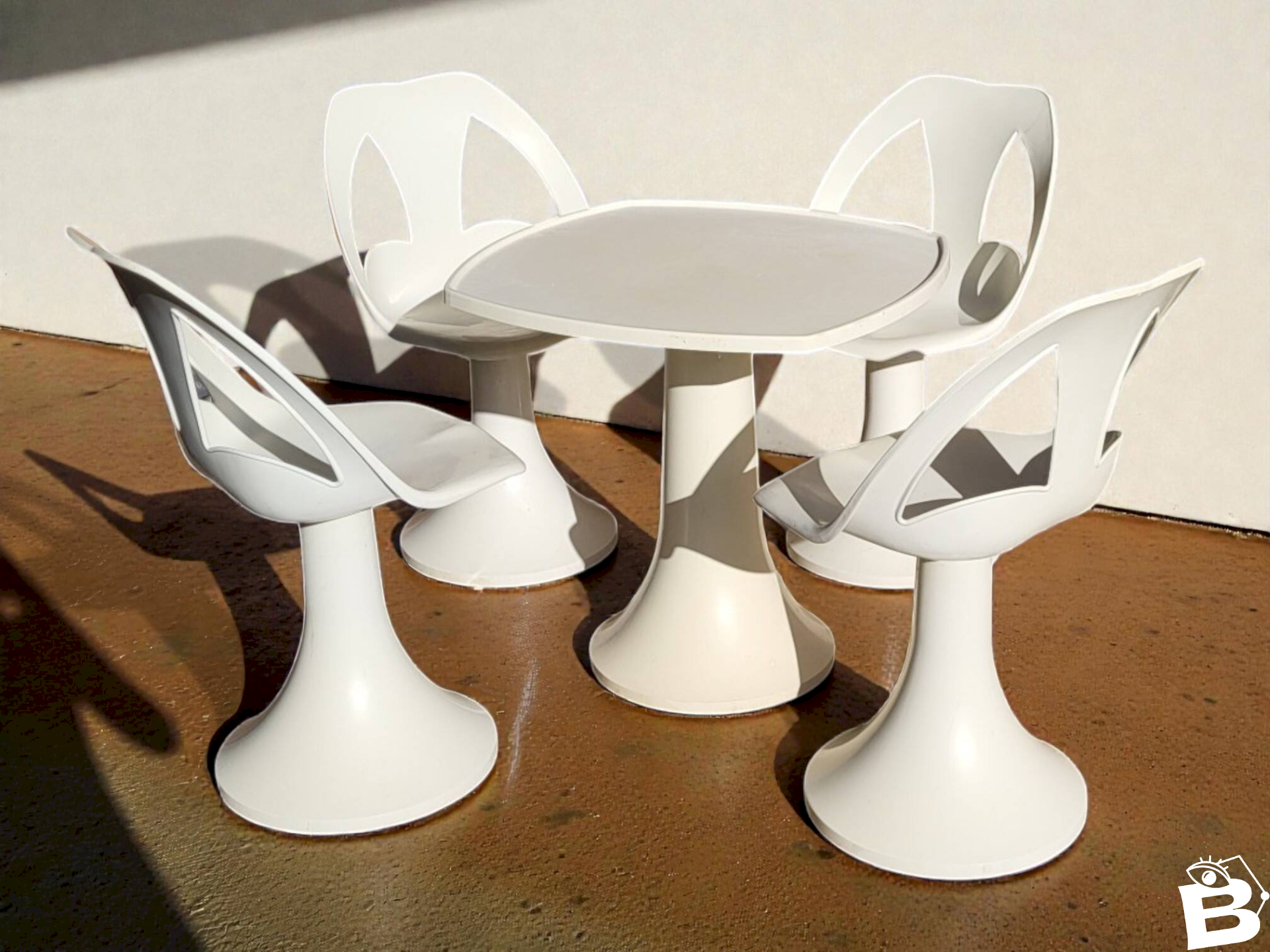 Dining set consisting of 4 chairs and 1 table from the 1960s, Space Age. Off-white / cream. Table height 66 cm Dimensions 69*69 cm. Chair height 80 cm Seat height 48 cm width 50 cm. Signs of use and age.