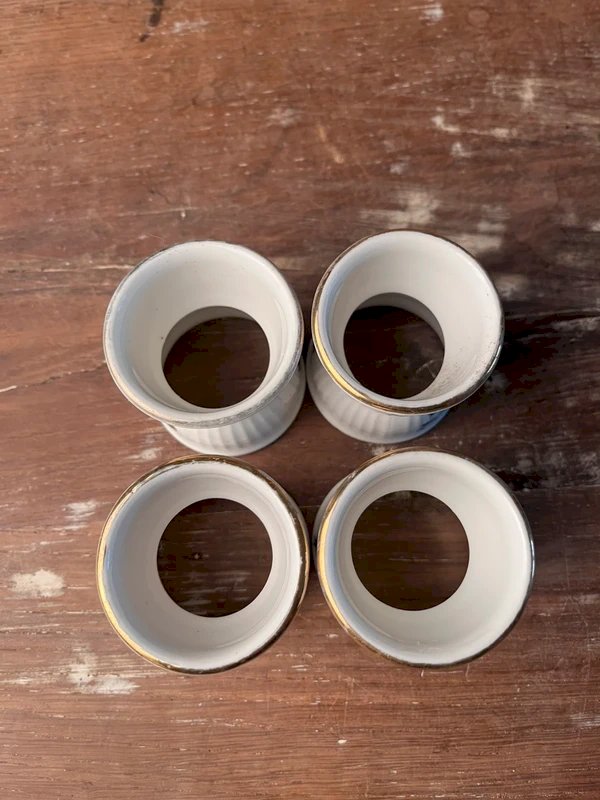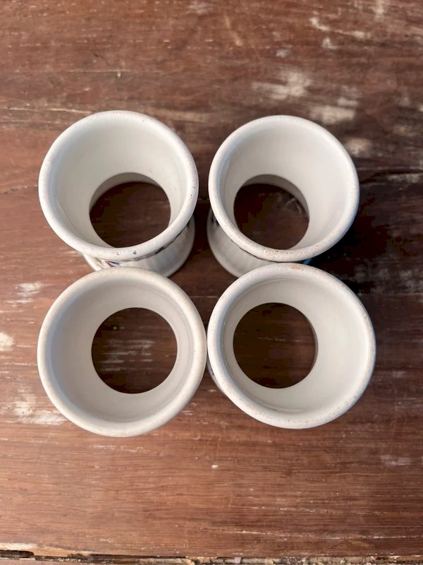 4 antique white porcelain egg cups with a decoration known as "Aux Barbeaux" featuring small cornflower flowers.