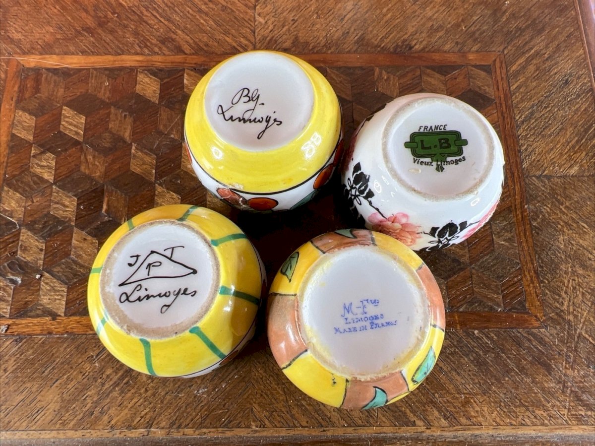 Set of 4 porcelain salt cellars from Limoges, Art Deco period circa 1920. Hand-painted decorations (fruits, stylized flowers). Trimmed in gilded brass. Height: 3.5 cm (1.38 in) Diameter: 5 cm (1.97 in) Overall good condition. Normal wear on the brass consistent with age. No visible chips or cracks. Condition: Used: Item has been used. Please refer to the seller's description for more details ... Used: Item has been used. any imperfections. Color: Multicolor Number of pieces: 4 Period: Art Deco, 1920-1939 Sub-type: Salt cellar Country of origin: France Material: Ceramic, Porcelain