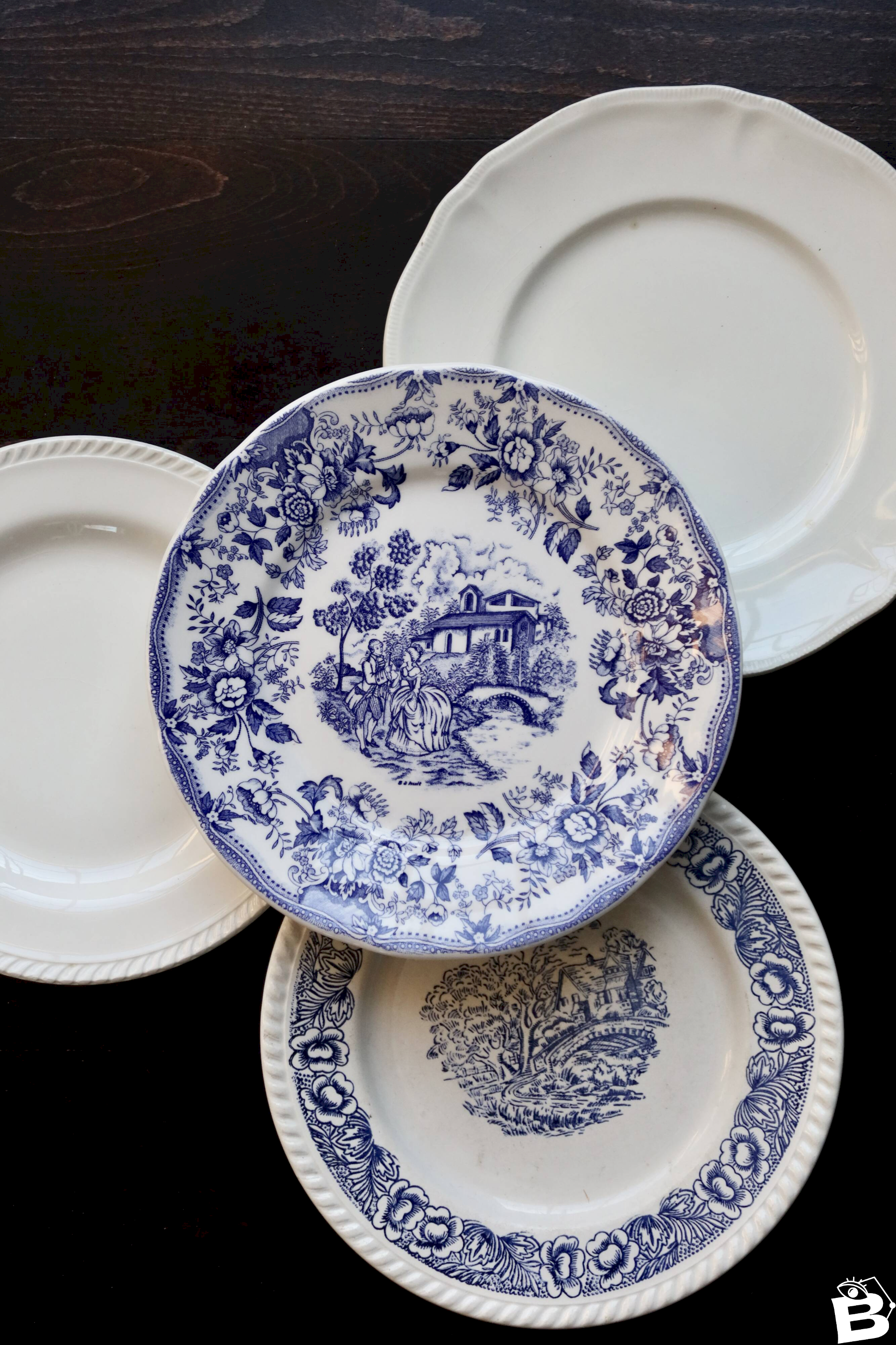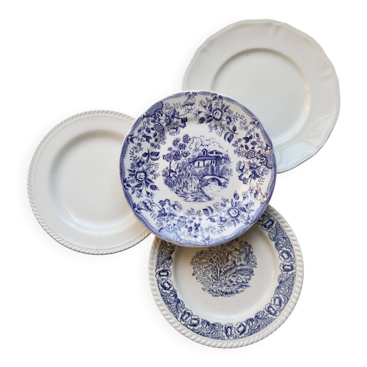 4 mismatched vintage flat plates blue and white earthenware - Cambridge lot