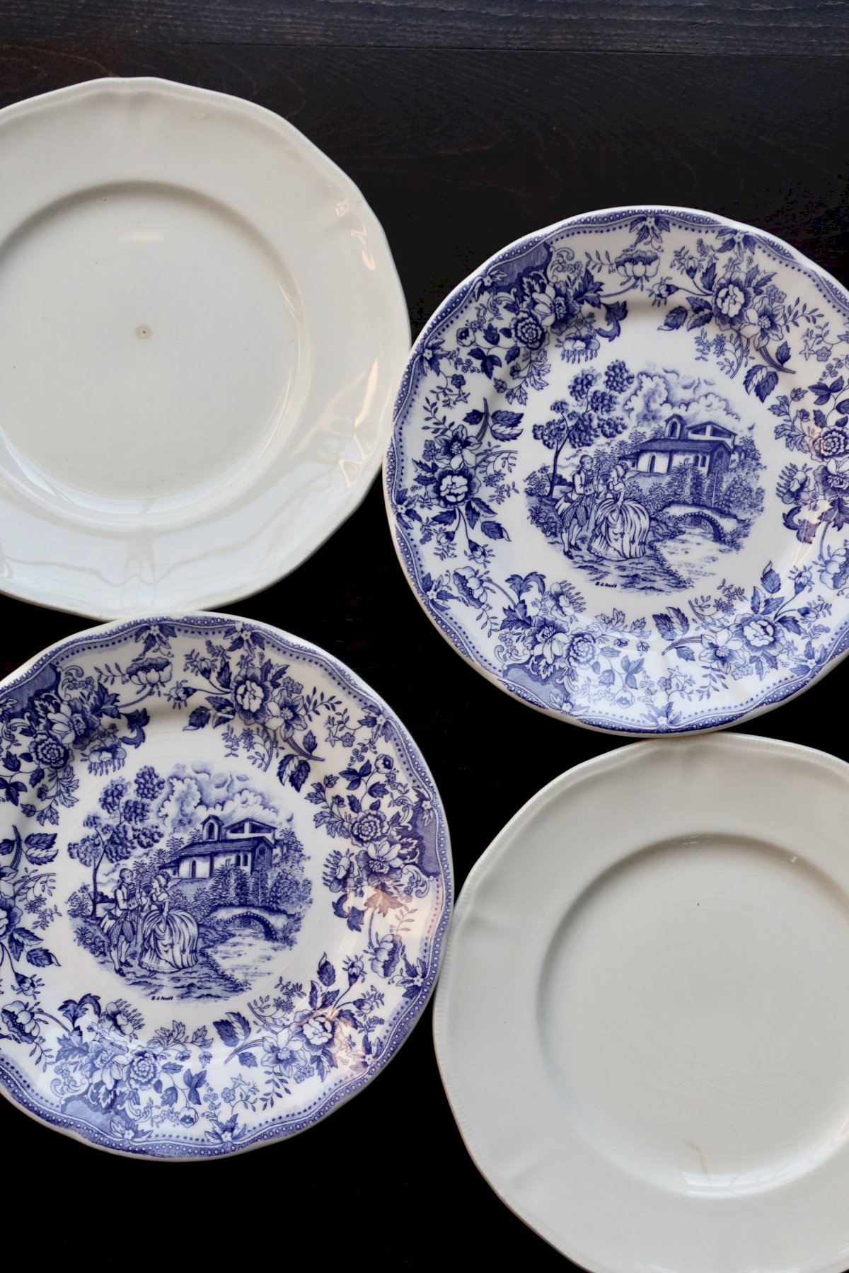 4 mismatched vintage flat plates blue and white earthenware - Cambridge lot Ceramic