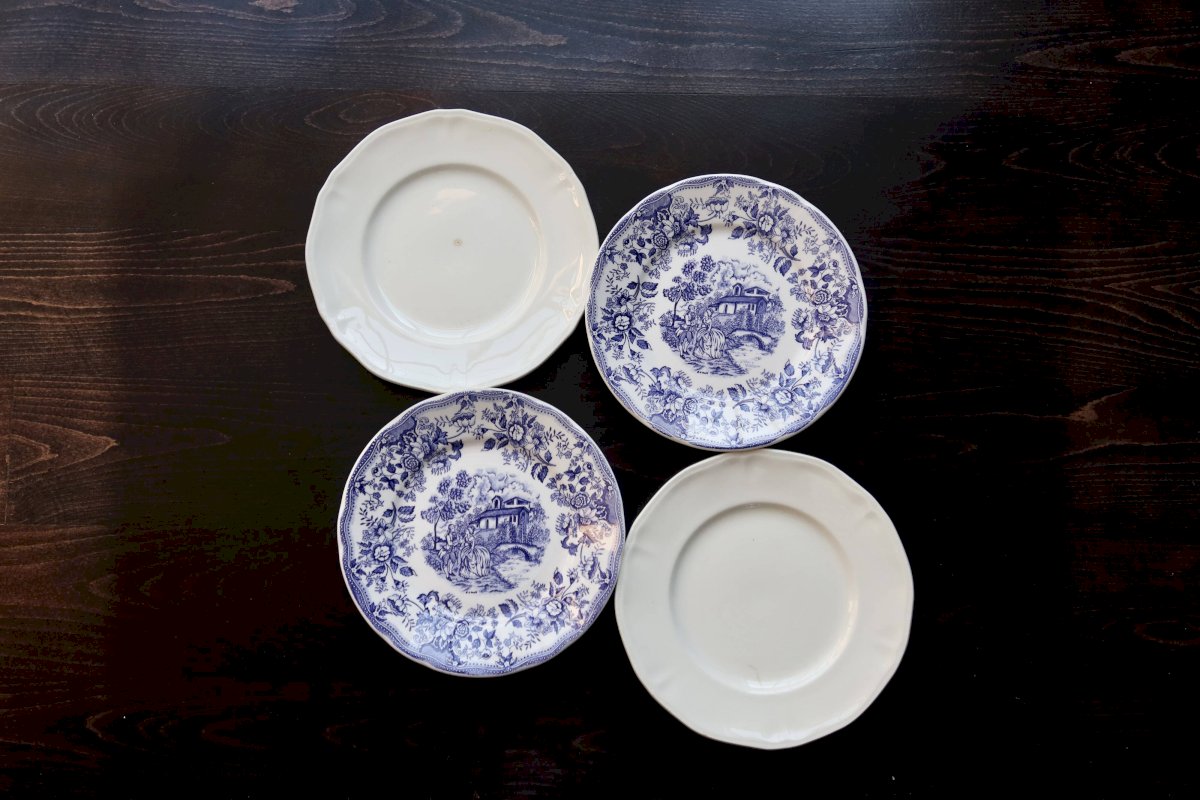 Charming set of 4 antique flat plates in blue and white earthenware, mismatched.