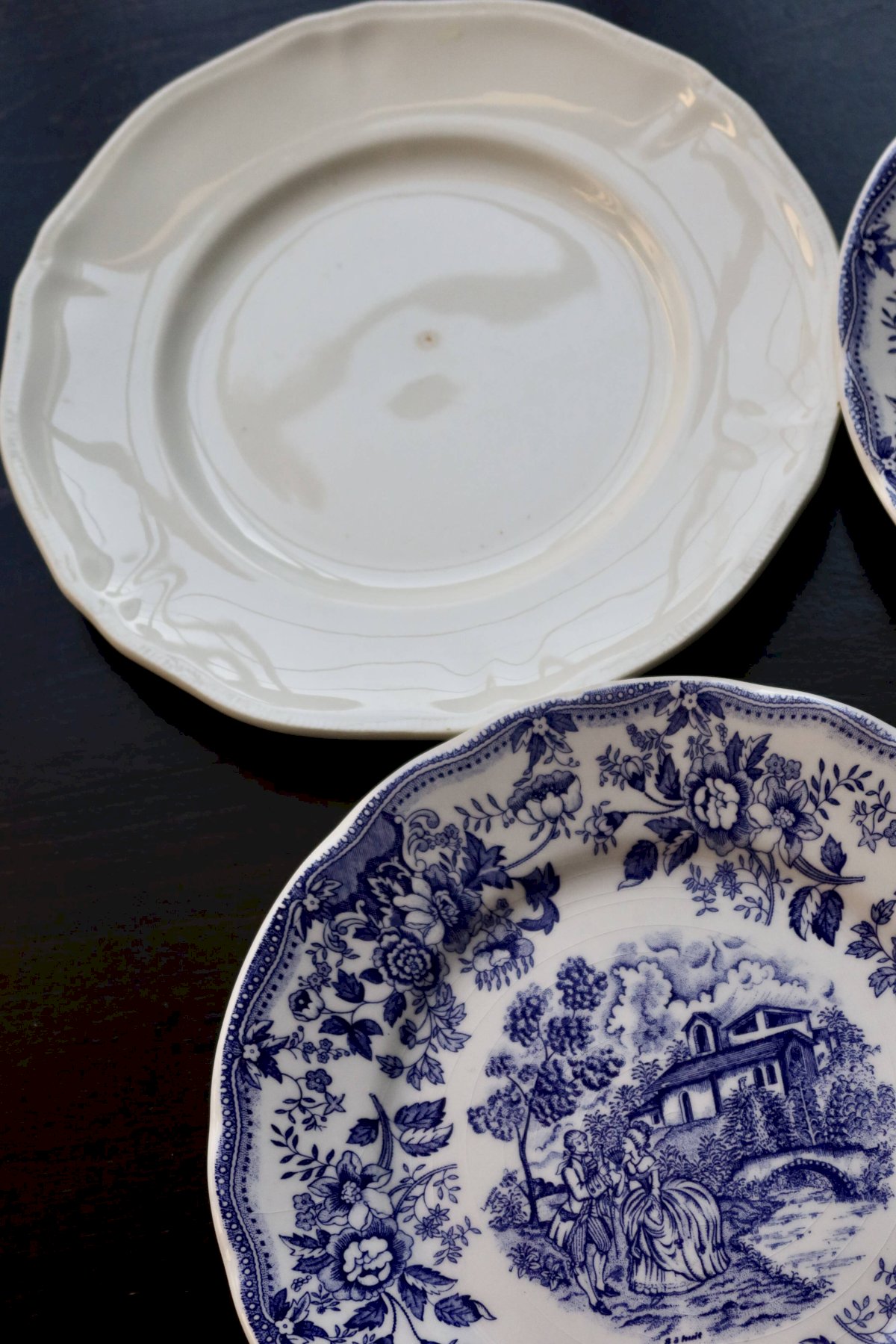 6 mismatched vintage dessert plates in blue and white earthenware and porcelain
