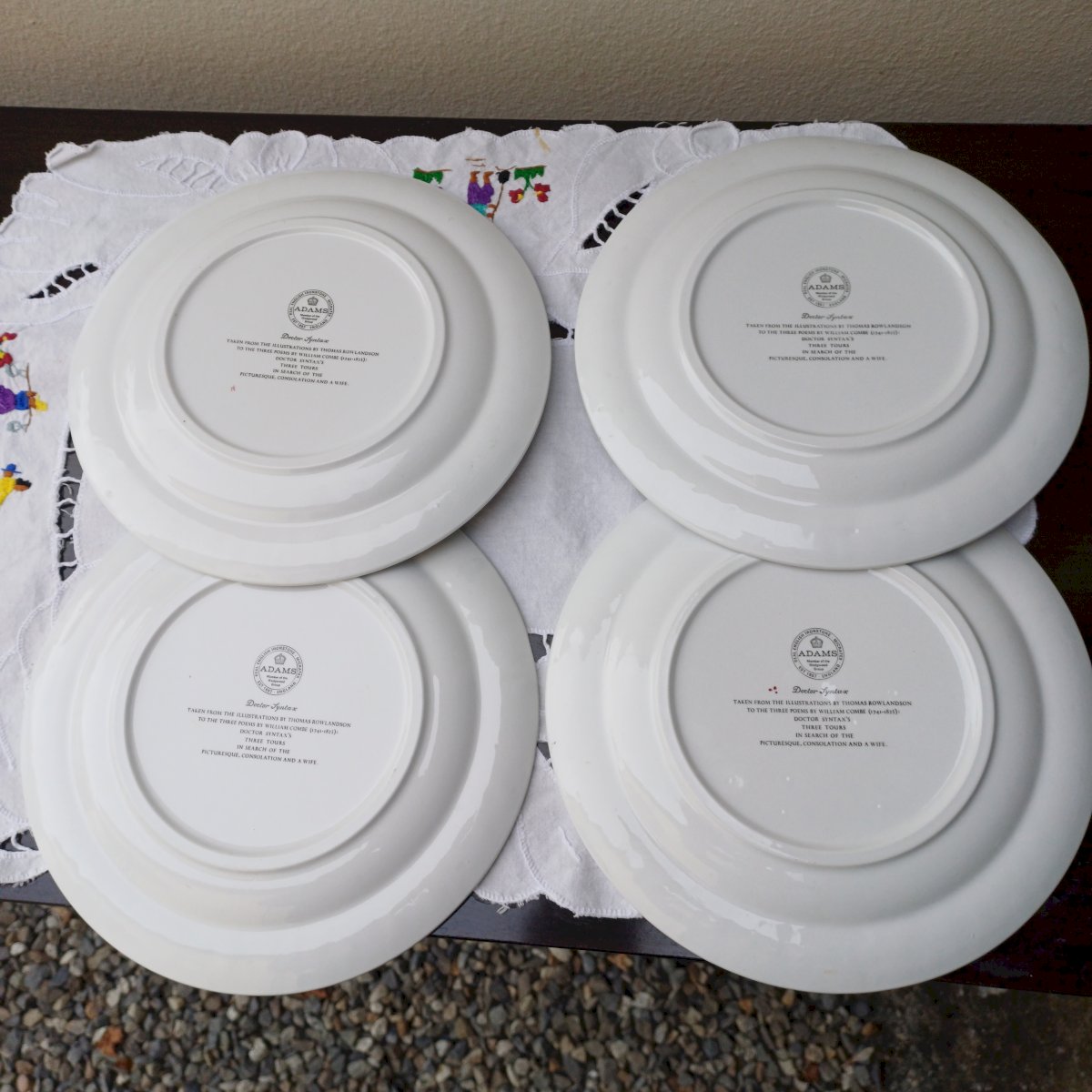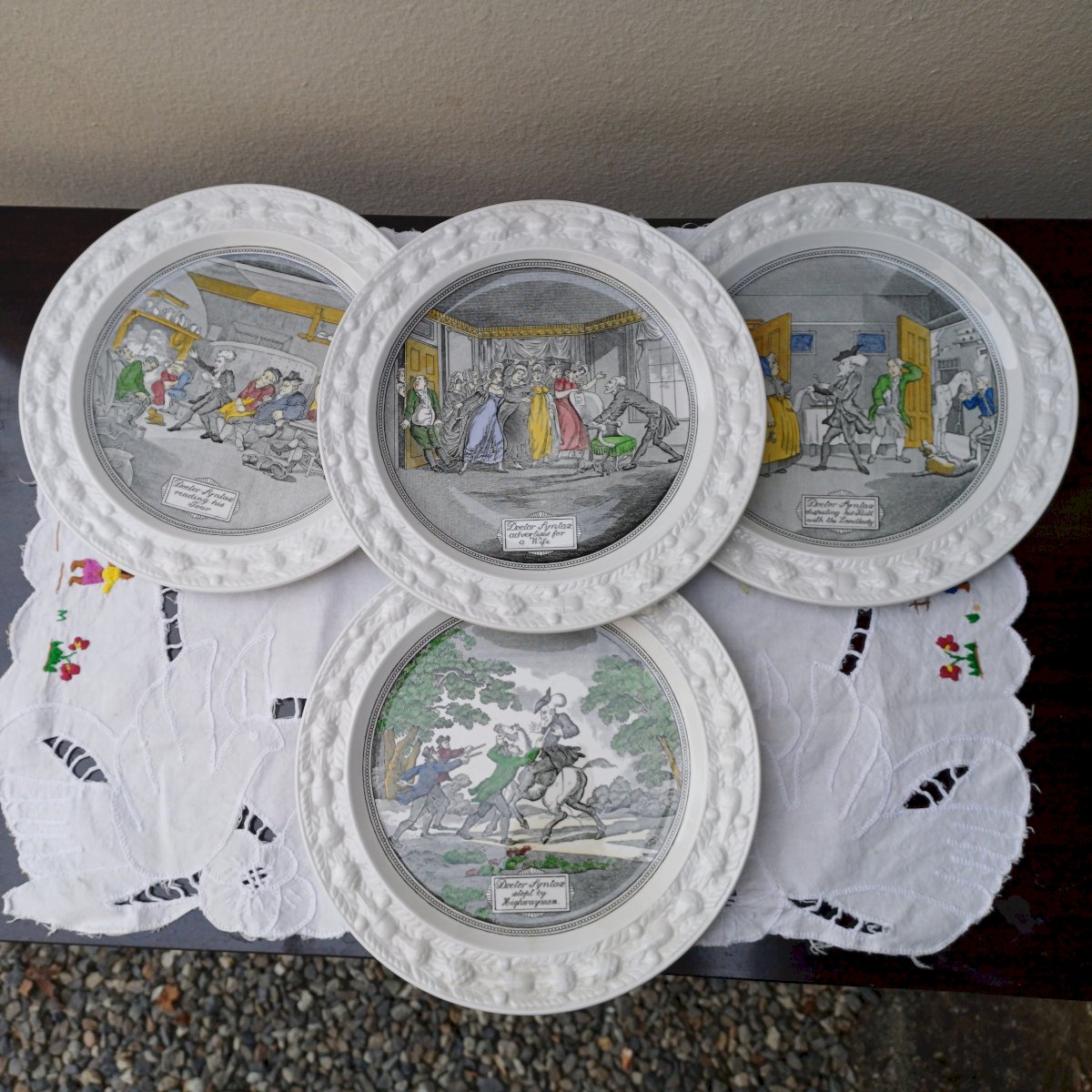 Original and funny for these 4 little English plates made by the Wedgwood company (22 cm in diameter). For appetizers, cheeses, desserts, these plates will not go unnoticed. In perfect condition.