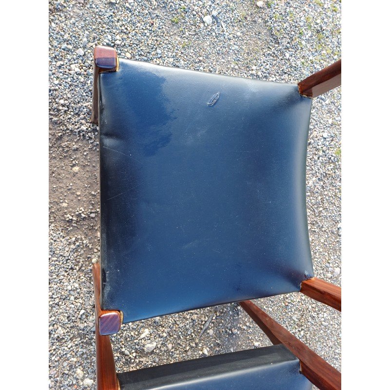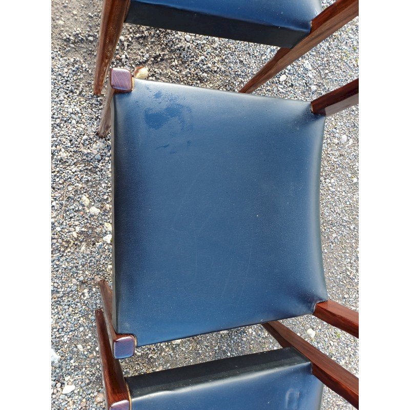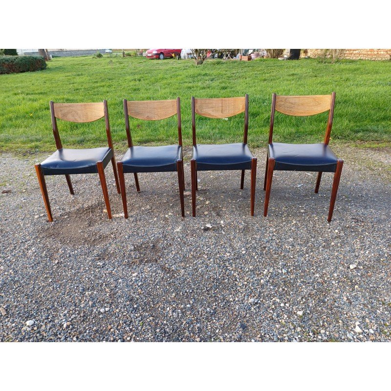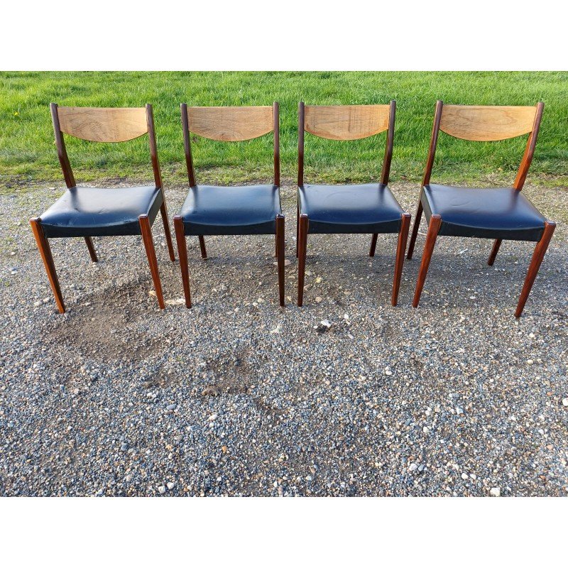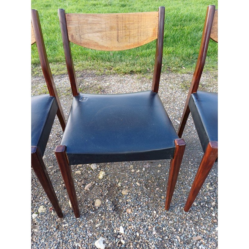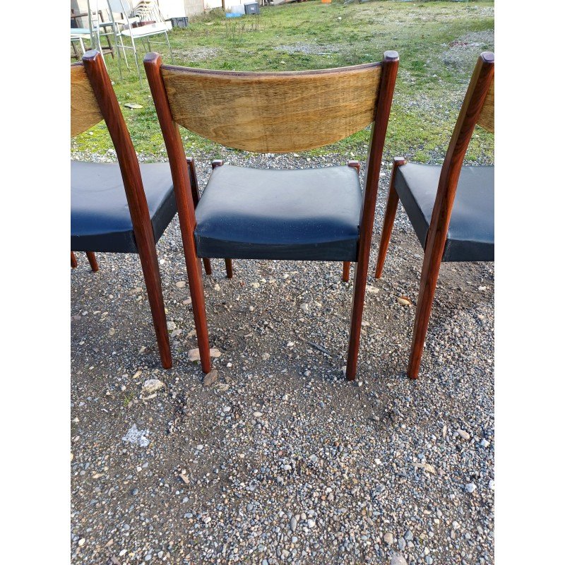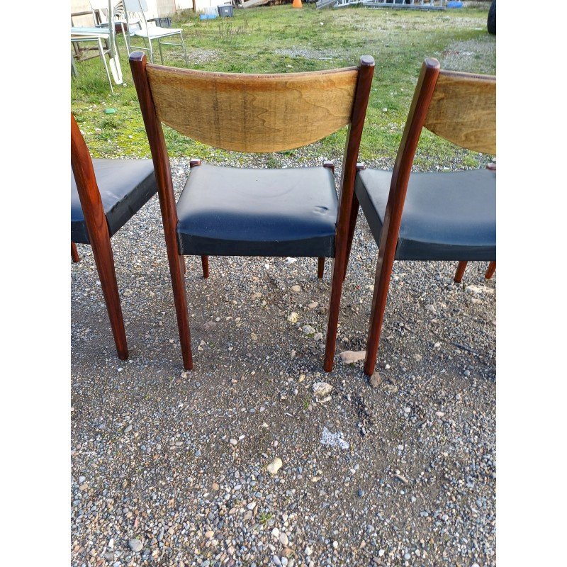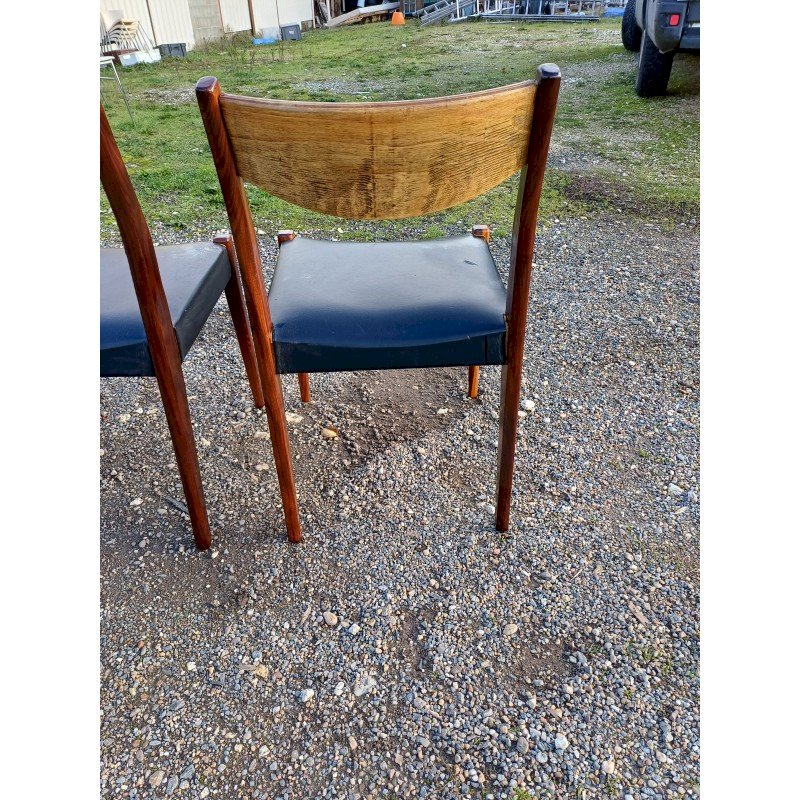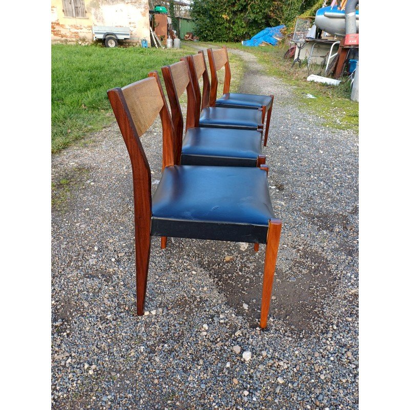4 Vintage Baumann Chairs from the 1960s, Exotic Wood and Beech, Black Skai Seat, Height: 83 cm, Seat Height: 46 cm, Length and Width: 51 cm by 46 cm, very good condition except for one snag in the Skai on one of the chairs.