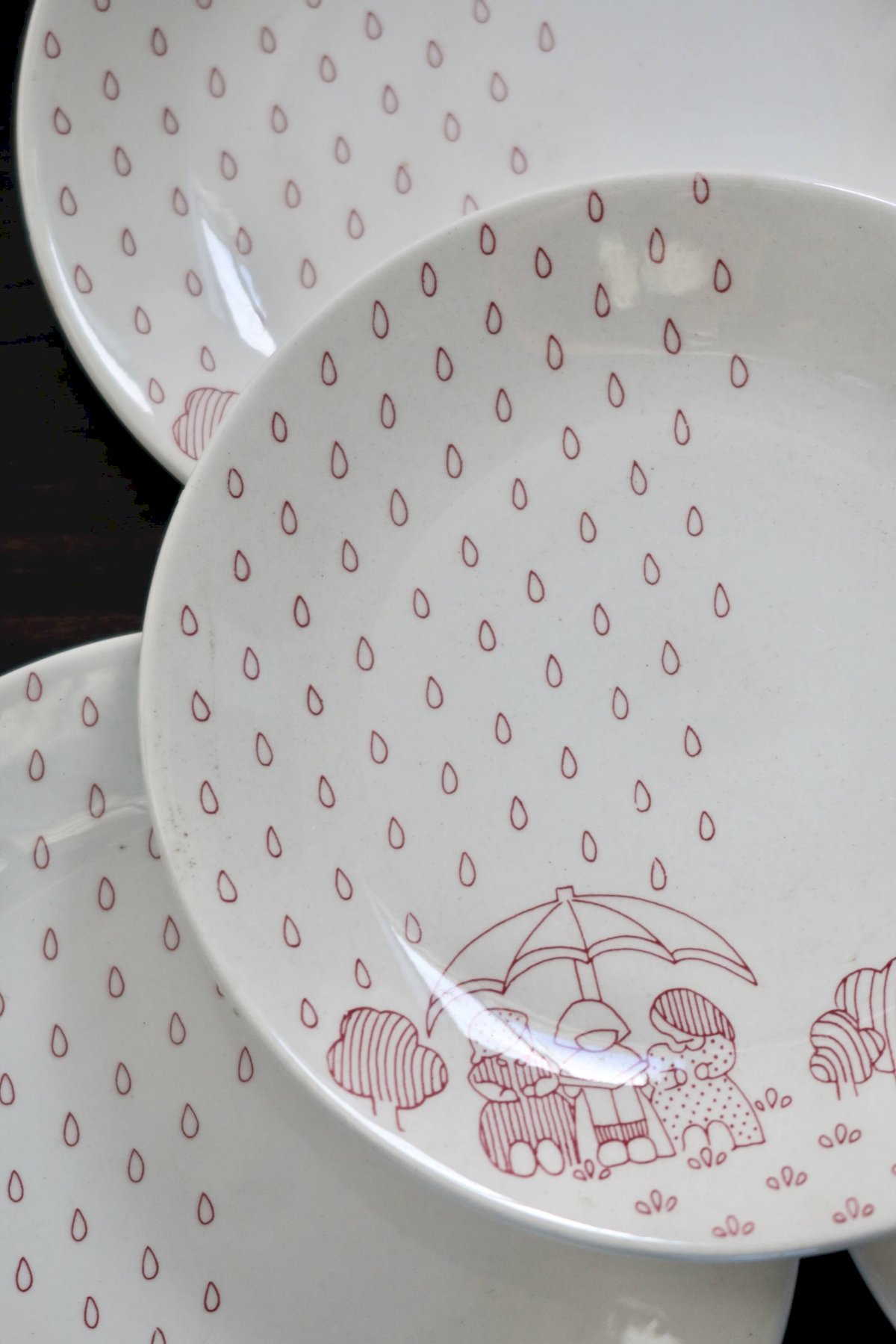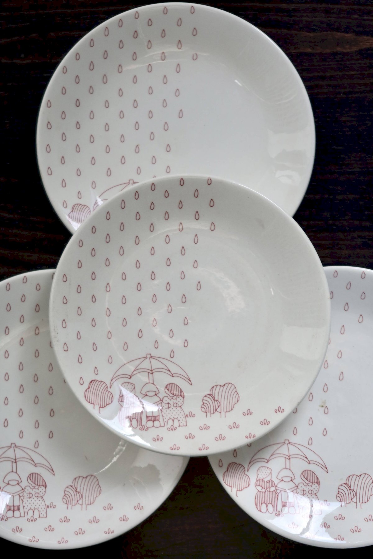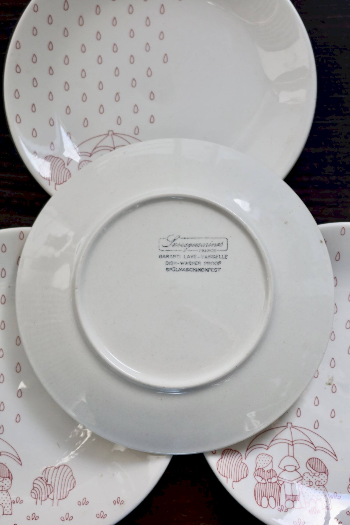 Pretty set of 4 dessert plates made of Sarreguemines earthenware, featuring a naïve and childlike red design depicting a scene in the rain, typical of the 1980s. The graphic and repetitive pattern adds a soft and retro touch, perfect for a family table or mismatched collection.