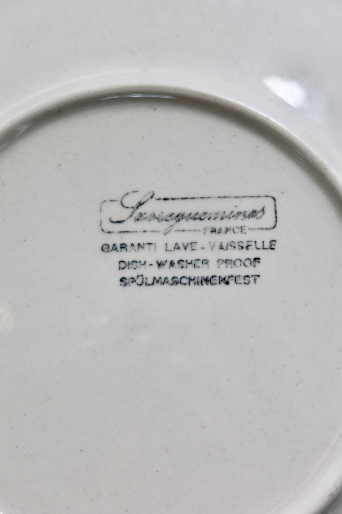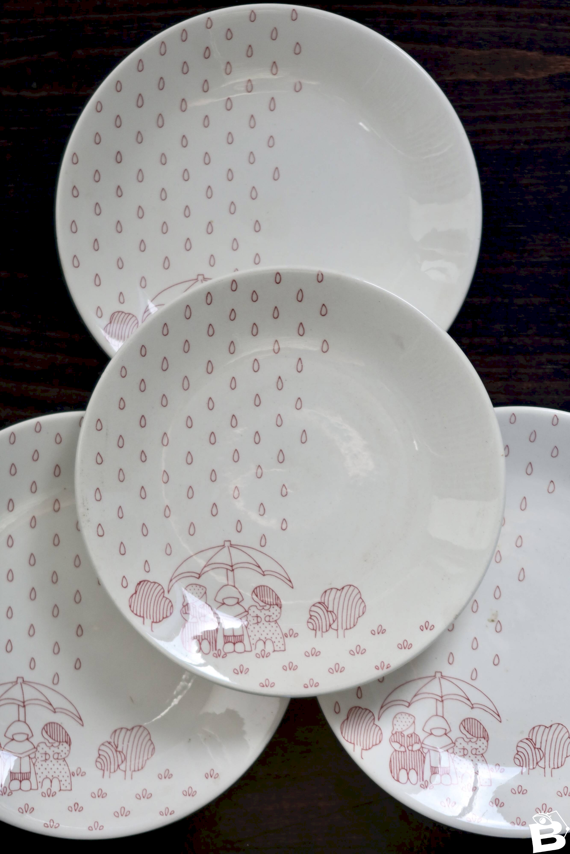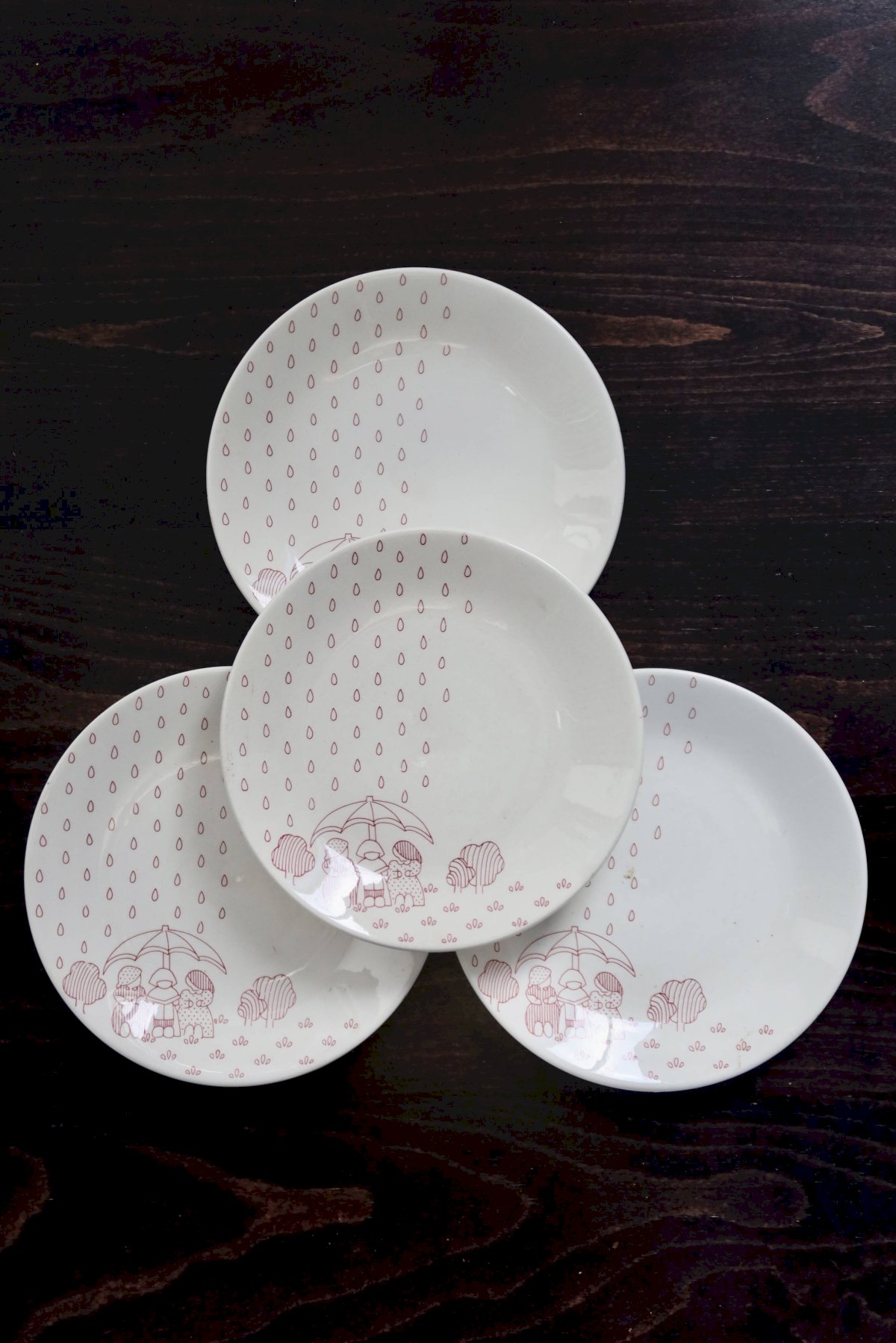 Pretty set of 4 dessert plates made of Sarreguemines earthenware, featuring a naïve and childlike red design depicting a scene in the rain, typical of the 1980s. The graphic and repetitive pattern adds a soft and retro touch, perfect for a family table or mismatched collection.