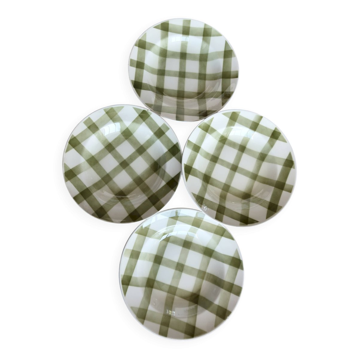 These four vintage-style earthenware deep plates feature an elegant design with a green checkered pattern reminiscent of a country tablecloth.