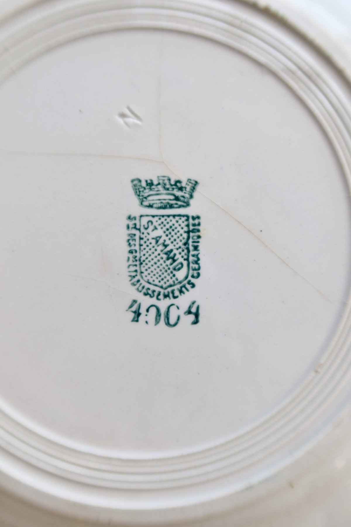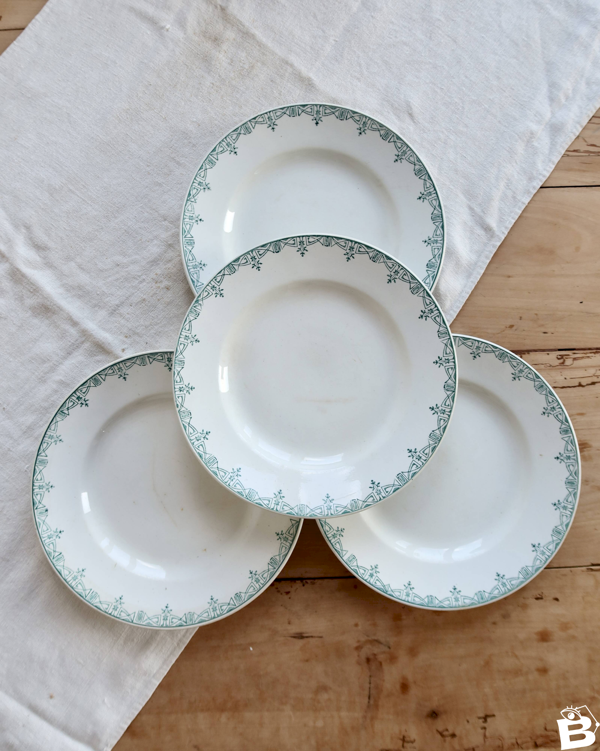 Set of four antique flat plates made of ironstone from the Saint-Amand pottery, decorated with the 4004 pattern featuring elegant green geometric motifs on the rim.