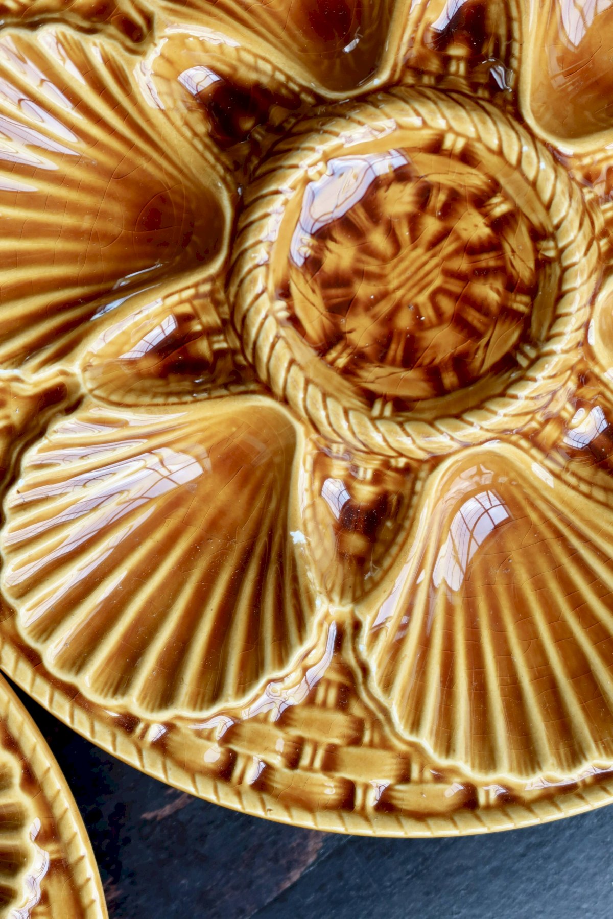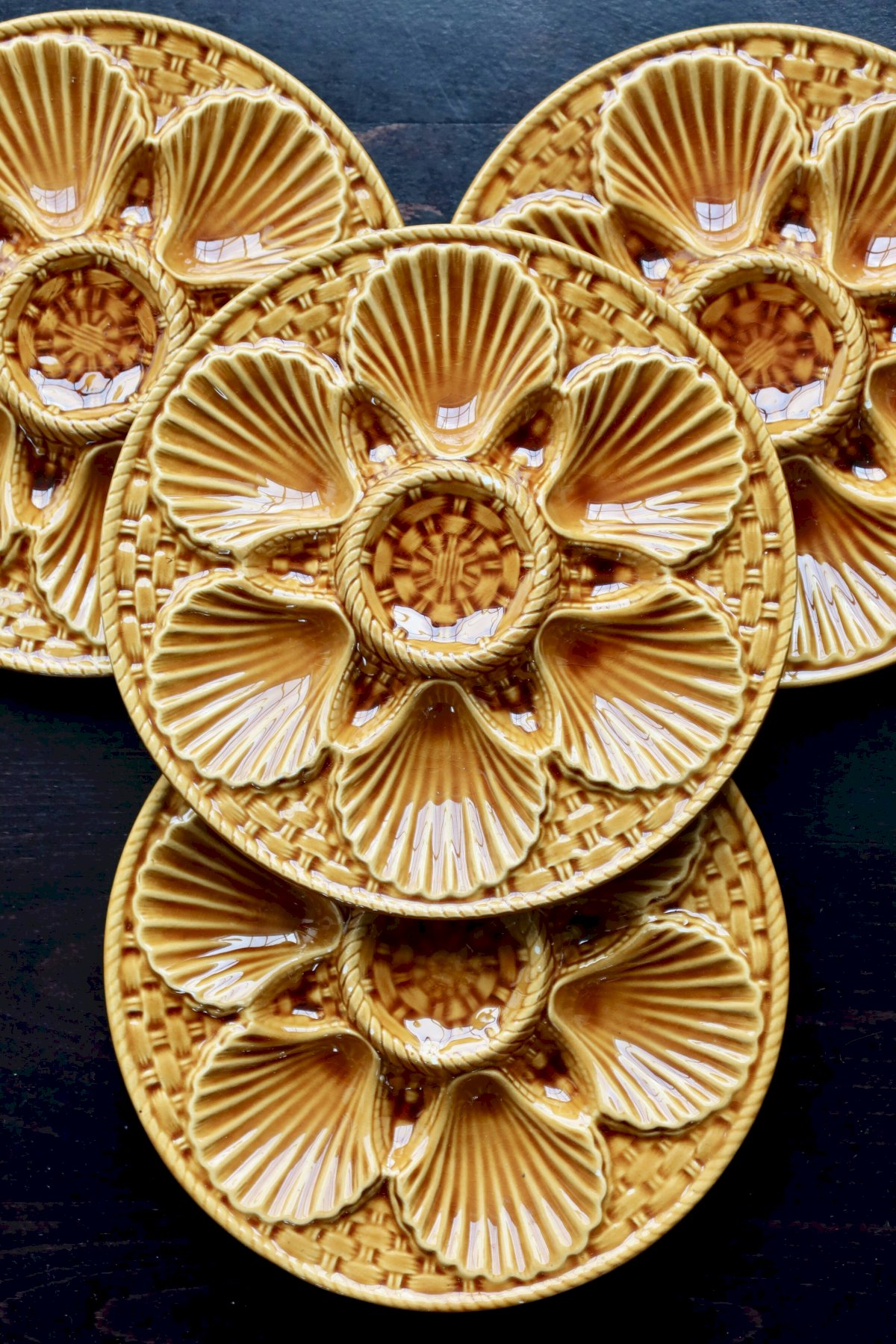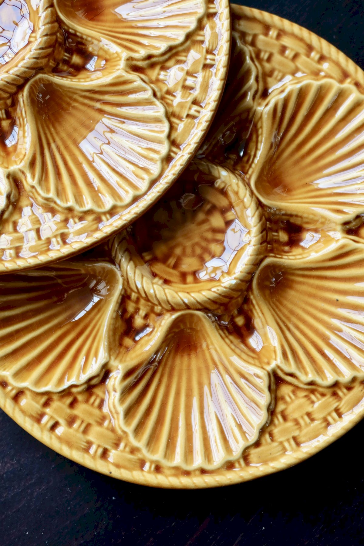 Superb set of 4 Longchamp oyster plates in glazed earthenware, warm ochre tone.