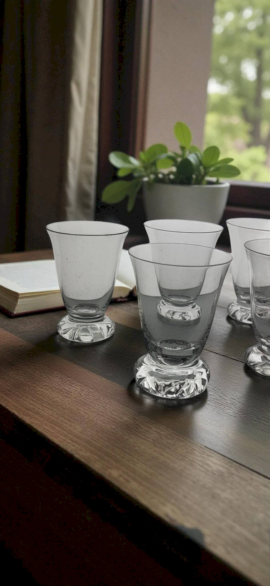 5 crystal glasses Daum model Kim. Height 7.5 cm. Diameter at the rim 5.6 cm. Capacity 5 cl. In good condition. L: 5 l: 5 H: 7
