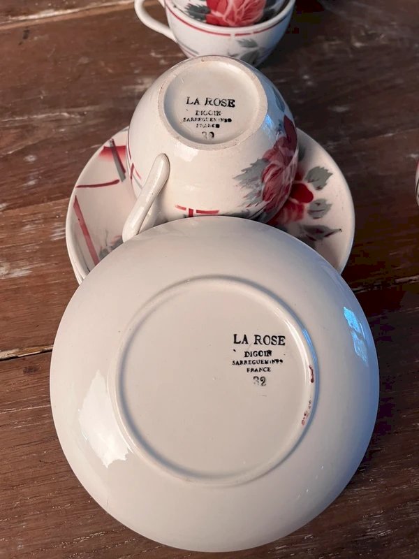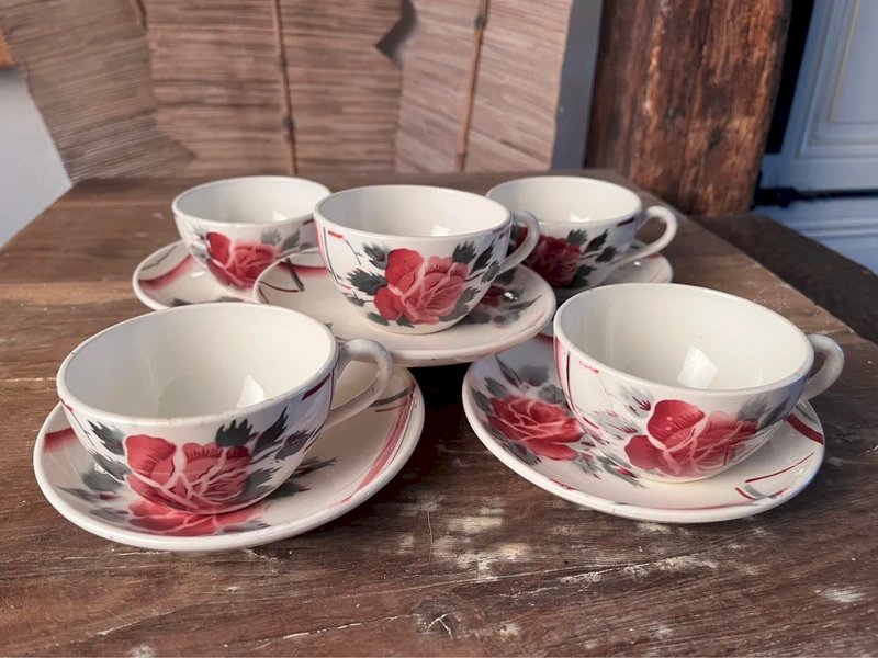 5 tea cups and saucers Digoin Sarreguemines model La Rose in antique faience.
