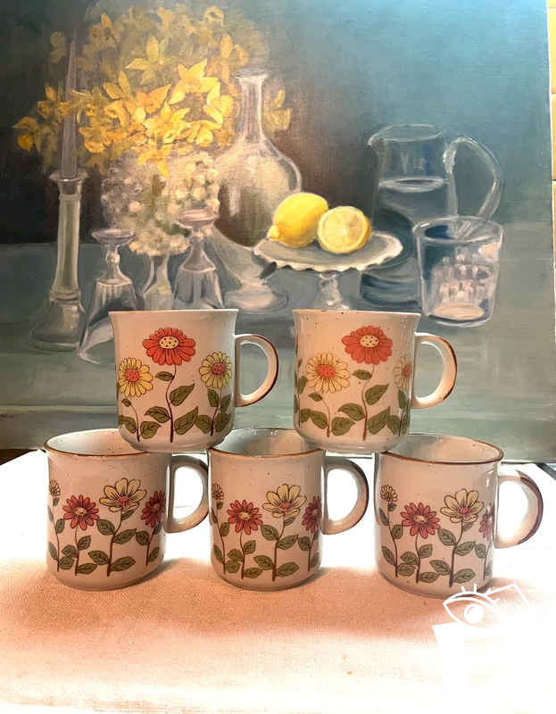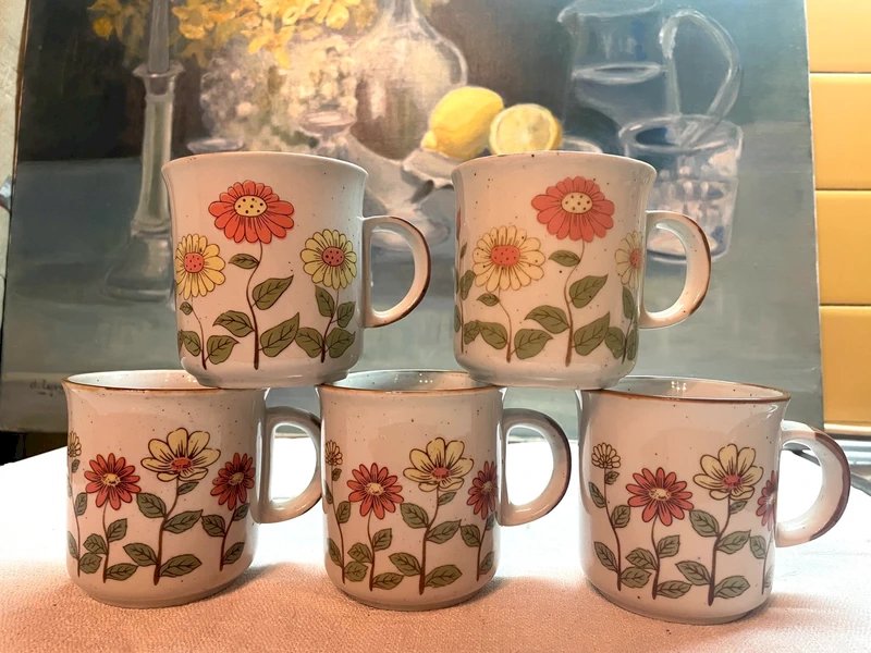 5 vintage speckled stoneware mugs Made in Korea Bergère de France 2 different models Very good condition Height 9cm, diameter 8cm