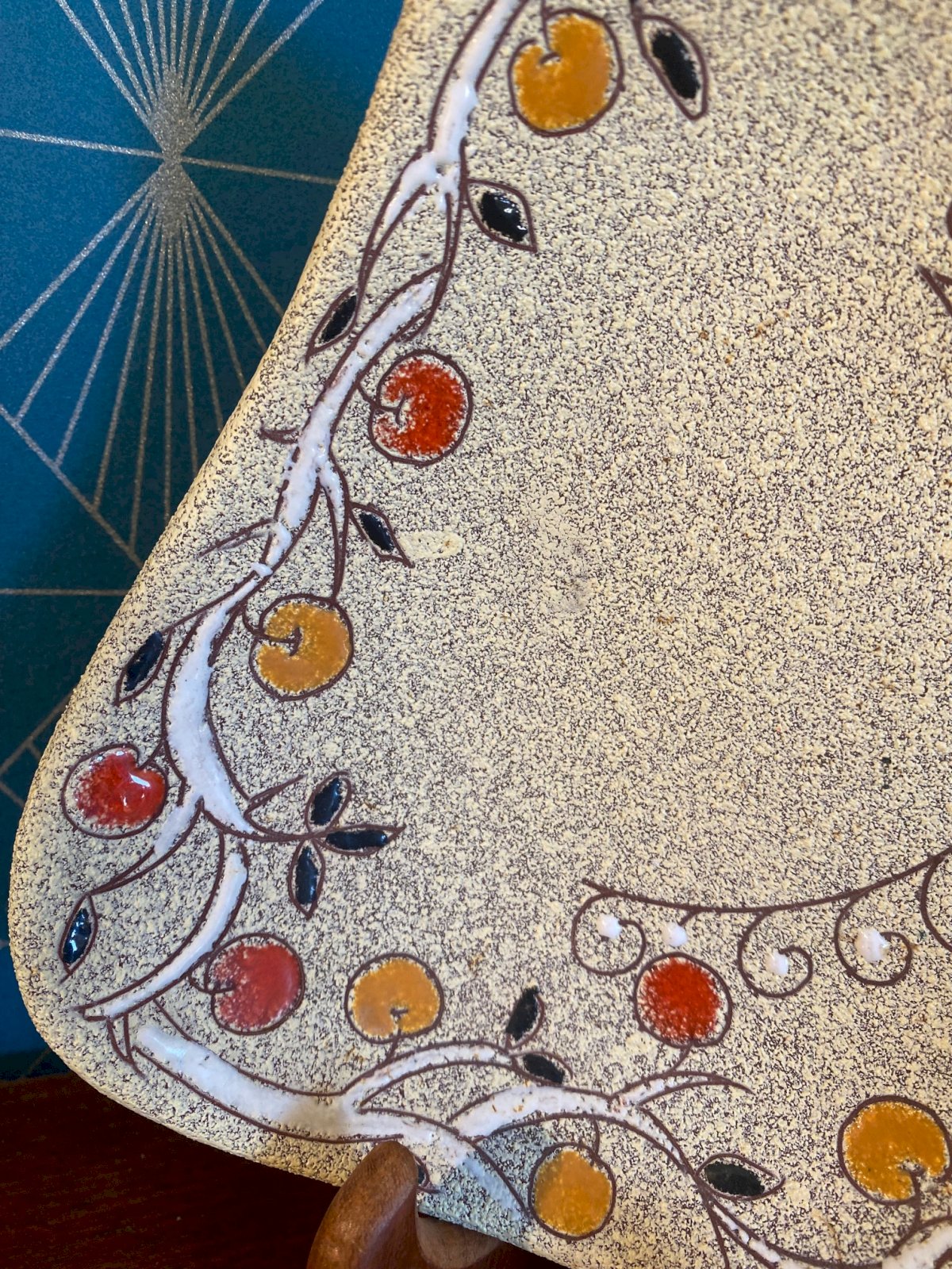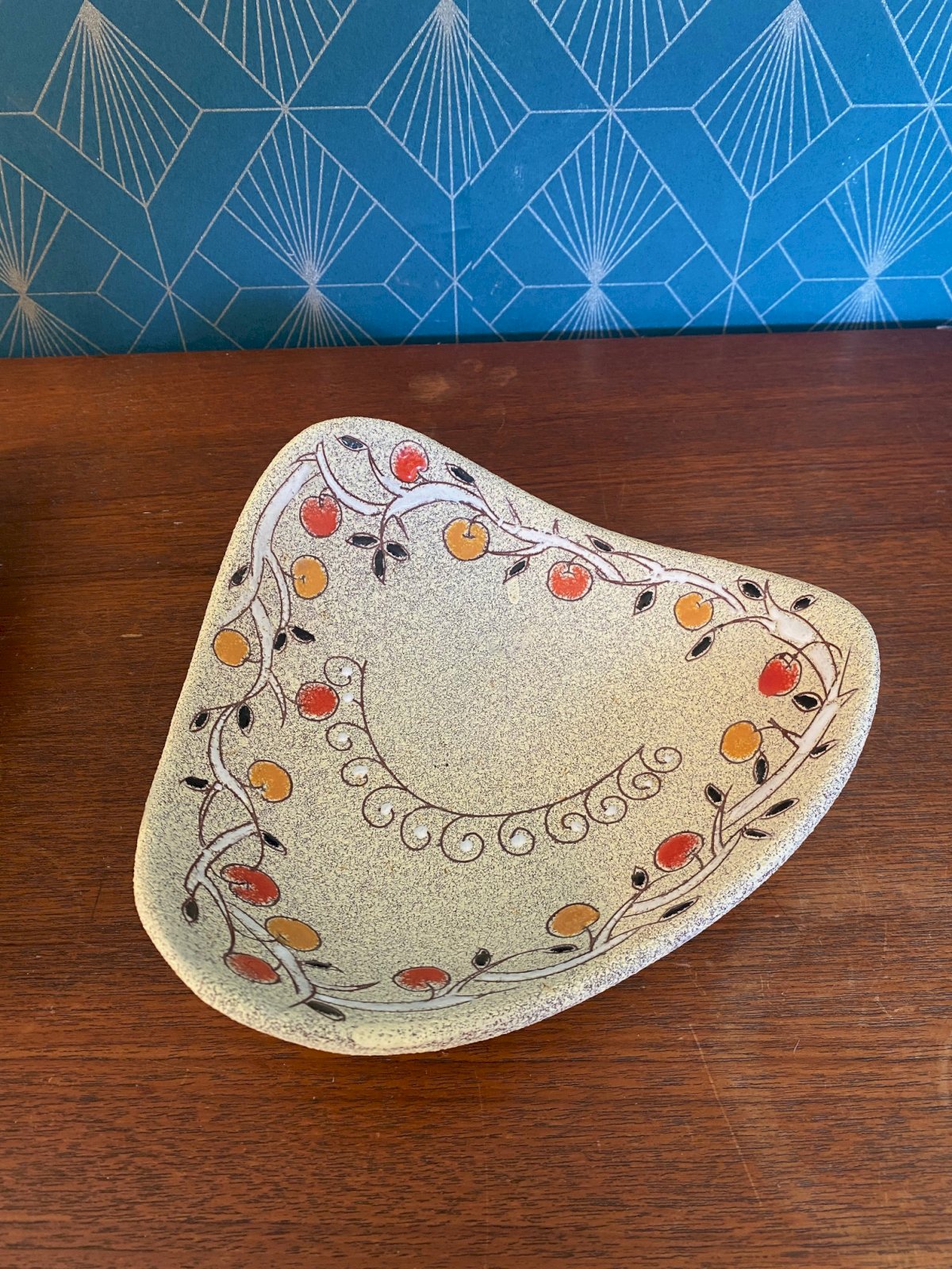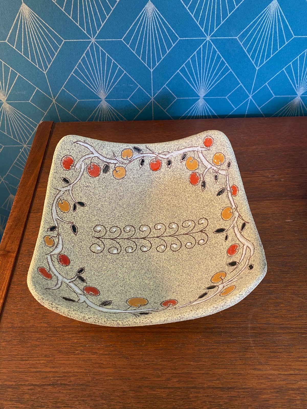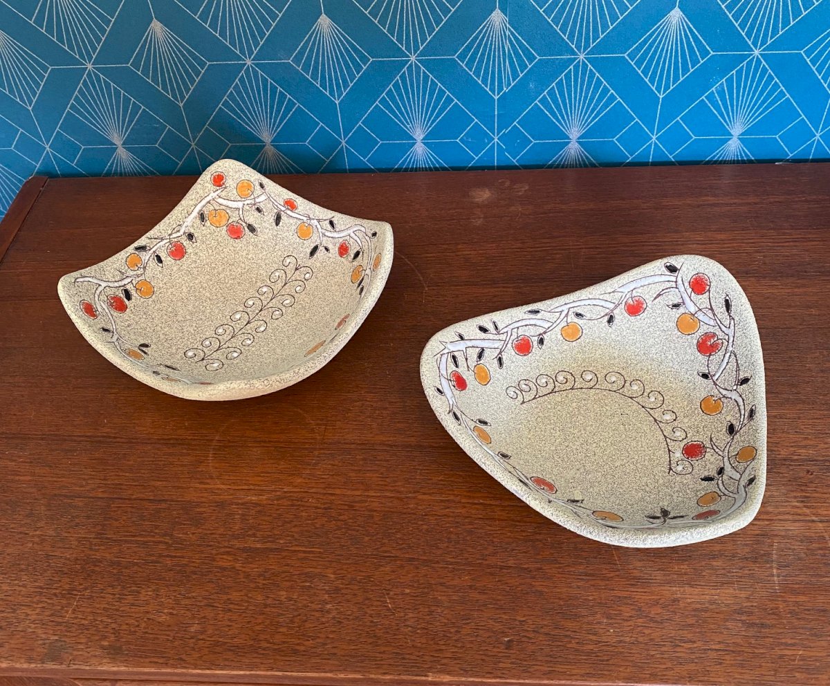 Two textured, multicolored glazed terracotta bowls, one triangular with rounded edges and the other square with rounded edges as well, featuring a decoration in the basin of a frieze of fruit branches centered with a stylized vegetal branch and enamel points. Romacréa school, a group of artists that became a factory and then an art workshop in 1950 in Rome. Unique pieces attributed to Fratelli Fanciullacci, measuring 21 cm for the first and 20x20 for the second. Great deal.