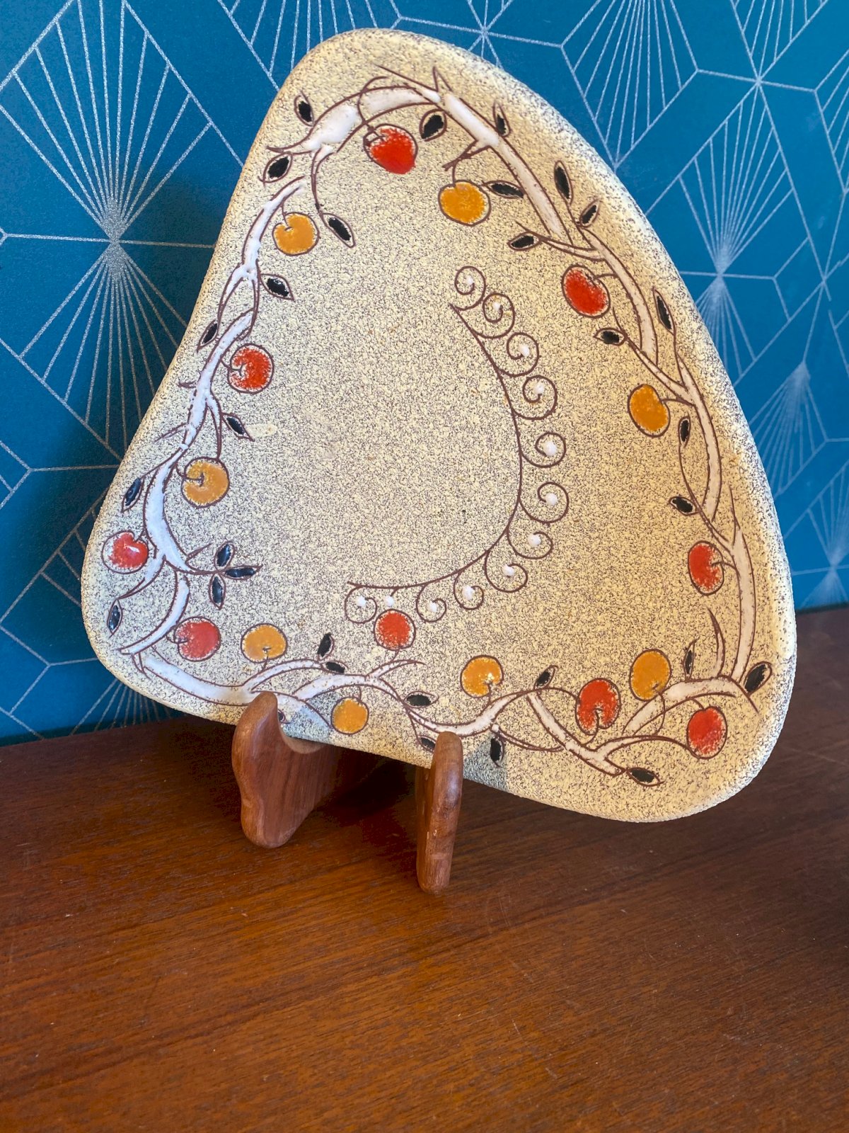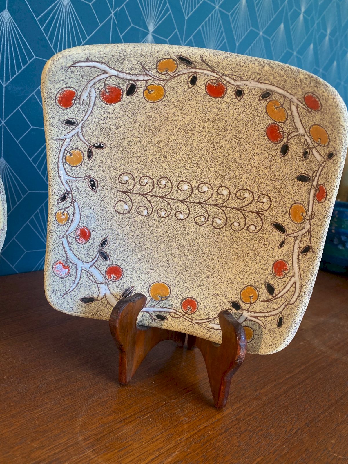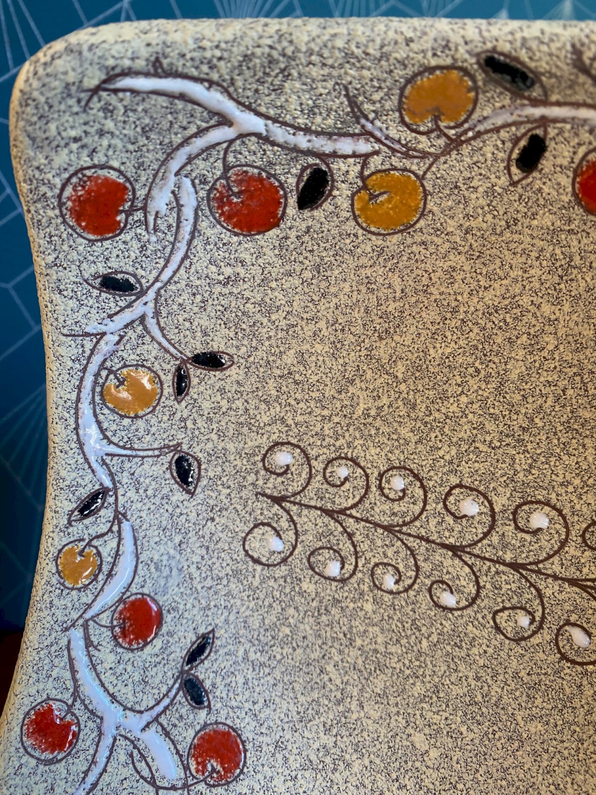 Two textured, multicolored glazed terracotta bowls, one triangular with rounded edges and the other square with rounded edges as well, featuring a decoration in the basin of a frieze of fruit branches centered with a stylized vegetal branch and enamel points. Romacréa school, a group of artists that became a factory and then an art workshop in 1950 in Rome. Unique pieces attributed to Fratelli Fanciullacci, measuring 21 cm for the first and 20x20 for the second. Great deal.