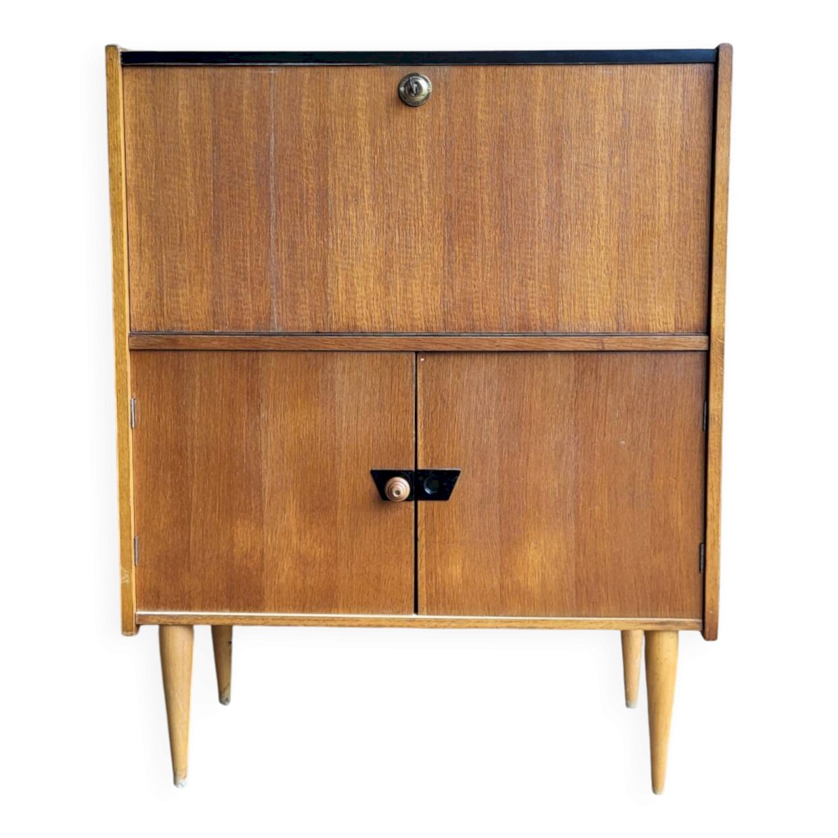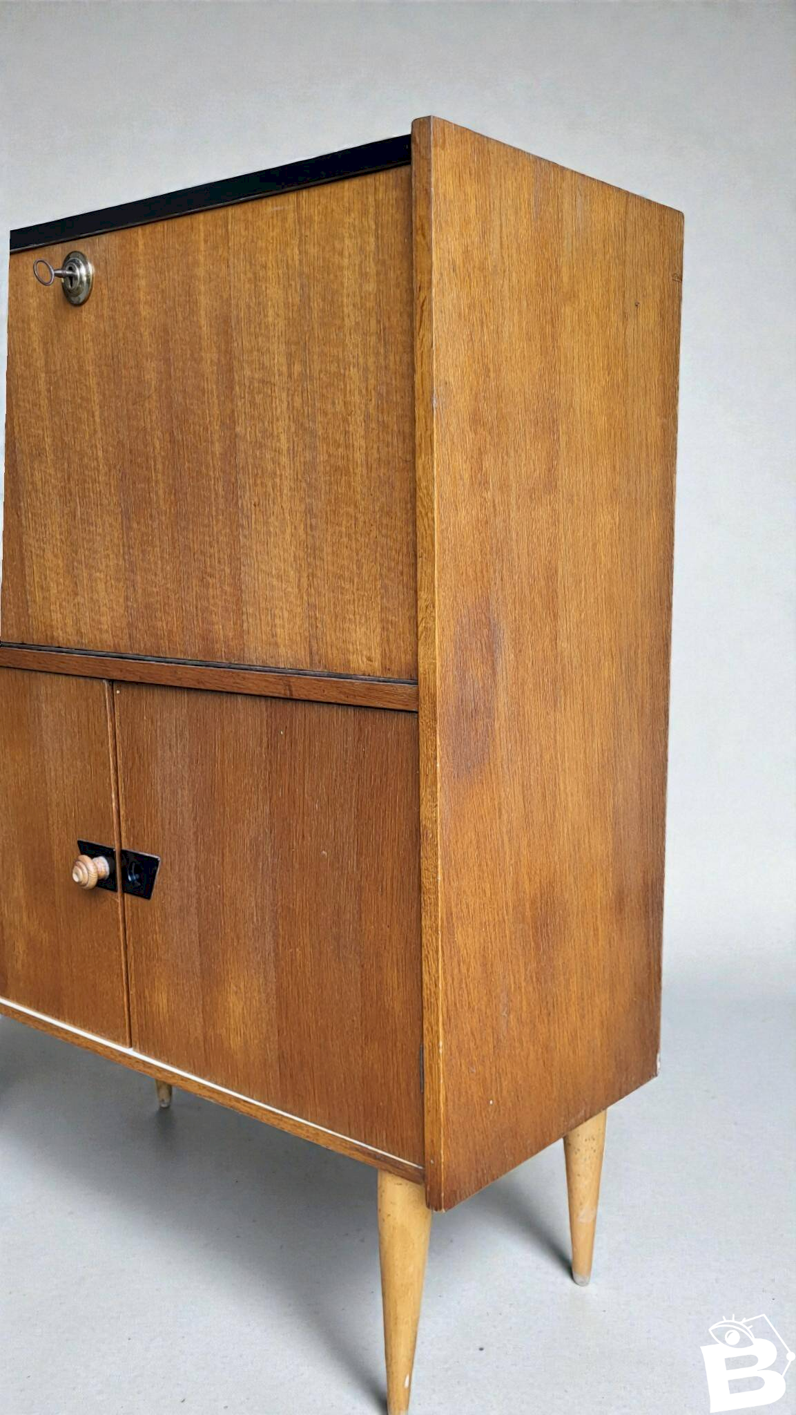 Secretary / storage unit from the 50s-60s / tapered legs / in the lower part, 2 doors / in the upper part, a drop-leaf serving as a secretary / integrated lighting (neon - untested) / central drawer. In good condition with usual signs of use and age. Note a veneer jump on the left edge. Height 107 cm, width 85 cm, depth 35.5 cm. L: 85 W: 35.5 H: 107
