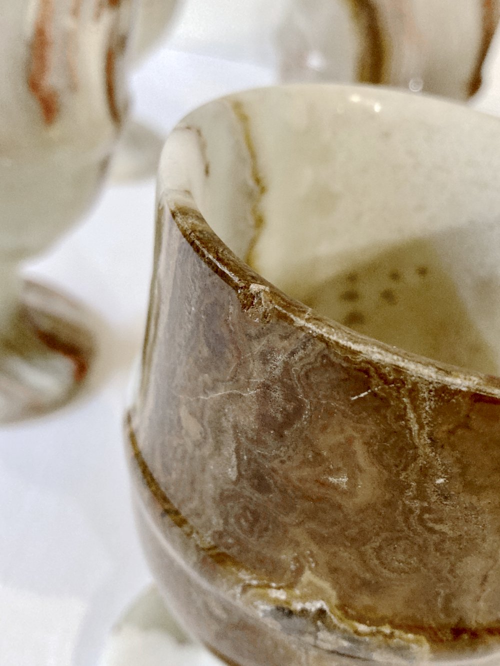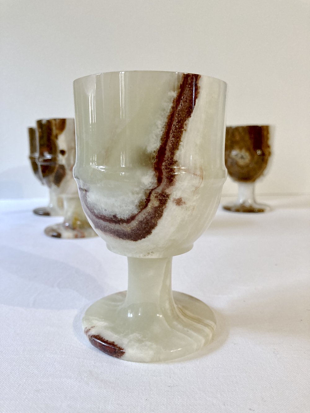 Sublime set of 6 glasses sculpted from alabaster, showcasing numerous color variations alternating between cream white, jade green, and chocolate brown.