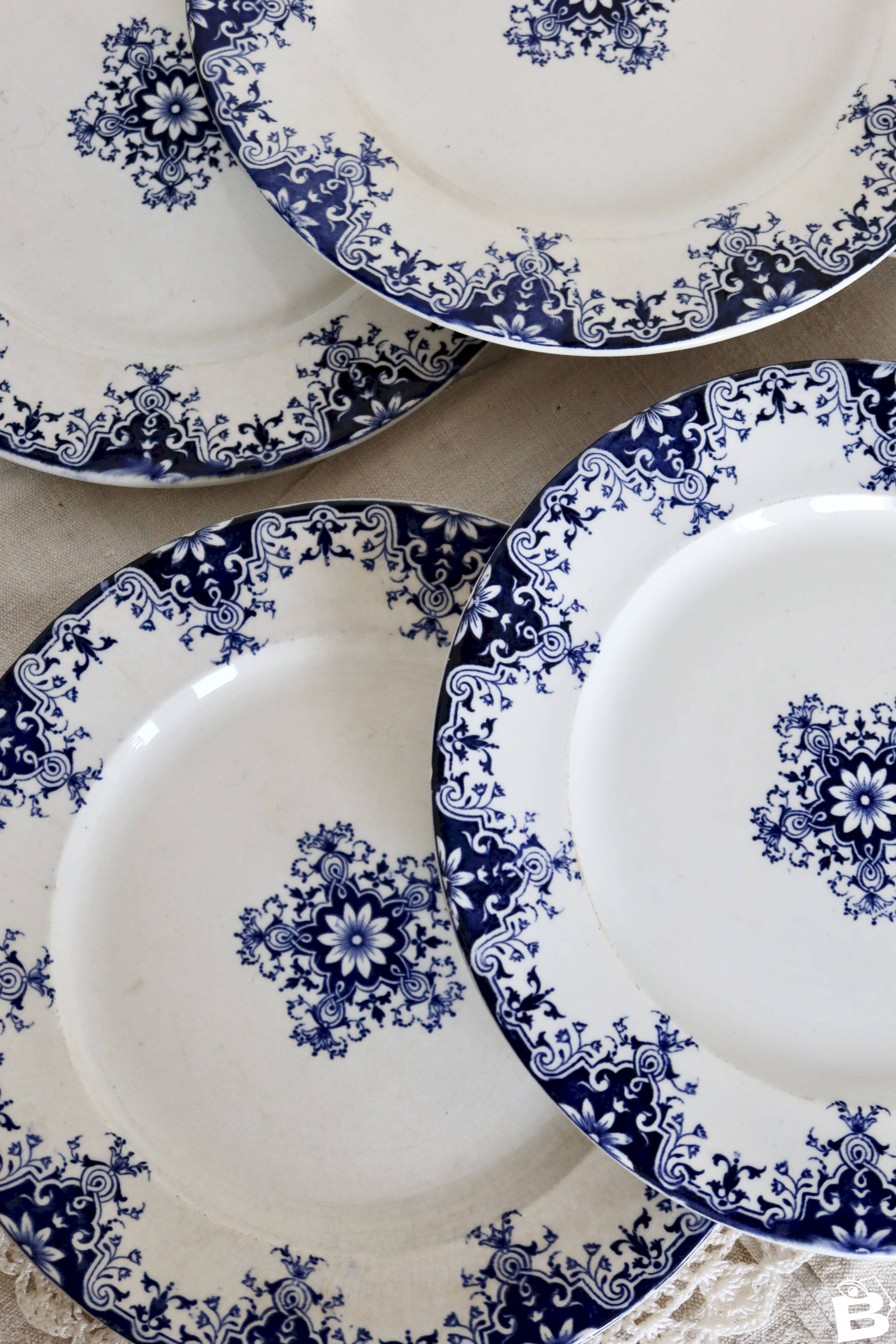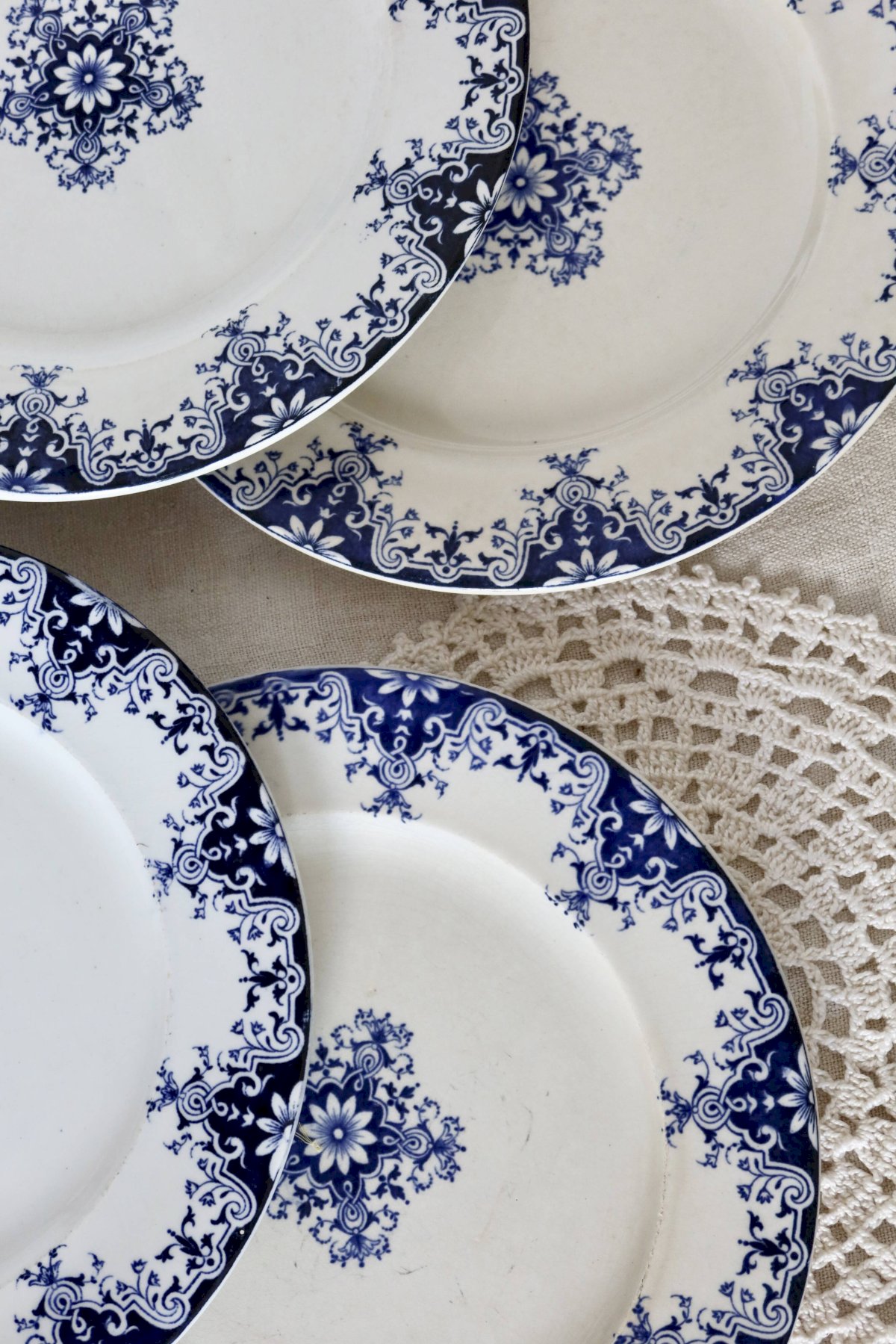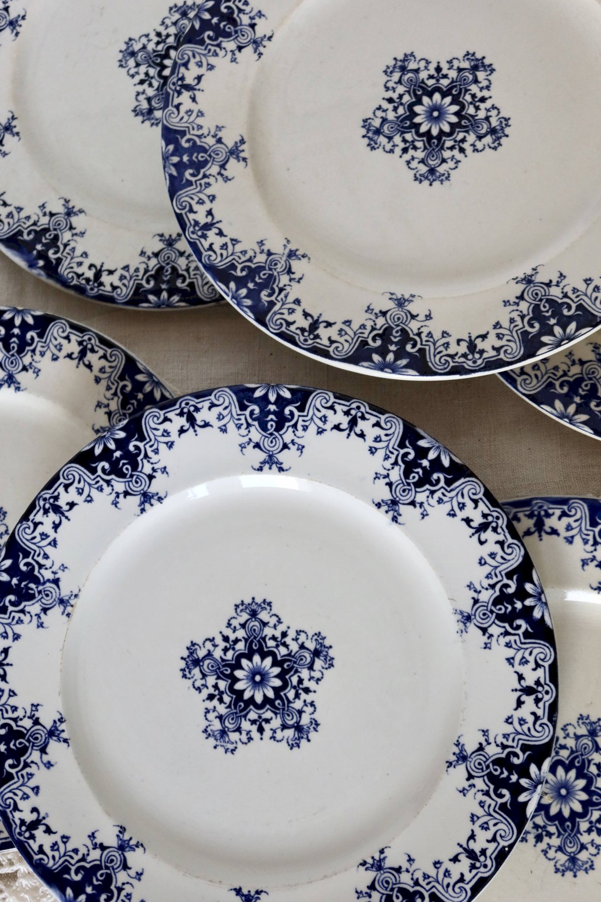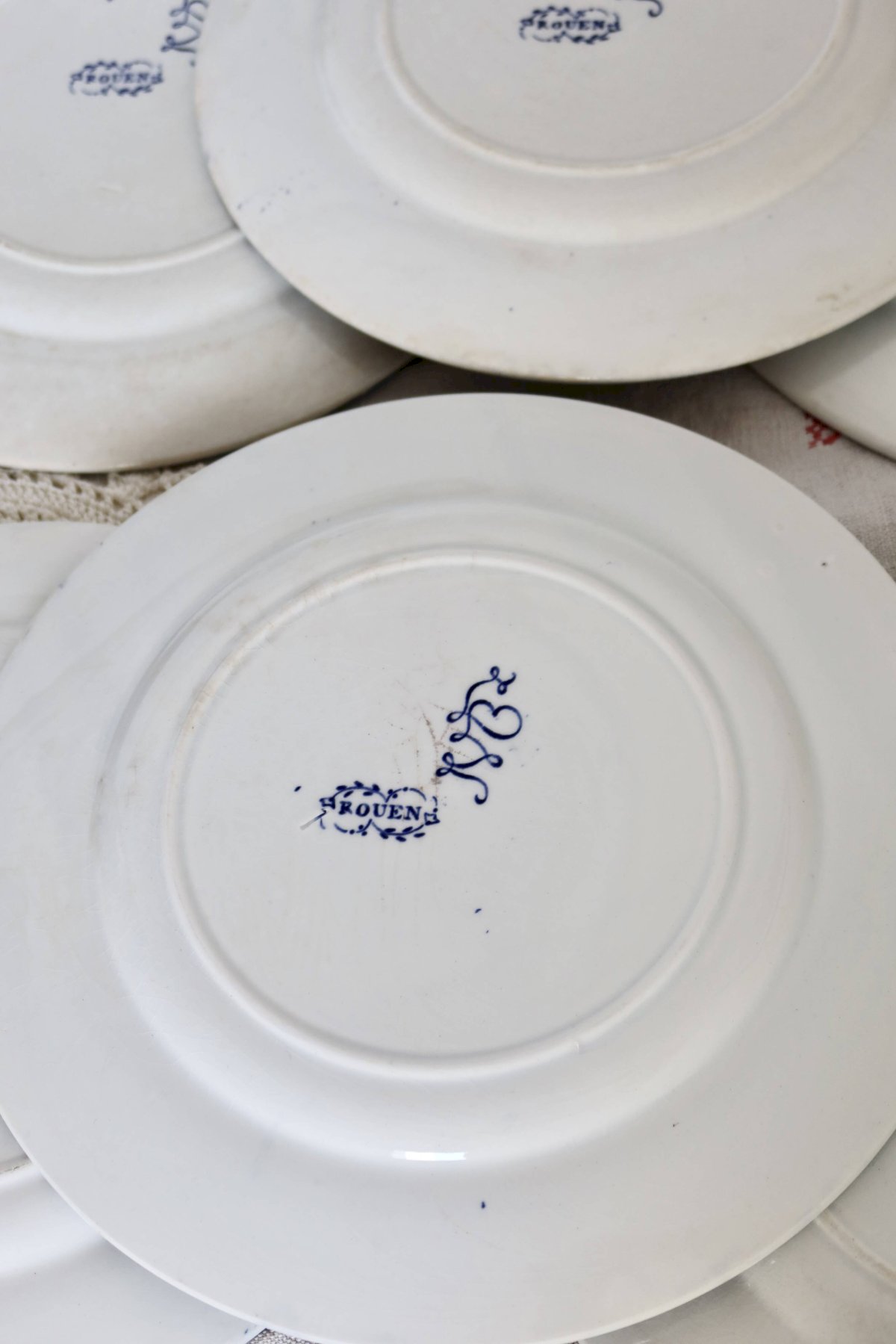 The Rouen model dates back to the late 19th century. The plates are in fair condition and show some signs of age, notably in the form of a lovely patina, marks on the edge, or slightly faded pattern colors.