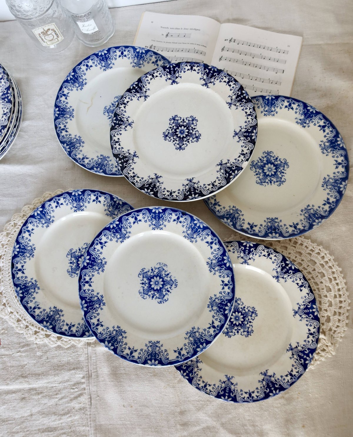 Beautiful set of 6 flat plates made of earthenware featuring a blue shade pattern on the rim and in the center.