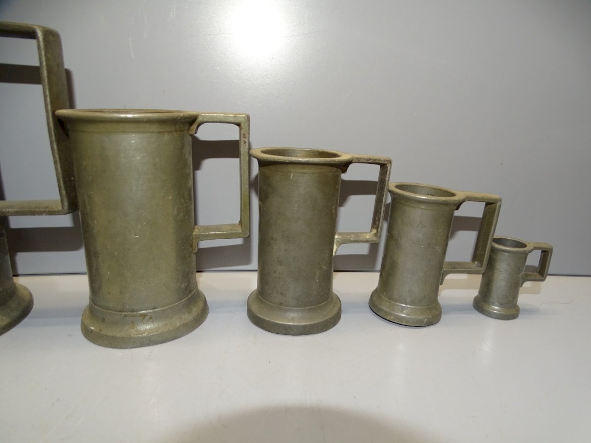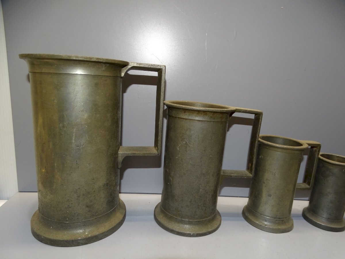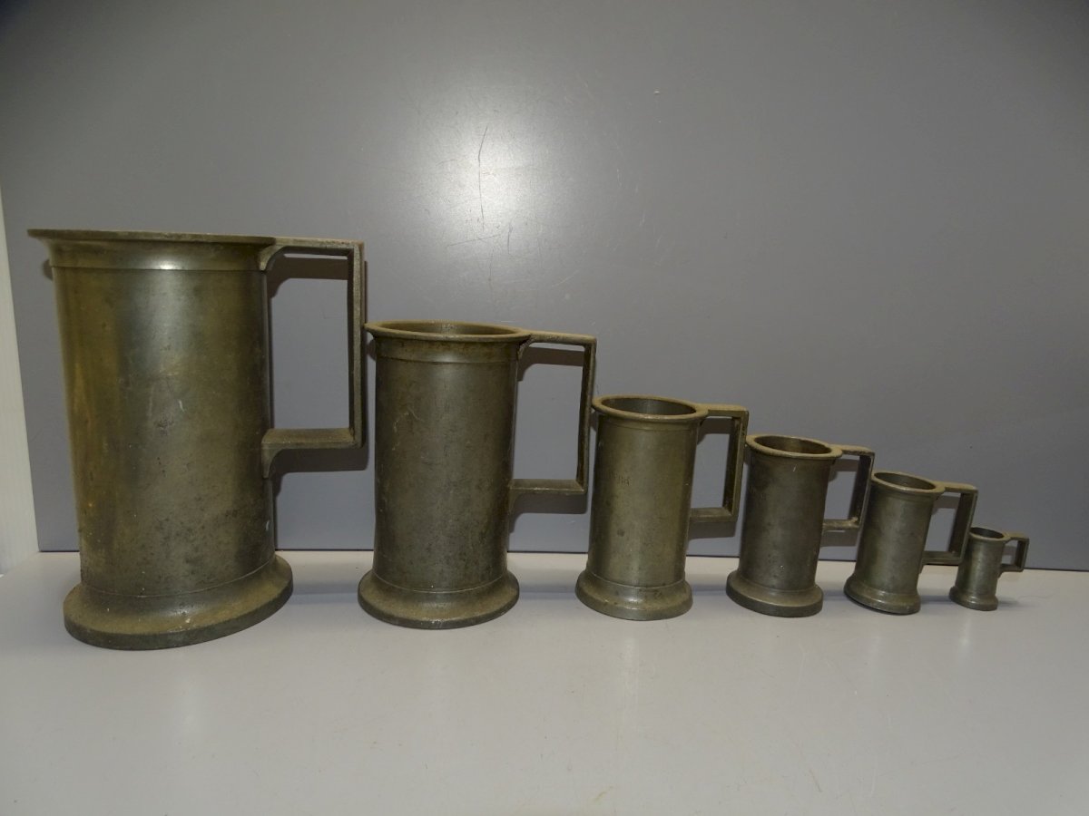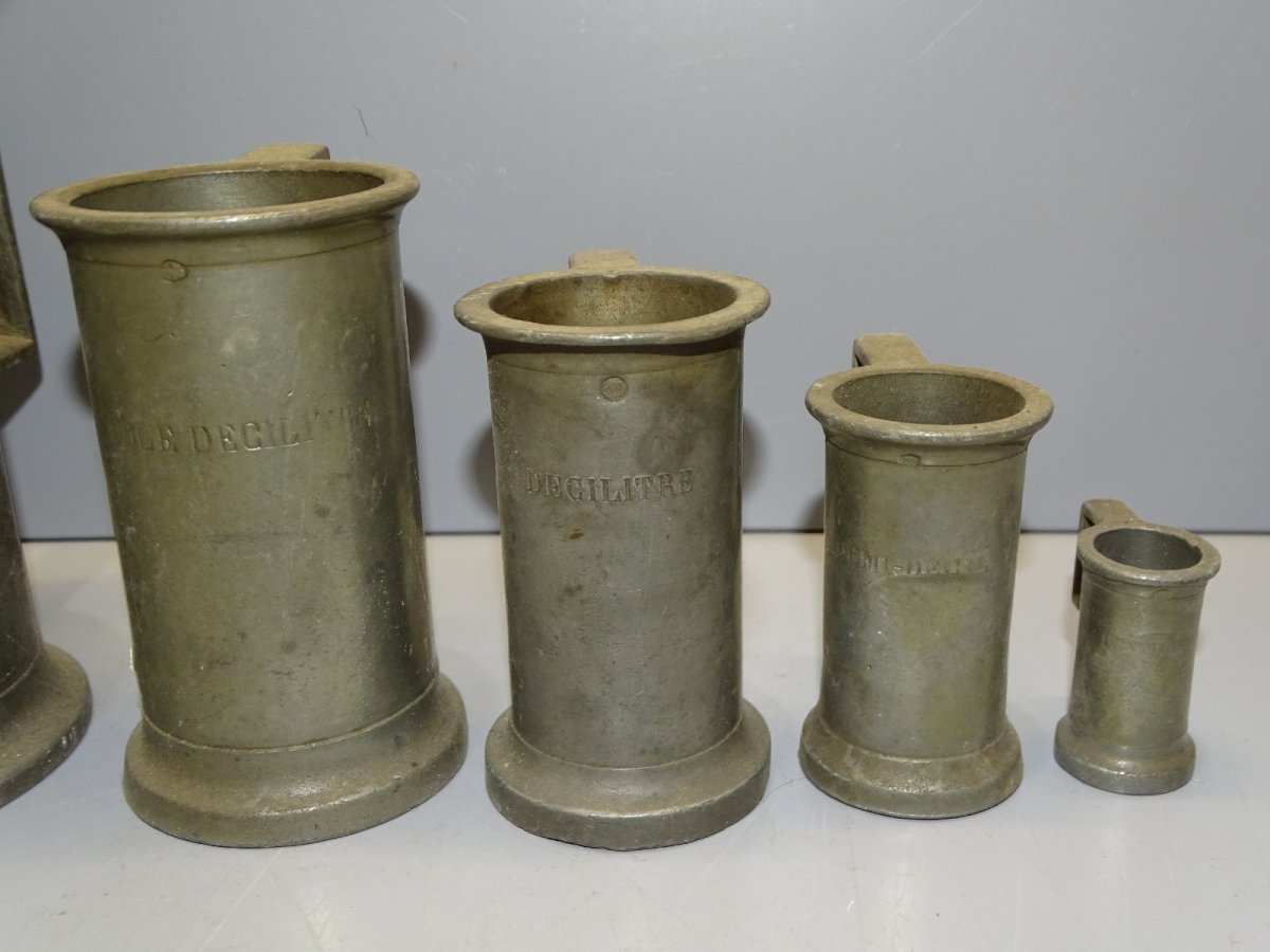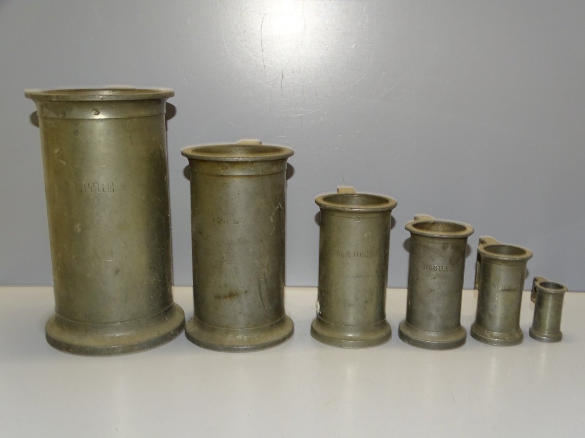 Set of 6 vintage measures in tin with wear and deformation - a trace of tin tallow at the bottom of one - (see photos) - finds juice, attic discoveries - in used condition - to be cleaned - Ref. 42141025/102 - Height from 4.3 cm to 18.6 cm - Weight 2.427 kg - SHIPPING via Mondial Relay OR Colissimo possible upon request - GUARANTEED very protective PACKAGING - THANK YOU for CAREFULLY LOOKING at ALL the PHOTOS as THEY ARE AN INTEGRAL PART of the DESCRIPTION and ALLOW you to SEE the ITEM BEST - Material: Tin