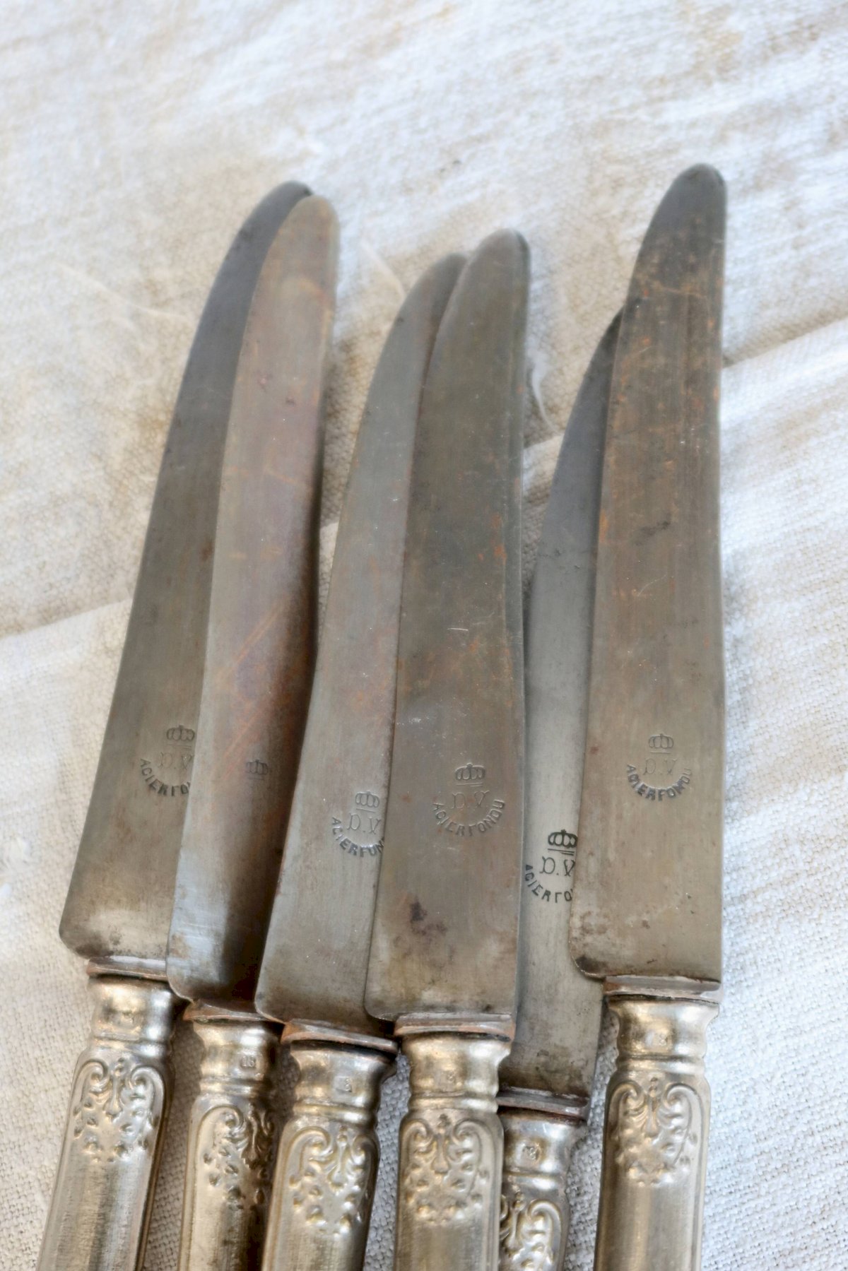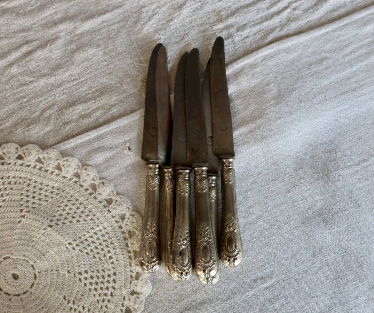 Beautiful used patina with traces of oxidation on the blades, micro-scratches, and pitting consistent with age (blades to be revived / polished if desired); a coherent set ready for a vintage table or decor. Dimensions: 24cm. L: 24 W: 1 H: 1