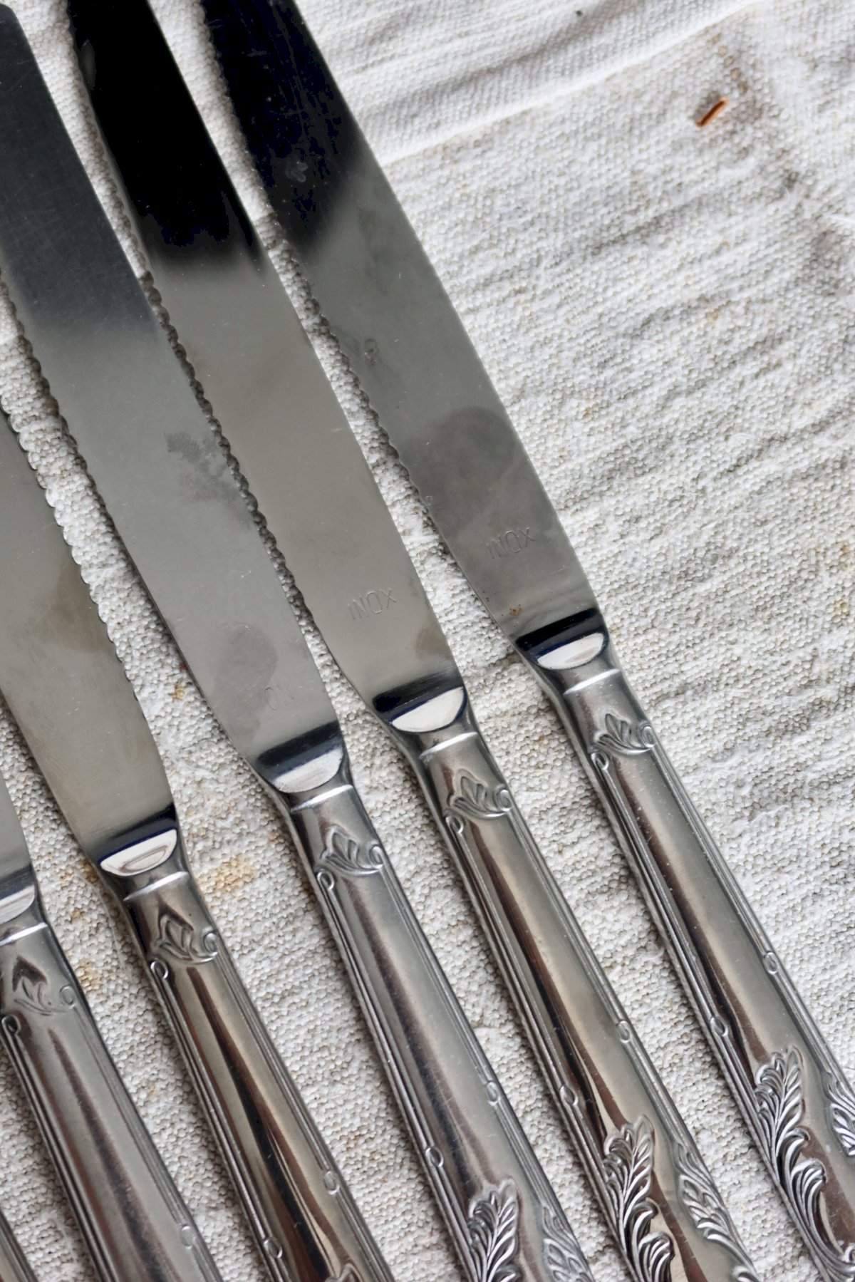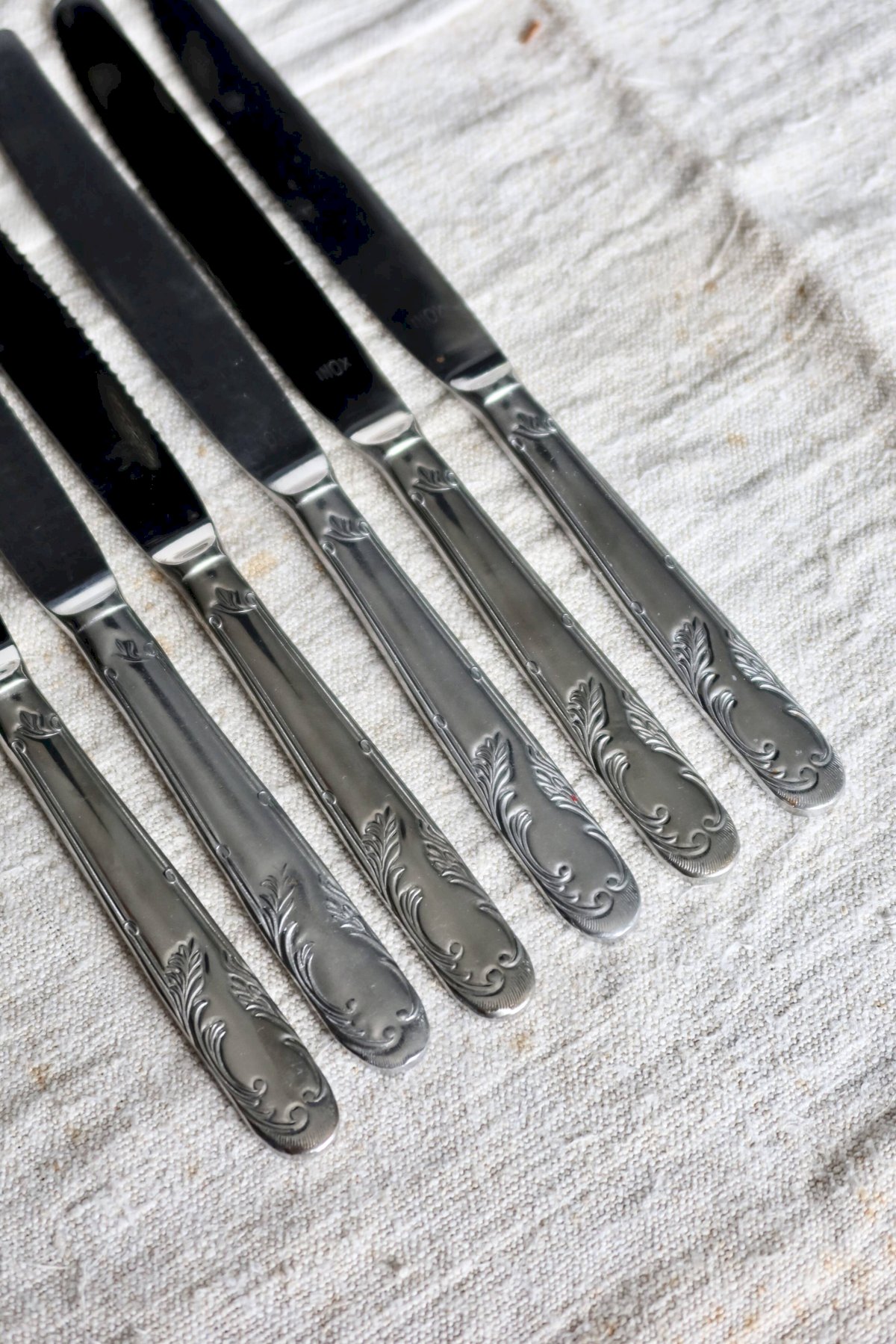 Set of six vintage stainless steel knives with delicately engraved leaf decoration on the handles, elegant and timeless.