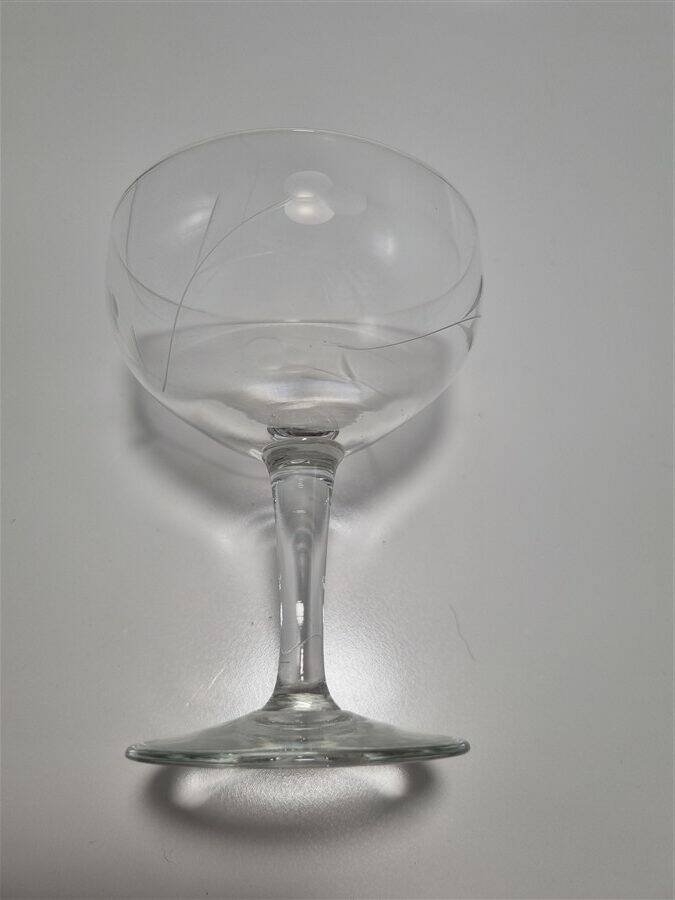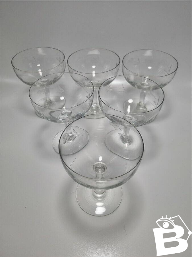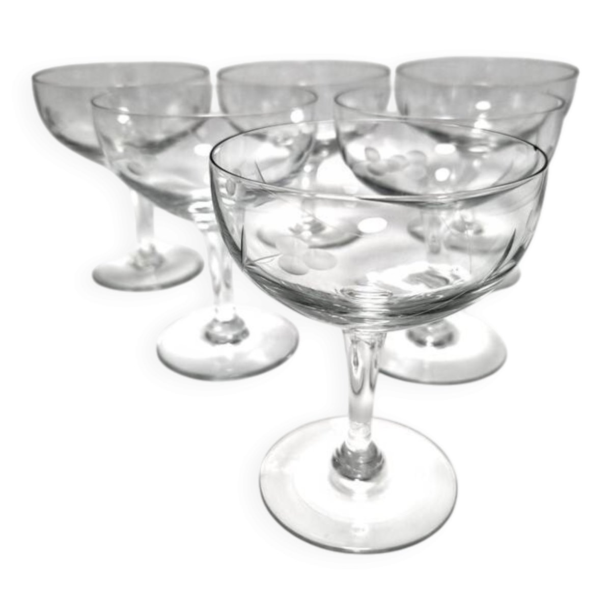 Set of 6 vintage champagne glasses, floral decoration. 3 lots of 6 glasses available, in the last lot, one glass has a tiny imperfection visible in the photo. Price for one lot of 6: €49. Dimensions: h 11.2 X w 8.6 cm. Weight of one lot of 6: 660 g. L: 8 W: 8 H: 11