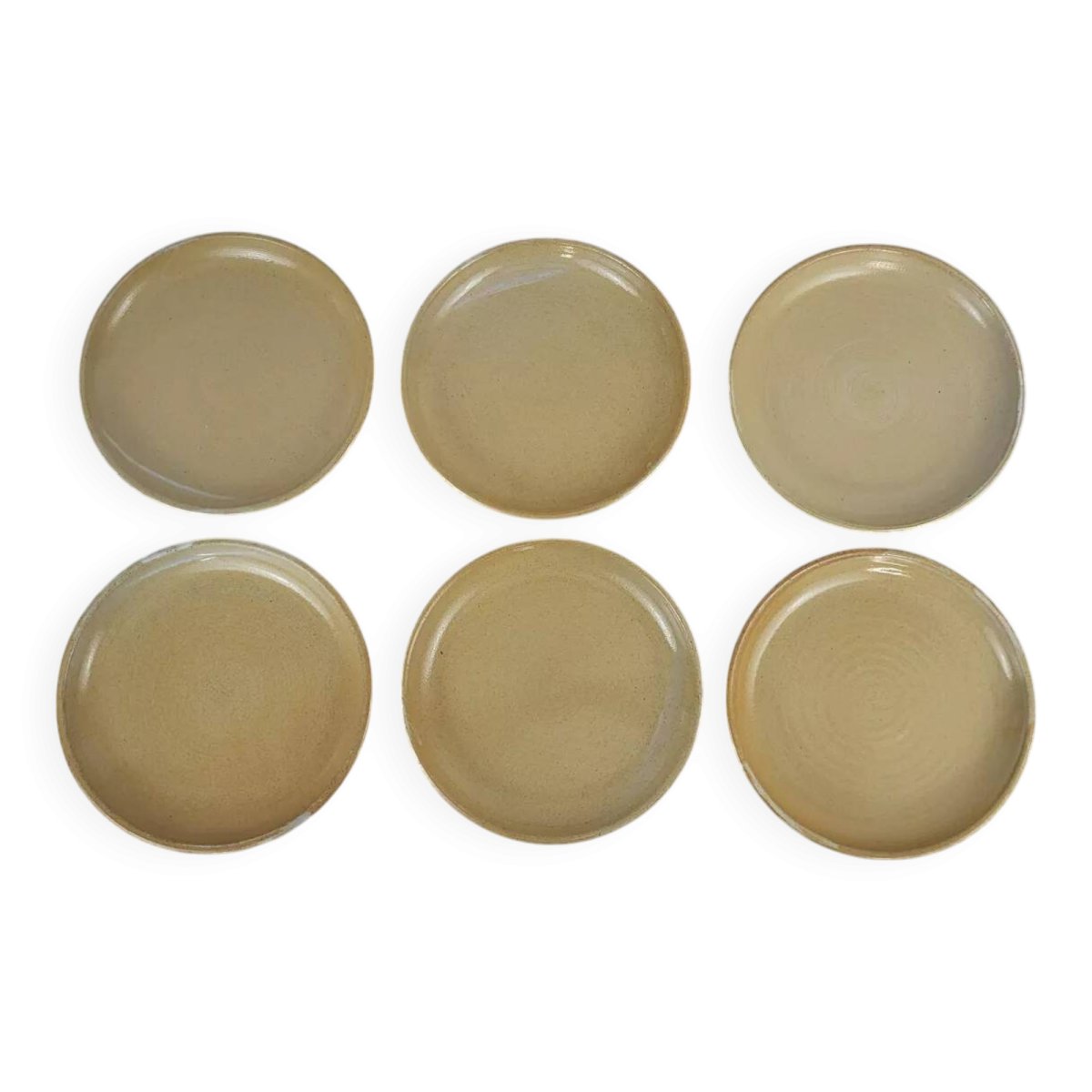 Set of 6 dessert plates in stoneware / slight rim / origin: Puisaye, pottery by Daniel Auger (1929-2019), turner in Accolay, in Saint-Amand-en-Puisaye. Diameter 18 cm. Height 1.5 cm. Handmade.