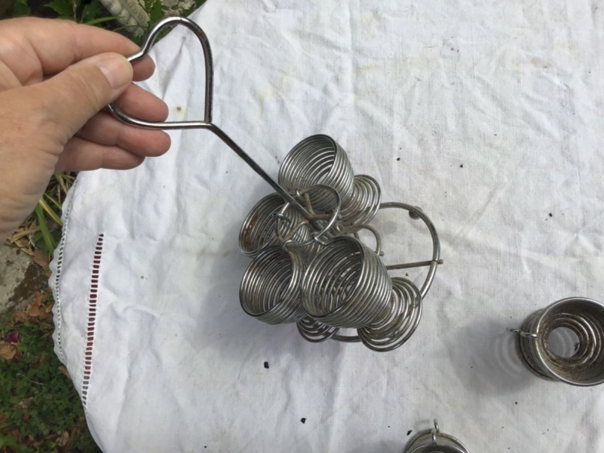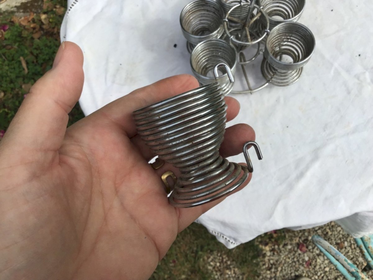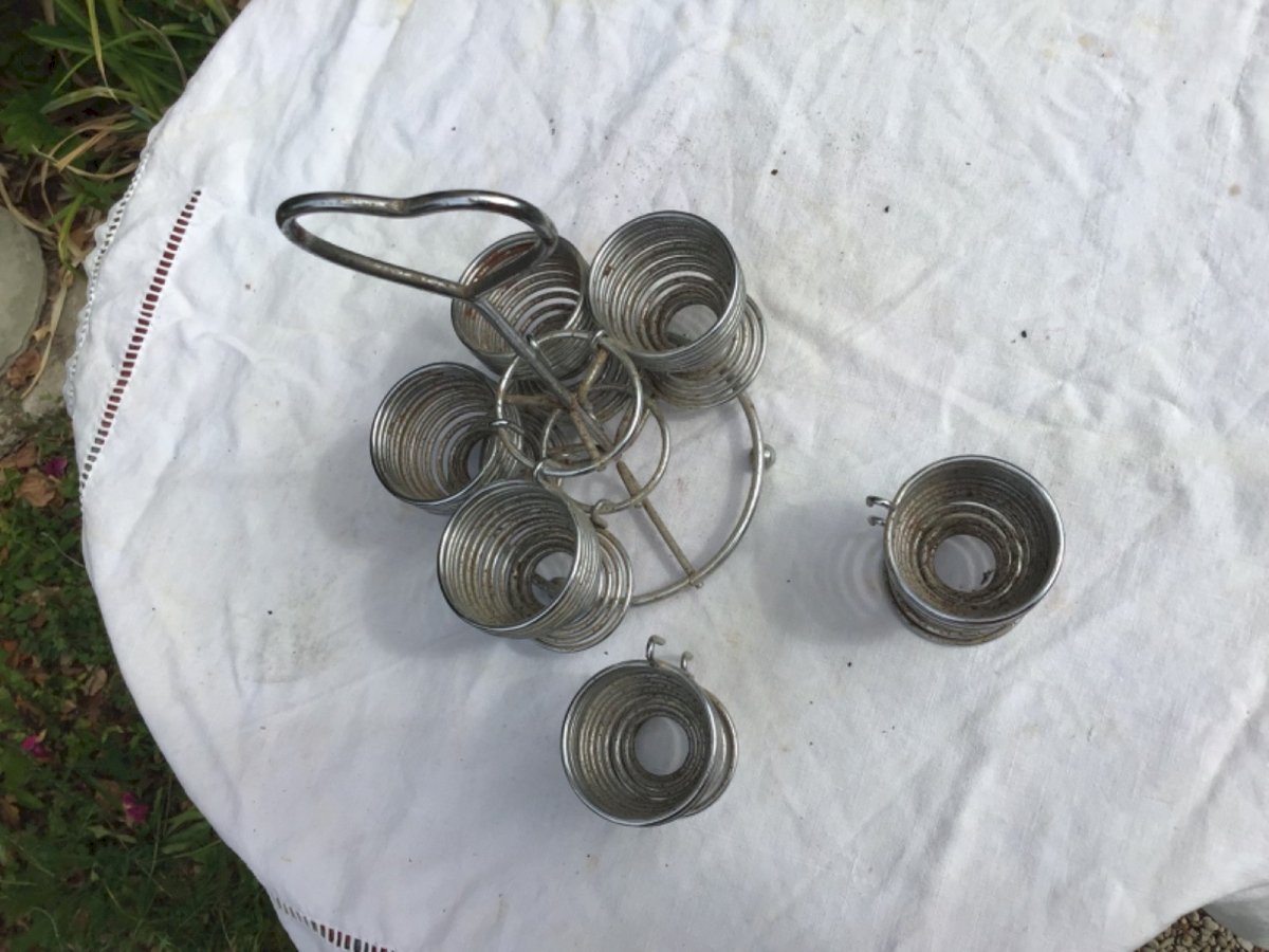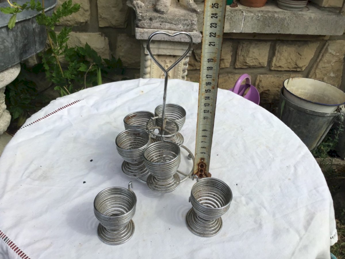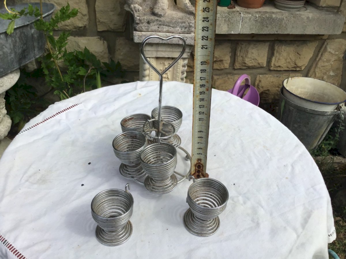 Vintage egg display Bistro counter In vintage metal from the 60s In perfect condition Color: Gray Number of pieces: 6 Type: EGG CUP Period: 1960s Material: Metal