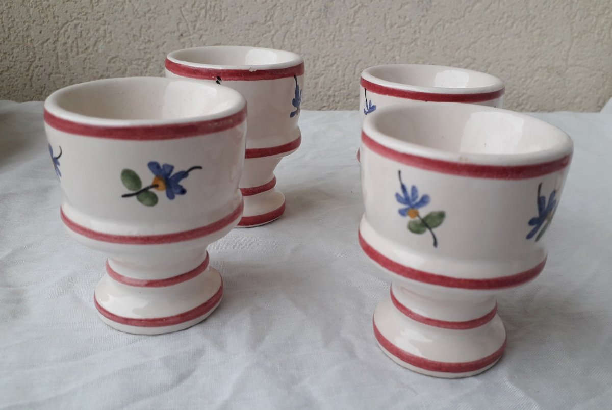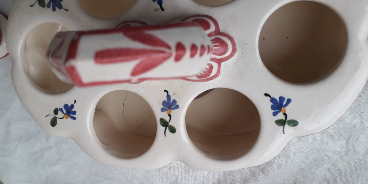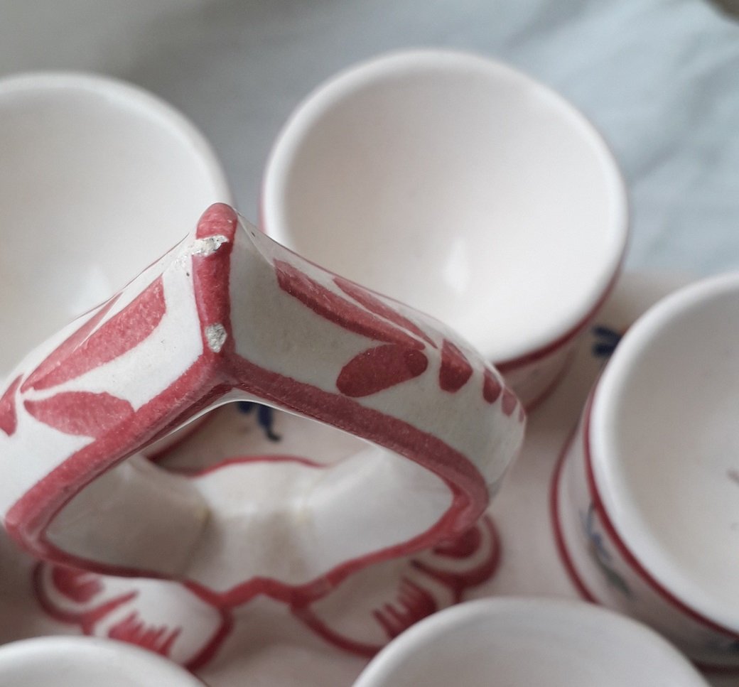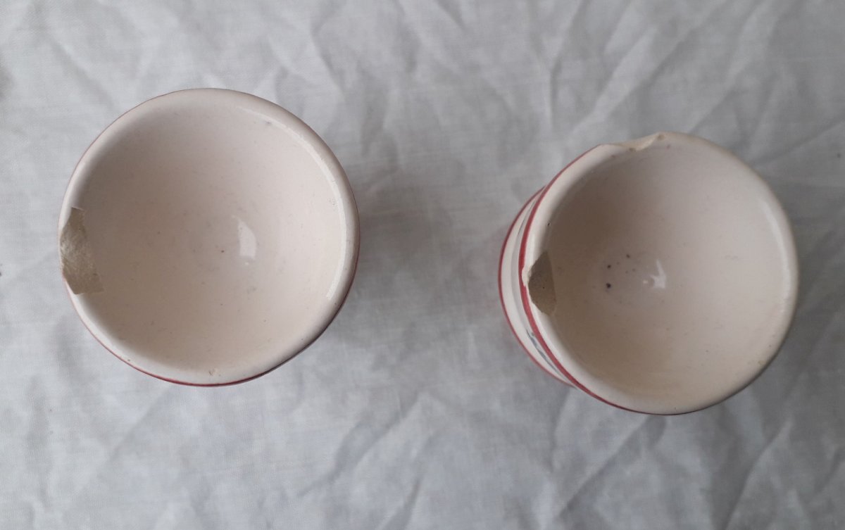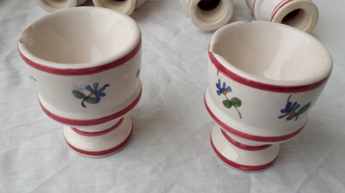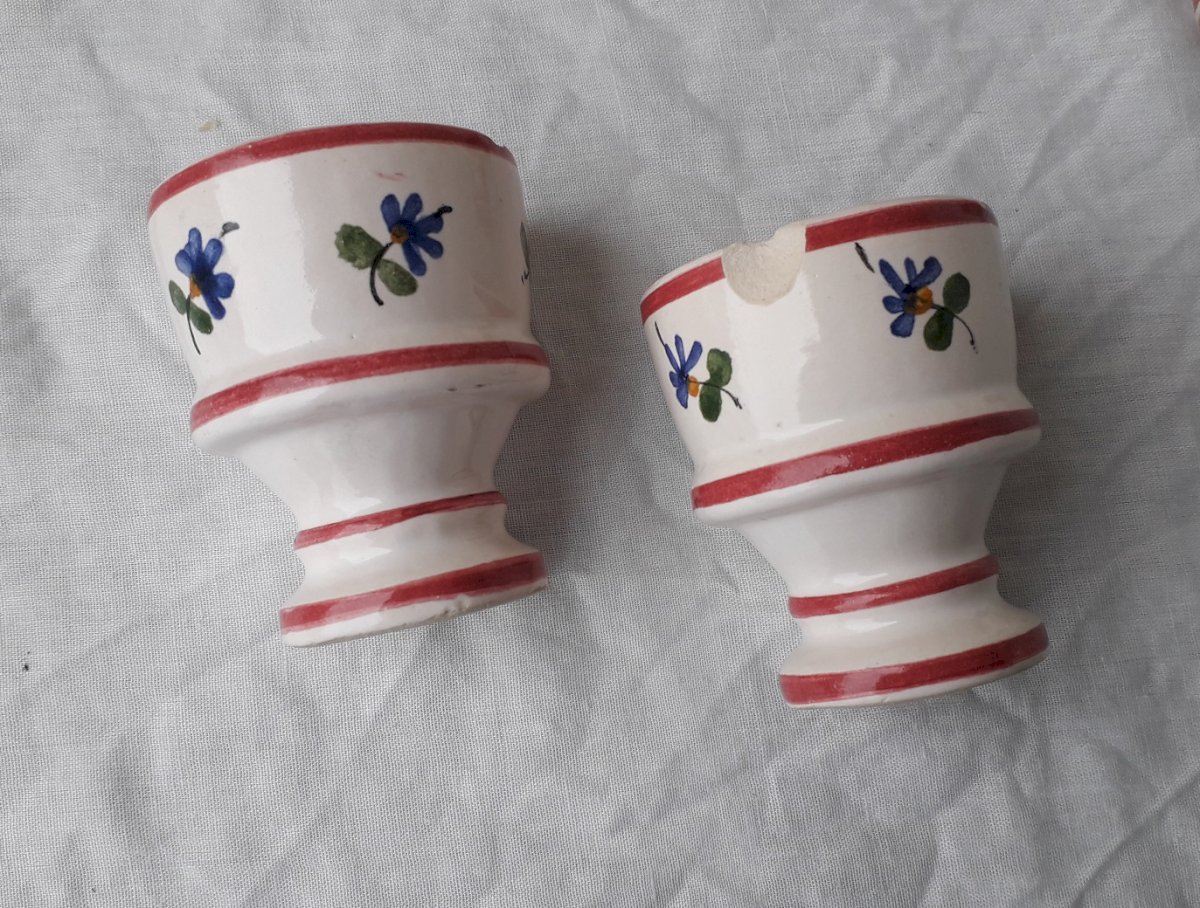Condition: used, reattached handle, two egg cups with chips (see photos).