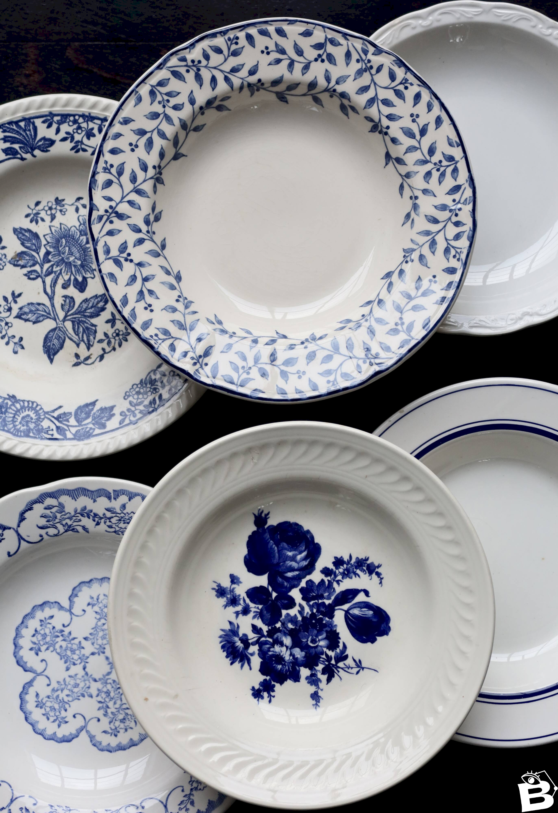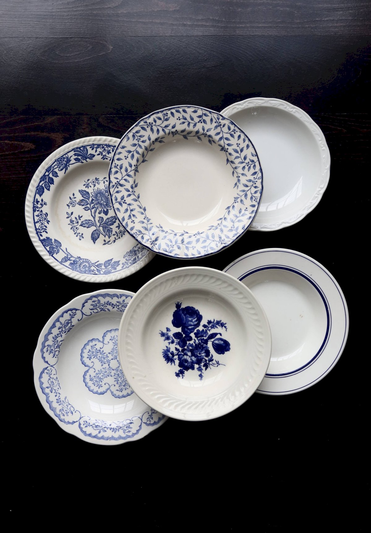 Beautiful set of 6 mismatched deep plates in blue and white shades.