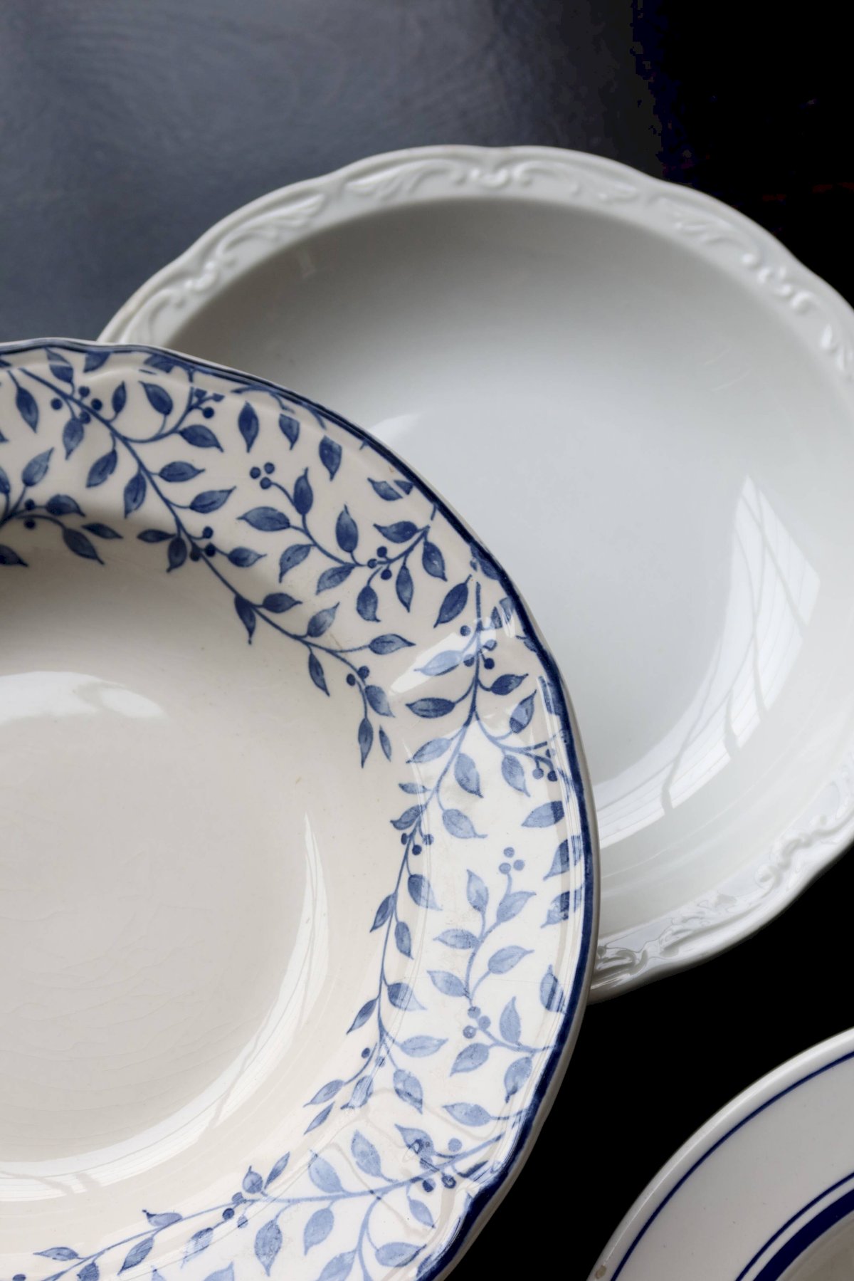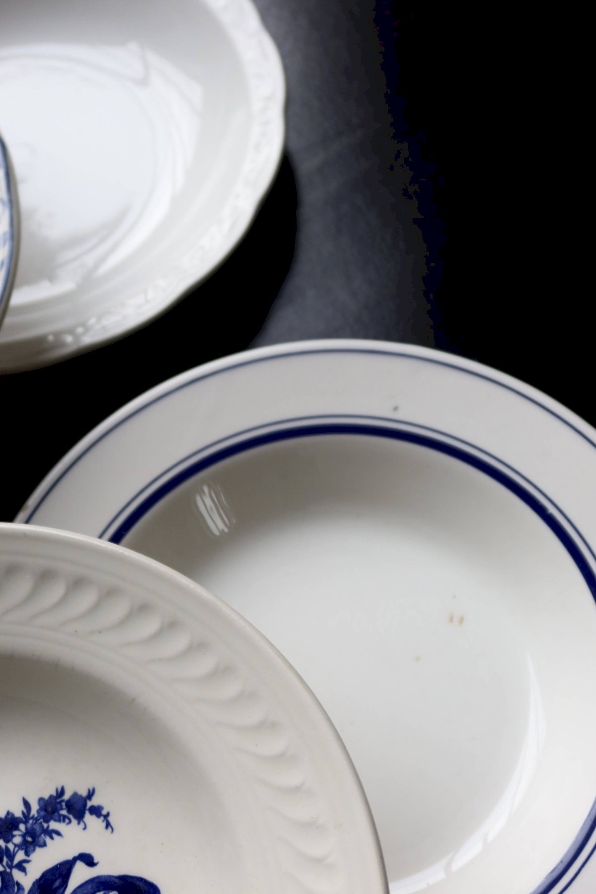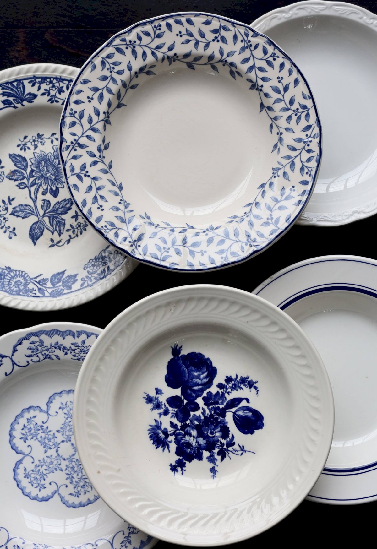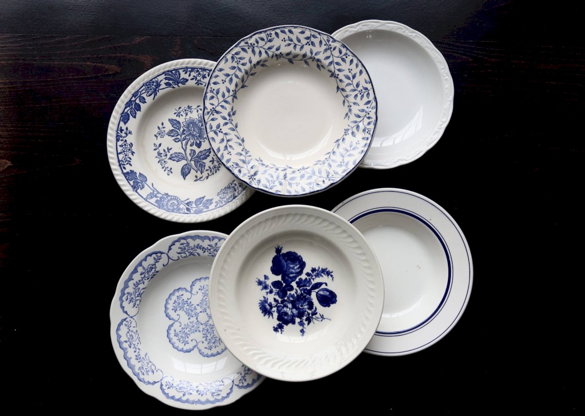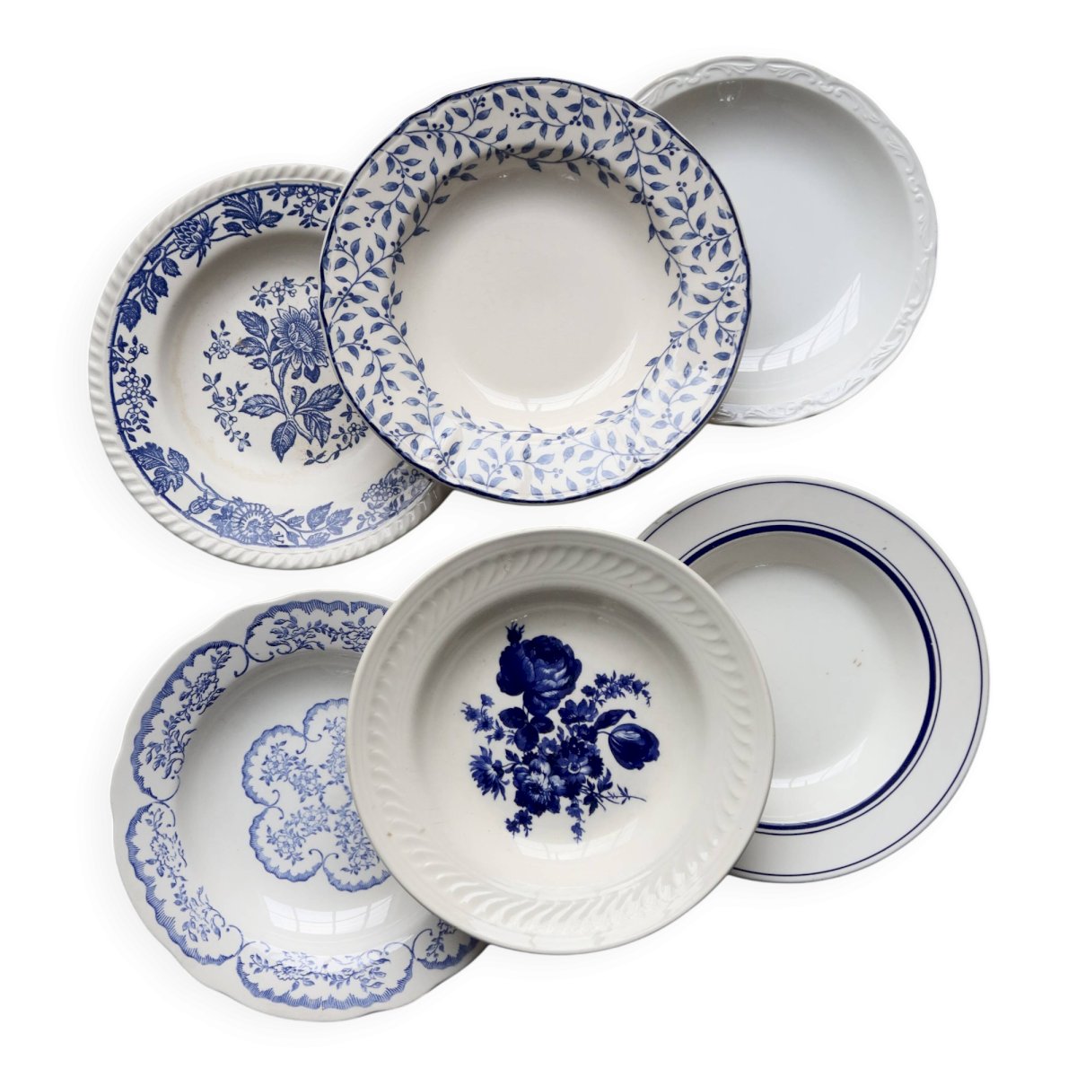 6 mismatched vintage blue and white porcelain soup plates - Lot Ceramic
