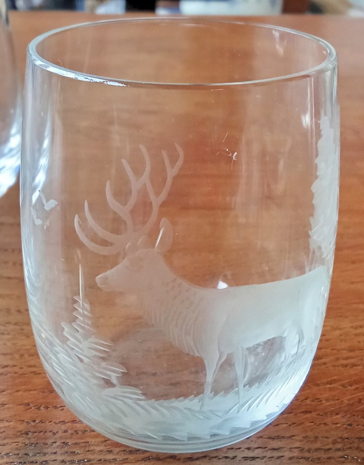 Set of 6 Vintage Glasses Beautiful engraved decoration Hunting Deer pheasant doe wild boar duck Good condition Height 8 cm Diameter drinking 5.5 cm Subtype: Hunting Type: Craft object Material: Glass