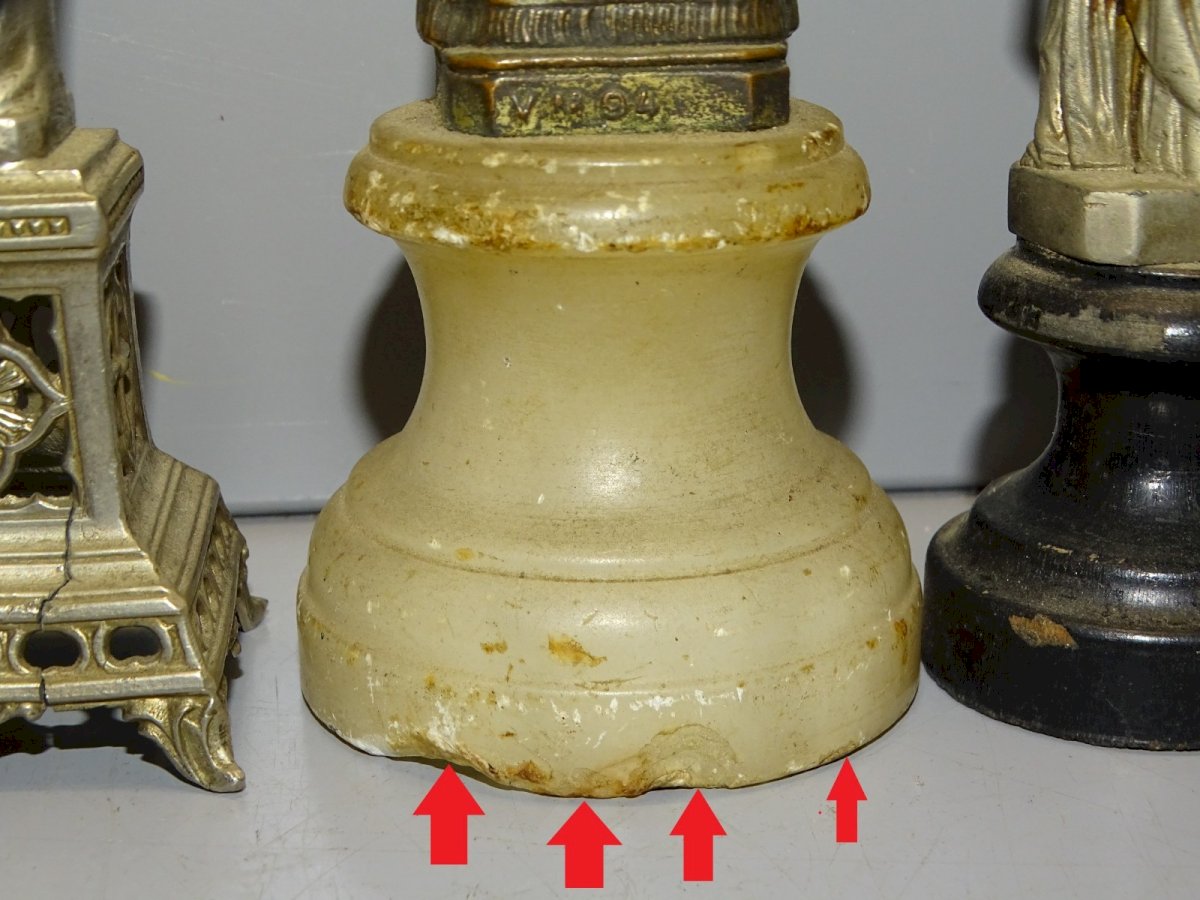 6 Ancient Statues of the Virgin Mary in time-patinated cast metal, including 2 with bases: 1 in blackened wood, 1 in alabaster (with wear on the edges and chips at the foot) - 1 souvenir from Lourdes - 1 base in cast metal with a crack - in their found condition, in good usable state (see photos) - Ref. 1V240718/334 BIS - The tallest Height 12.2 cm base 5.2 cm - The smallest Height 7.8 cm Length 27 cm - Weight 601 g - To contact me my email address: SHIPPING POSSIBLE WITH MONDIAL RELAY or COLISSIMO upon request VERY GOOD PACKAGING GUARANTEED THANK YOU for CAREFULLY LOOKING AT ALL the PHOTOS as THEY ARE AN INTEGRAL PART of the DESCRIPTION and ALLOW YOU TO SEE the OBJECT AS BEST AS POSSIBLE with ITS POTENTIAL SMALL DEFECTS - Condition: Used: Item has been used. Please refer to the seller's description for more details... Used: Item has been used. any potential imperfections.