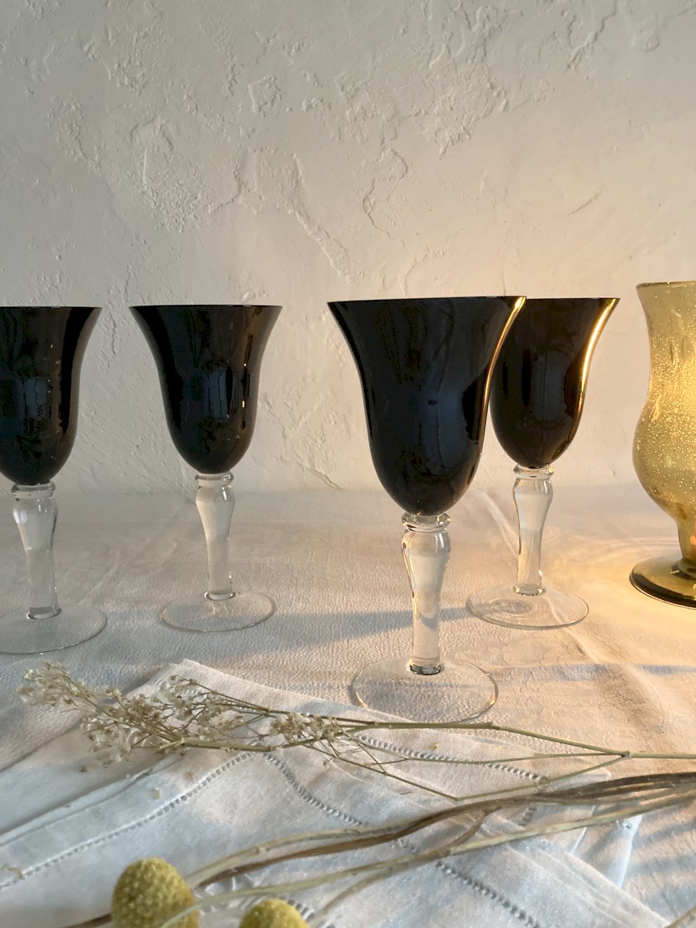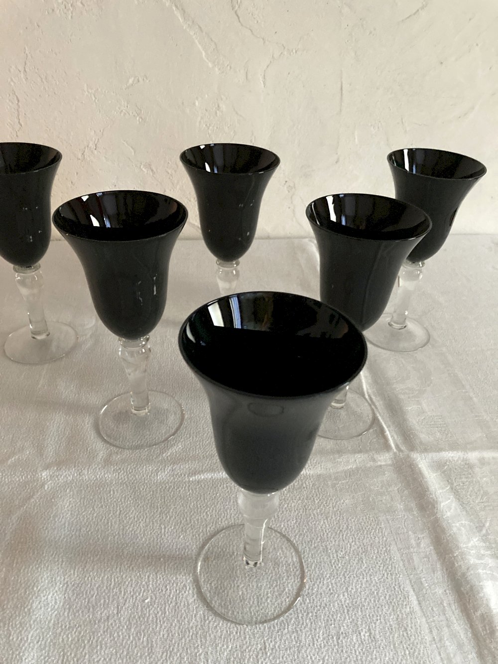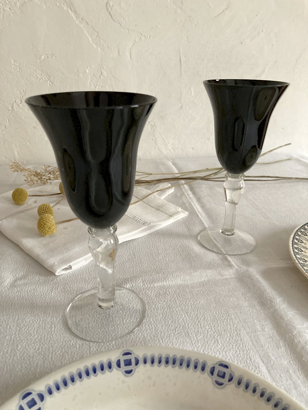 Here is a service of stem glasses with a very refined graphic play of contrasts. Transparent glass stems and black tinted glass bowls.