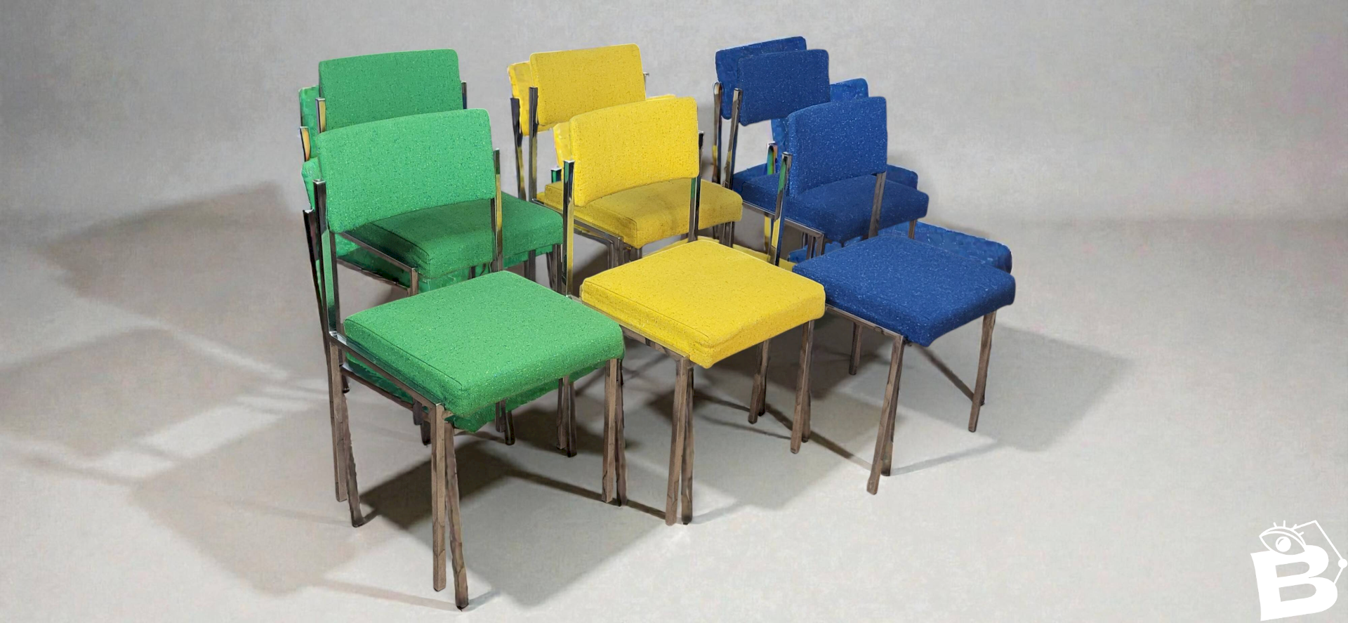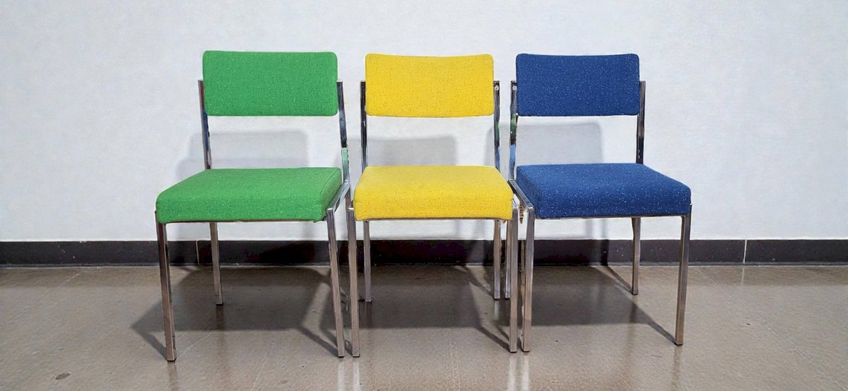 6 Strafor chairs from the 1970s. Set of 6 chairs from the Strafor brand from the 70s. Metal frame with a square section. Backrests and seats made of "foam" covered with colorful vintage fabric. The set is in good condition.