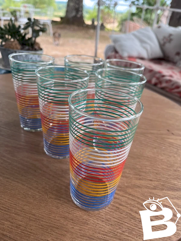 6 vintage 70's orangeade glasses in enamelled glass with stripes in 5 different colors.