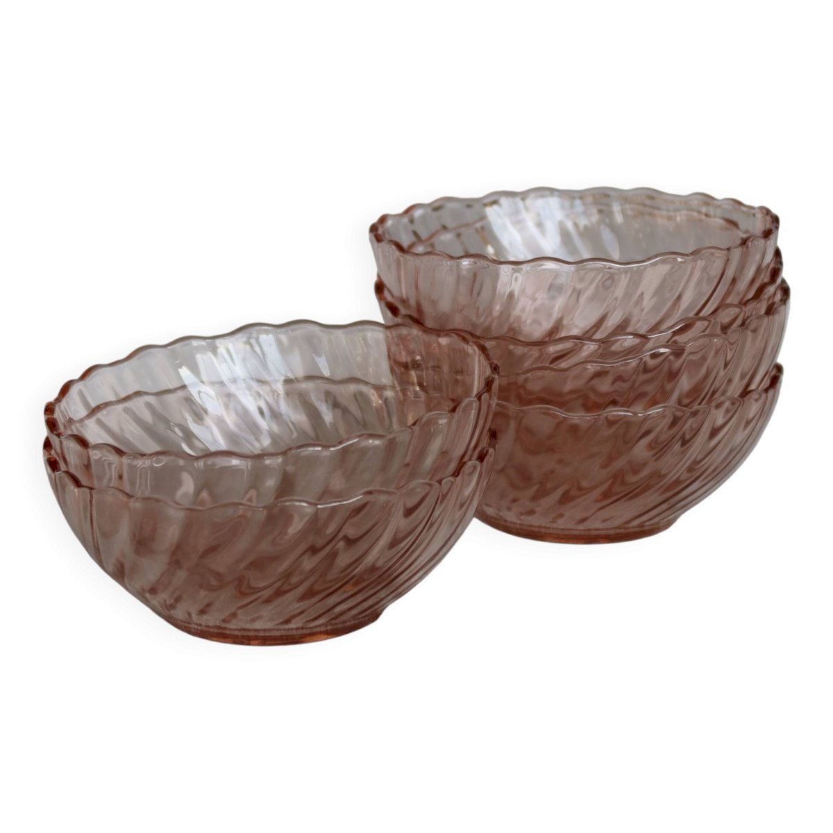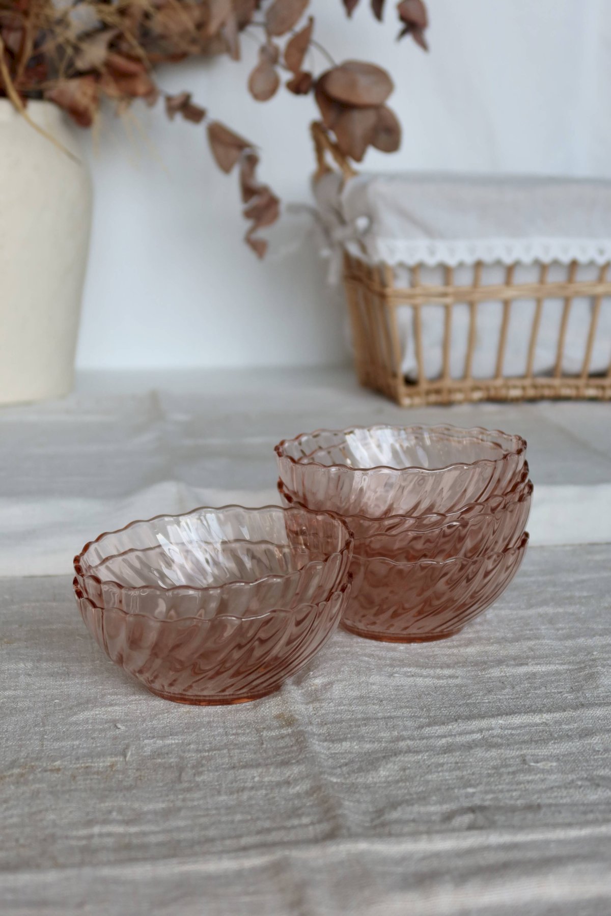 Icon of vintage and warm French tableware, these Rosaline bowls in pressed pink glass feature the characteristic twisted shape and wavy rim, offering a lovely powdered transparency. Dimensions: 12cm X 4cm. L: 12 W: 12 H: 4