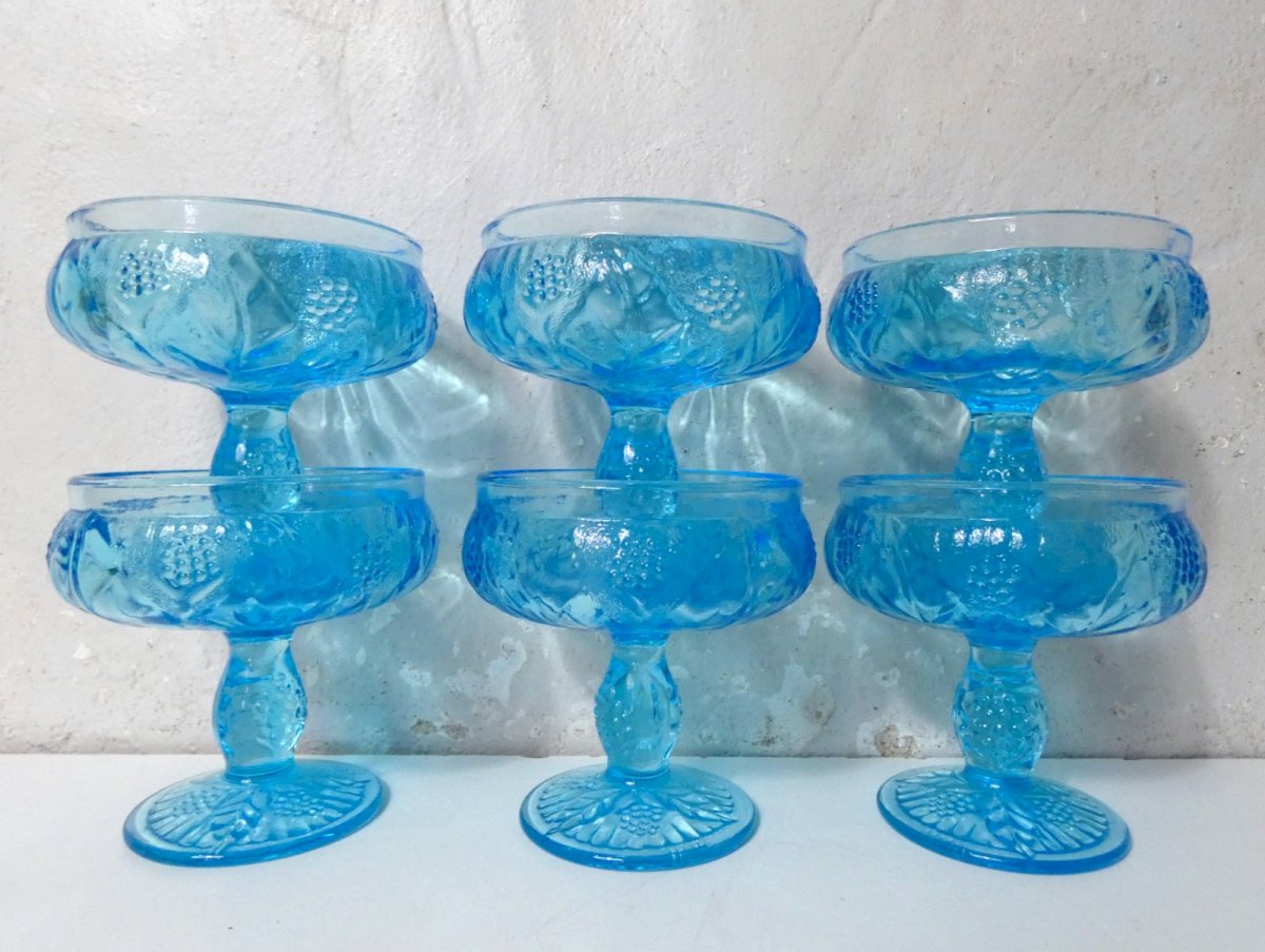 6 vintage dessert cups, on a pedestal, made of molded blue glass, from the Portieux Glassworks (France). Height 10 cm. Diameter: 10 cm. In perfect condition. A very intense blue that reflects light in a unique way.