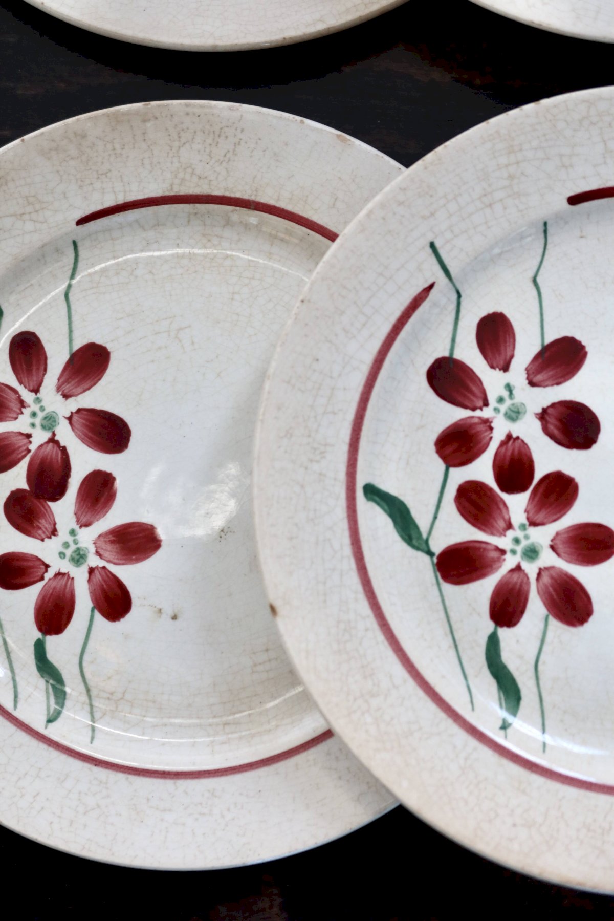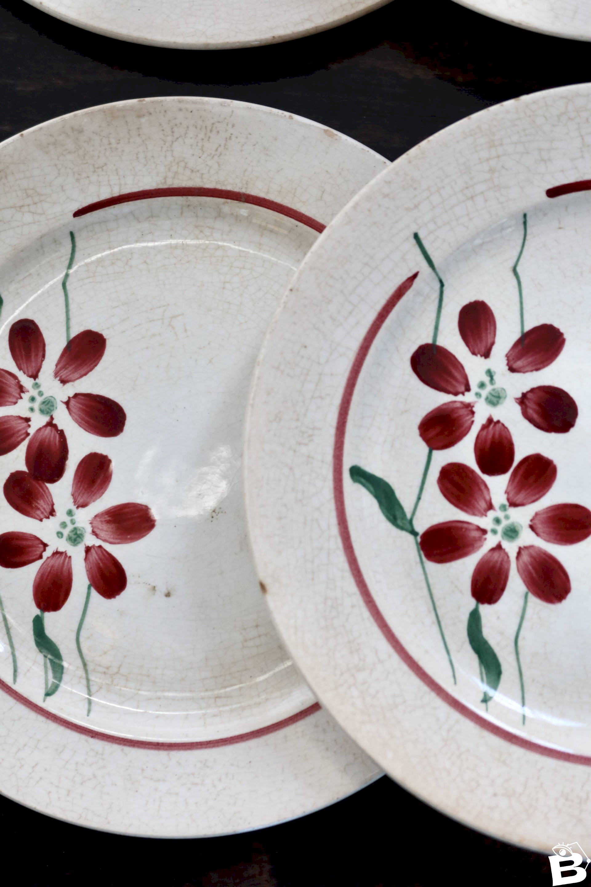 Ivoried plates with a lovely patina (email cracks, small marks, signs of wear over time), a harmonious and charming set for a country table. Coherent condition of use, possible discreet fleabites. Dimensions: 18cm in diameter. L: 18 W: 18 H: 1