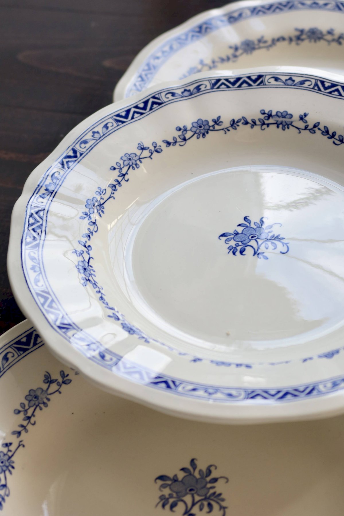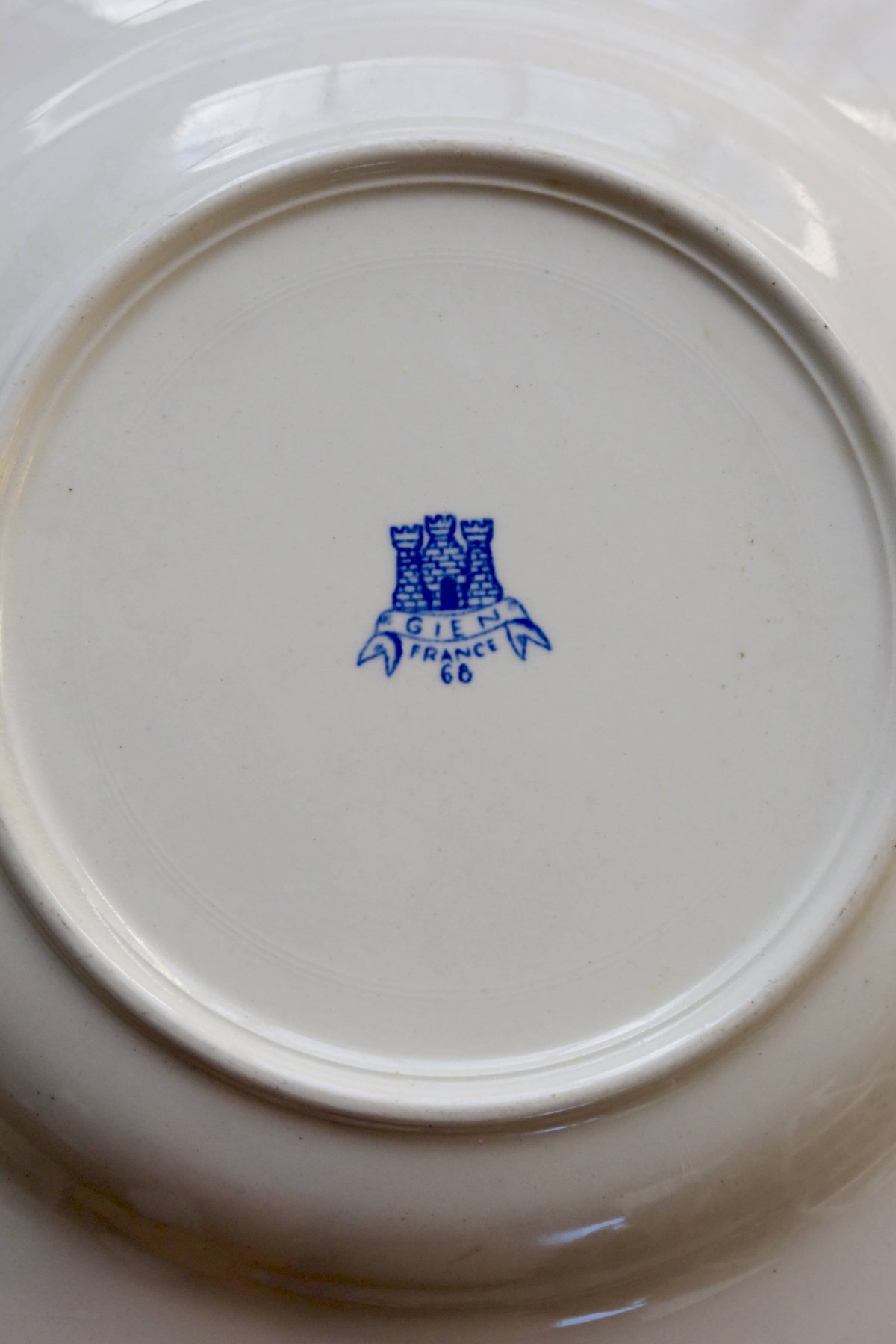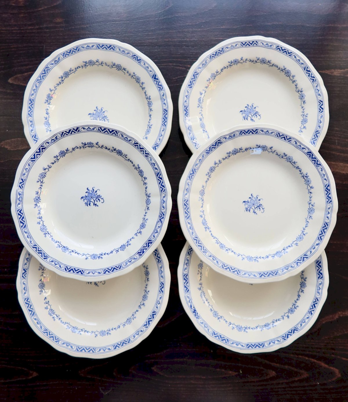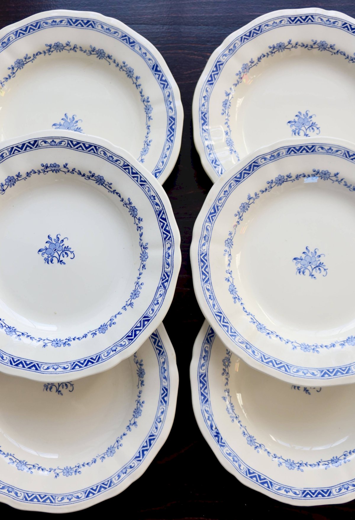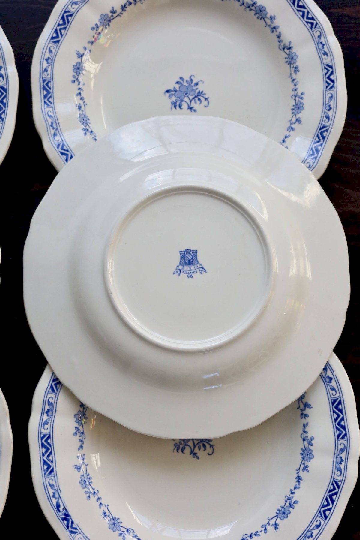 Set of 6 Gien deep plates – “Royal” model in ivory earthenware, with scalloped edge and double border: garland of small blue flowers and geometric band on the rim, matching central design. Overall condition excellent for an antique service, with only very slight signs of use and a few micro enamel points (nothing structural). Dimensions: 25.5 cm in diameter. L: 25 W: 25 H: 1